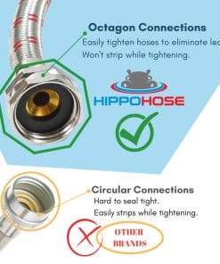 ¡Mantén seguro tu hogar y lavandería! ¡Estas son las únicas mangueras de lavadora de acero inoxidable en el mercado con una CONEXIÓN DE 90 GRADOS EN AMBOS EXTREMOS de la manguera! Las mangueras de lavadora HippoHose son universales para todas las marcas de lavadoras. A diferencia de las mangueras de todos los competidores, las mangueras de lavadora HippoHose tienen conexiones OCTAGONALES que permiten un AJUSTE FÁCIL Y SEGURO para garantizar un sellado hermético y SIN FUGAS. Las mangueras de competidores tienen una conexión circular que se desgasta fácilmente y hace que sea difícil obtener un sellado apretado. Las mangueras de lavadoras Hipphose también vienen con Arandelas de Goma Extra Gruesas para combatir cualquier posible fuga. Ninguna otra manguera de lavadora se compara en calidad con HippoHose. La función codificada por colores facilita que los propietarios o contratistas identifiquen qué manguera es cuál.