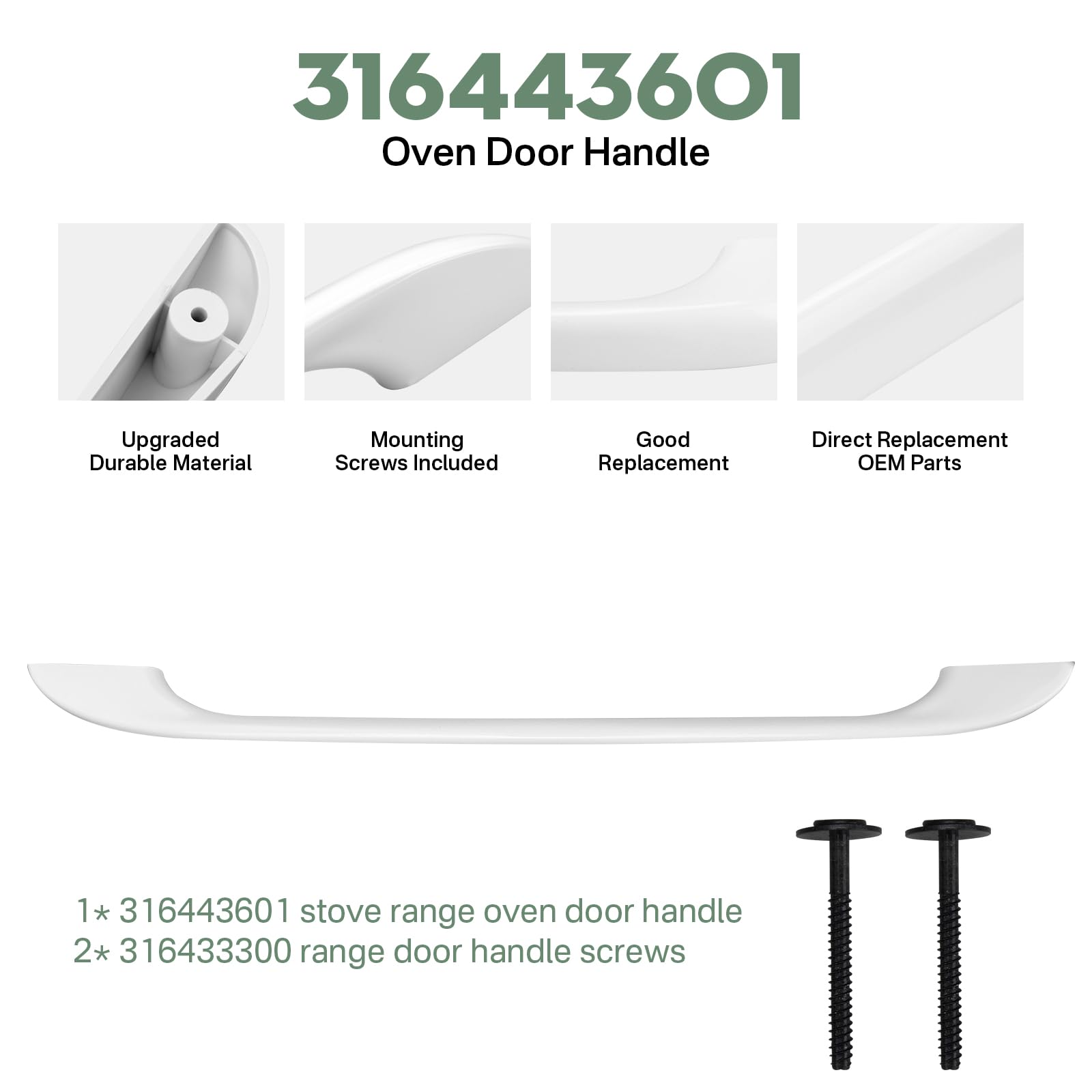 3. Por favor, revise cuidadosamente la marca y número de modelo antes de comprar. Si no está seguro de si la manija de horno 316443601 es compatible, ¡avísenos y le ayudaremos! Paquete incluye 1 manija de puerta de horno 316443601, 2 tornillos 316433300.