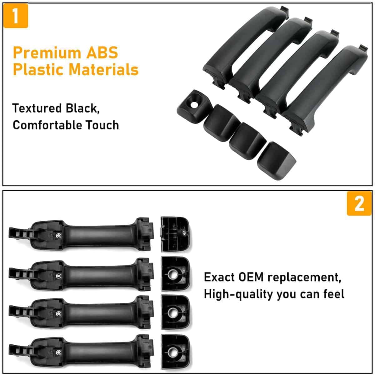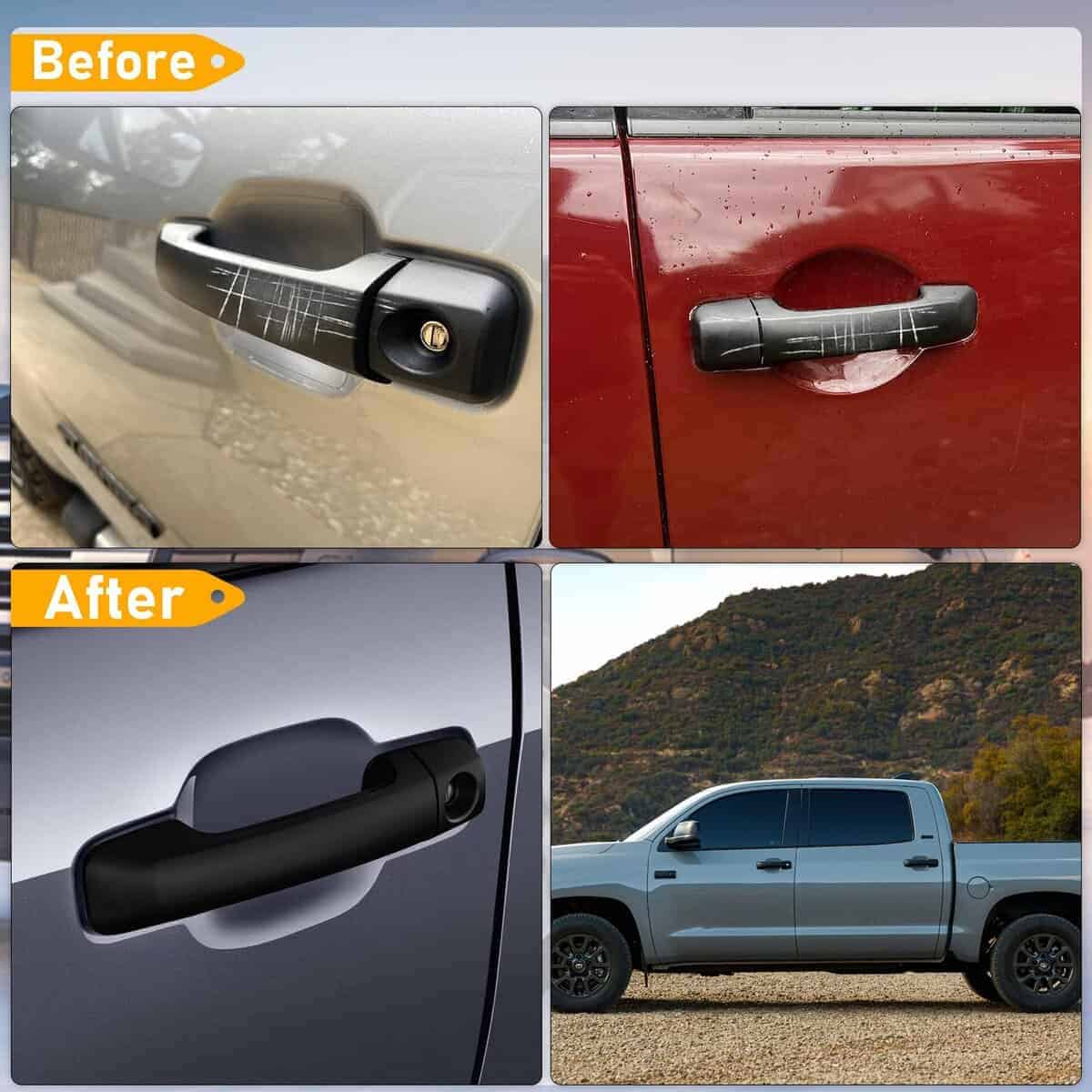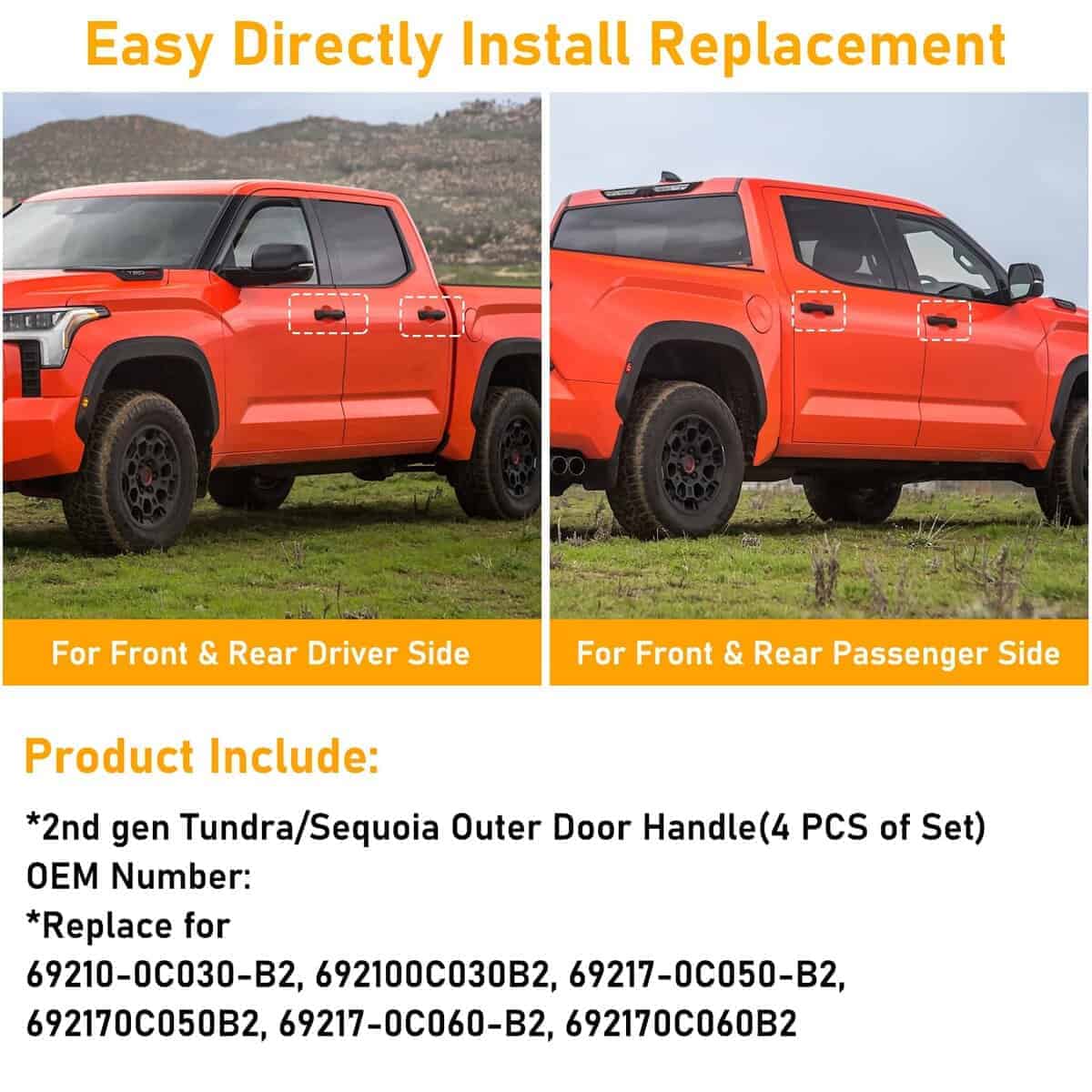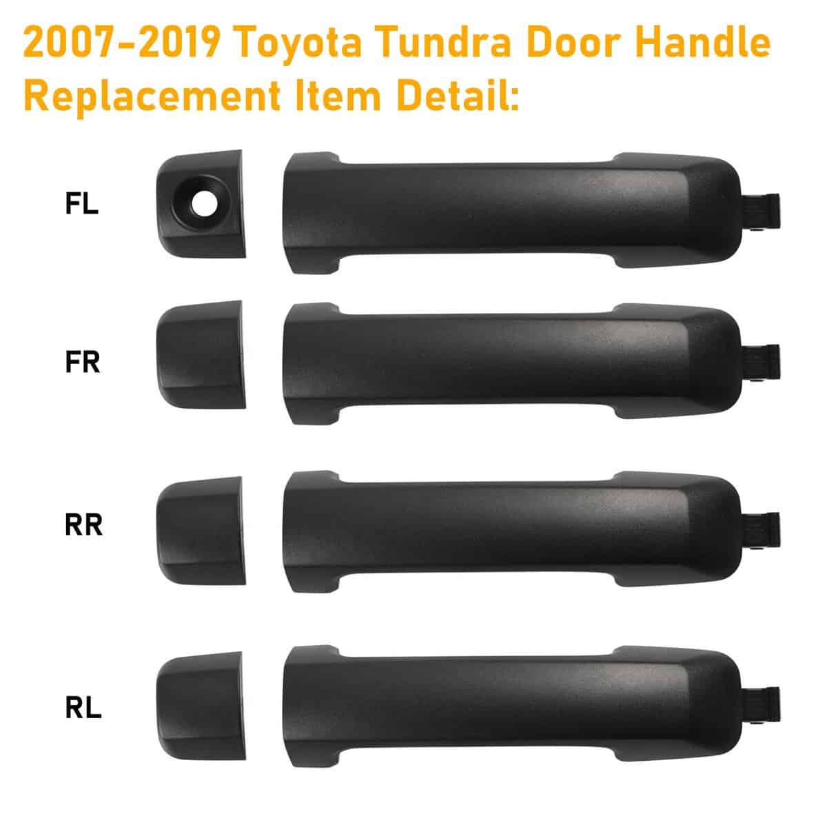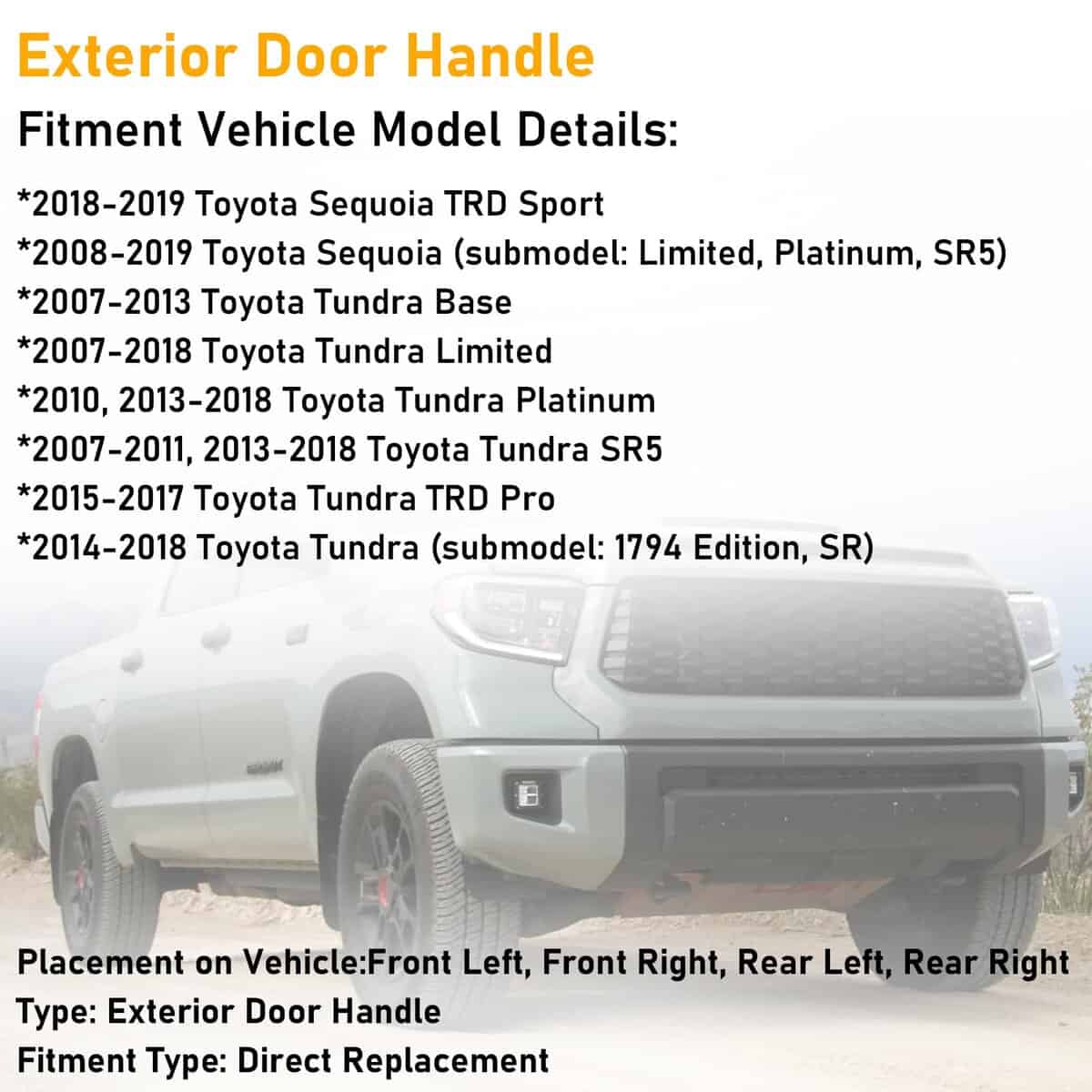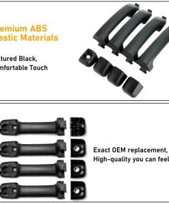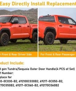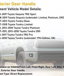 1. Se adapta perfectamente a la manija de puerta negra APESER Compatible con Toyota Tundra 2007-2019, 4 paquetes de reemplazo para la manija exterior de Tundra y Sequoia. Por favor, verifique los vehículos compatibles en la imagen antes de realizar la compra. 2. Excelente reemplazo para restaurar la funcionalidad de la puerta de su automóvil. Diseñado según los datos originales de la manija de la puerta del automóvil. Cada reemplazo de manija de la puerta exterior está hecho según las especificaciones de fábrica para verse y funcionar igual que el original. 3. Manija exterior de Tundra 2017 construida con materiales duraderos, acabado negro de alta calidad y bisel para una larga vida útil. El color negro combina fácilmente con todos los colores de puertas exteriores. 4. Instalación fácil. Compatible con Toyota Tundra 2007-2019, manija de puerta exterior izquierda/lado delantero trasero del conductor y derecha/lado delantero trasero del pasajero. Alternativa excelente a las piezas del concesionario OEM. 5. Incluye 4 paquetes de manijas exteriores texturizadas negras para Tundra y Sequoia 2007-2019.