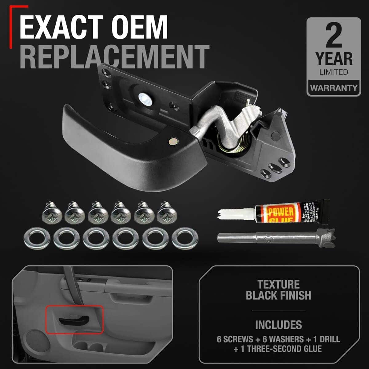 Manija de puerta interior delantera del pasajero T1A – Compatible con Chevrolet Avalanche Cheyenne Silverado Suburban 2007-2014; GMC Sierra Yukon XL; Cadillac Escalade – Negro Texturizado – OEM 20833602. Esta manija de puerta interior es un reemplazo OEM directo que coincide con el número de parte OEM 20833602, asegurando un ajuste preciso y una funcionalidad óptima para las puertas delanteras y traseras derechas (lado del pasajero) de su vehículo. Compatible con una variedad de modelos de Chevrolet, GMC y Cadillac, este producto ha sido diseñado para brindar mayor funcionalidad y una estética interior consistente. Fabricada con plástico de alta calidad y acabado negro texturizado, esta manija de puerta ofrece durabilidad y una apariencia elegante. Diseñada para una instalación fácil, esta manija de puerta interior permite un proceso de reemplazo rápido y sencillo. Orgullosamente operado y propiedad de americanos en Detroit, MI, brinda un excepcional soporte al cliente estadounidense para su tranquilidad.