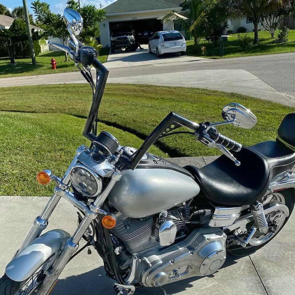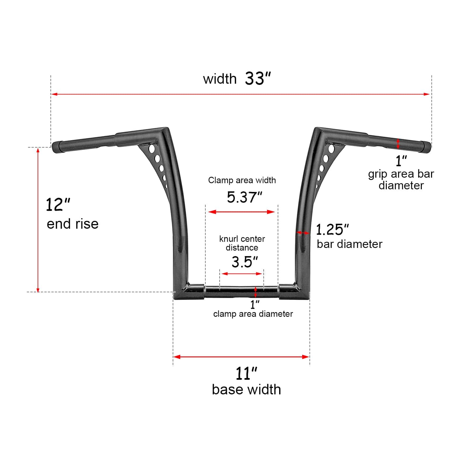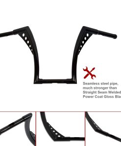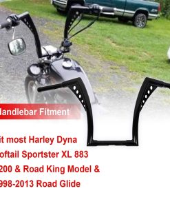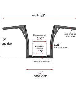 Especificaciones: Diámetro del Manillar: 1-1/4 pulgadas Ancho Central: 10-1/2 pulgadas, Ancho del Área de Sujeción: 5.9 pulgadas y Diámetro: 1 pulgada Diámetro del Área del Agarre: 1 pulgada Pre-Perforado: Sí Elevación Final: 12 pulgadas Acabado: Recubrimiento en Polvo Negro Brillante Material: Tubo de acero (Mucho más resistente que otros manillares de tubo soldado recto en el mercado) Modelo: Monkey Bagger Bar Ancho Total: 35.5 pulgadas Retroceso/Inclinación: 8 pulgadas Lista de Compatibilidad: Compatible con la mayoría de Harley Dyna Softail Sportster XL 883 1200, Road King modelos 1994-2022 y Road Glide 1998-2013. No compatible con Harley Electra Glide, Street Glide y Road Glide 2014 en adelante. No compatible con Harley Cross Bones FLSTSB 2008-2011 con puntales OEM