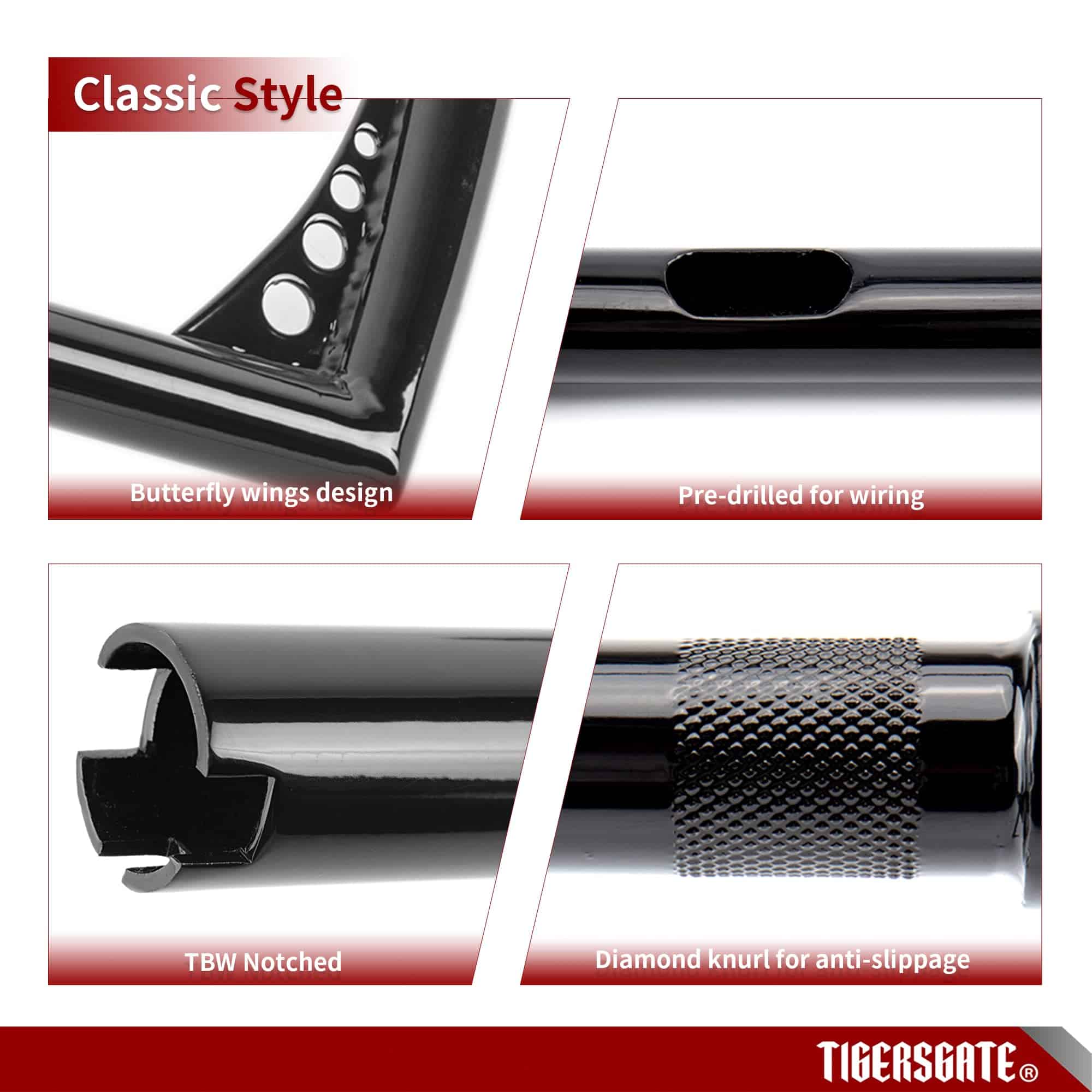 2. Estilo clásico: La subida de 12″ y el diseño en Z de nuestro manillar le dan a tu paseo un aspecto atemporal y clásico que seguro llamará la atención. El ancho de montaje es de 5 3/8 pulgadas y el diámetro del tubo es de 1.25″, la sección central se estrecha a 1″ para que los controles estándar del manillar encajen. Ya seas un motociclista experimentado o un nuevo entusiasta, nuestro manillar seguramente mejorará tu experiencia de conducción y hará que tu moto destaque entre la multitud.
