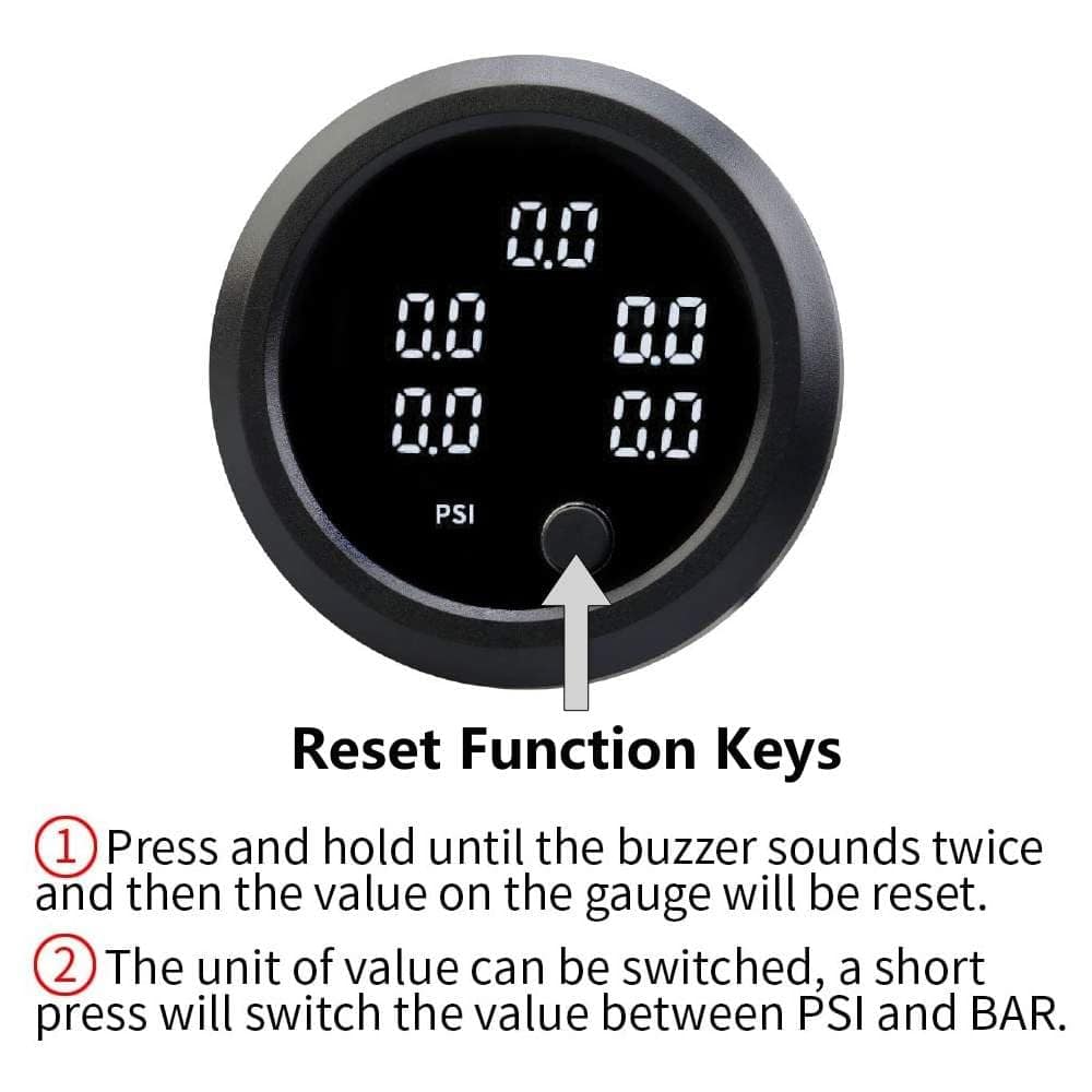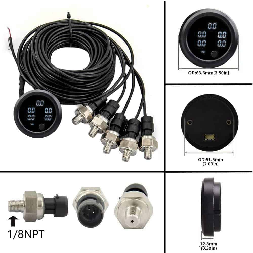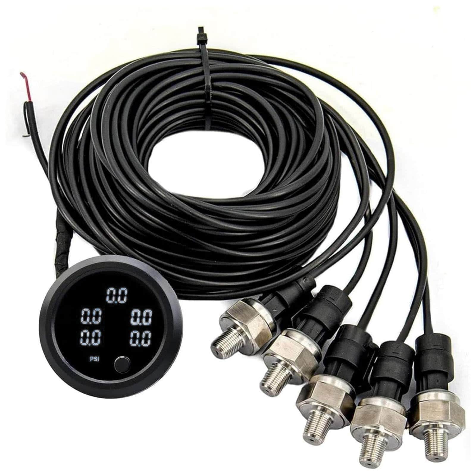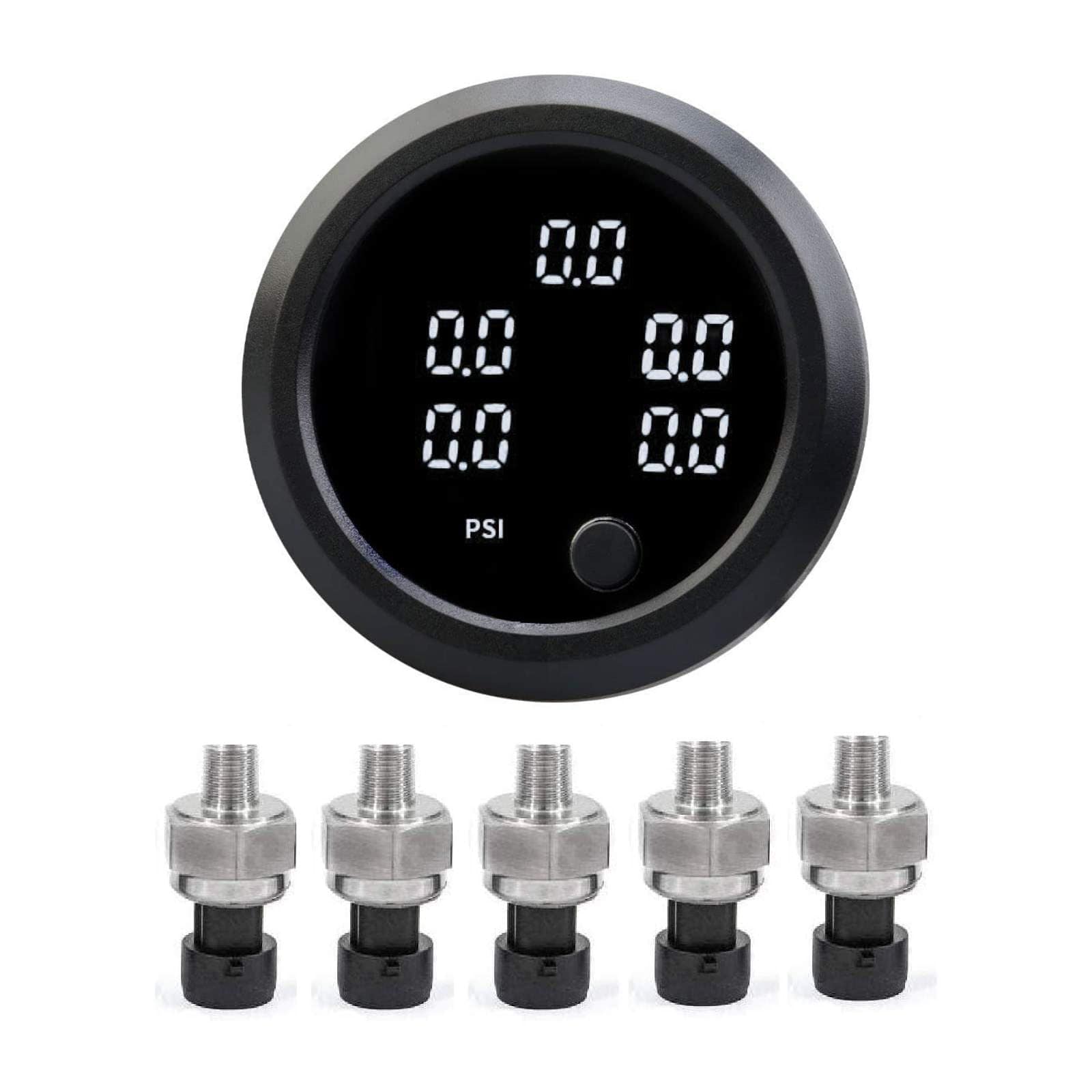 El manómetro de presión de aire de suspensión para automóvil ZHSYMX de cinco displays blancos de 2 pulgadas 52mm es una herramienta perfecta para monitorear las lecturas de las bolsas de aire de su vehículo. Con una visualización mejorada que incluye un display LED central brillante para una mejor legibilidad. El paquete incluye 1 manómetro, 5 sensores electrónicos, paquete de tornillos e instrucciones de instalación.