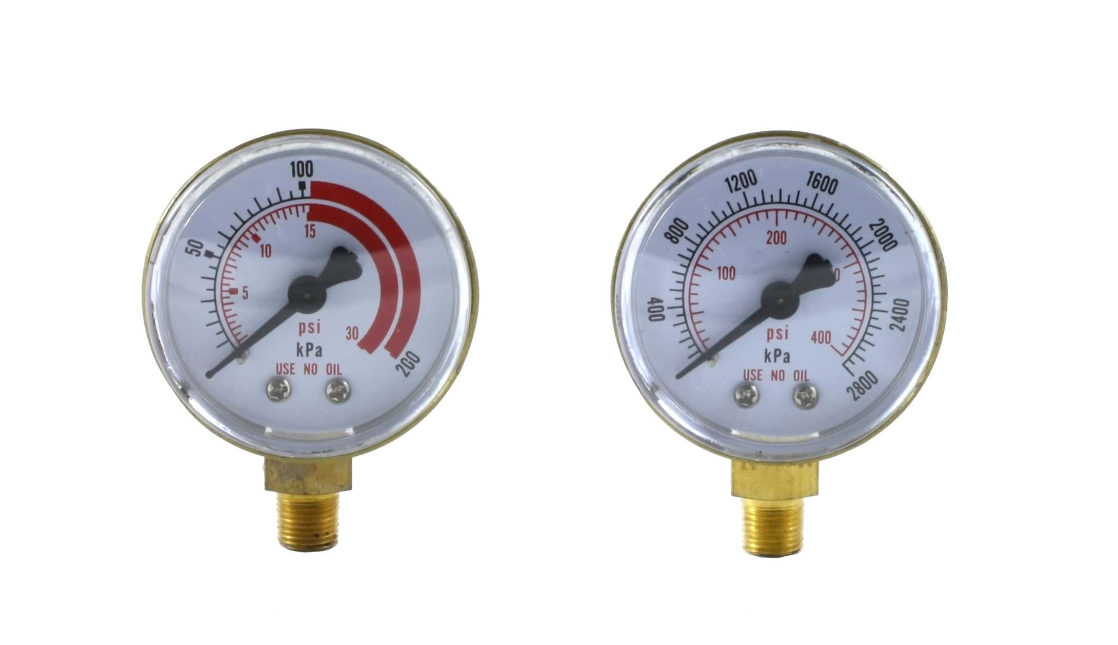 Manómetros de baja y alta presión para regulador de propano. Incluye un manómetro de 0-400 psi y un manómetro de 0-40 psi para regulador de Propano/Propileno/GLP. La esfera de 2 pulgadas es fácil de leer en unidades de presión PSI y KPA. Cuenta con una caja de acero y una construcción resistente. El conector de entrada inferior de 1/8″ NPT se adapta a reguladores pequeños utilizados en kits portátiles de Oxígeno-combustible.