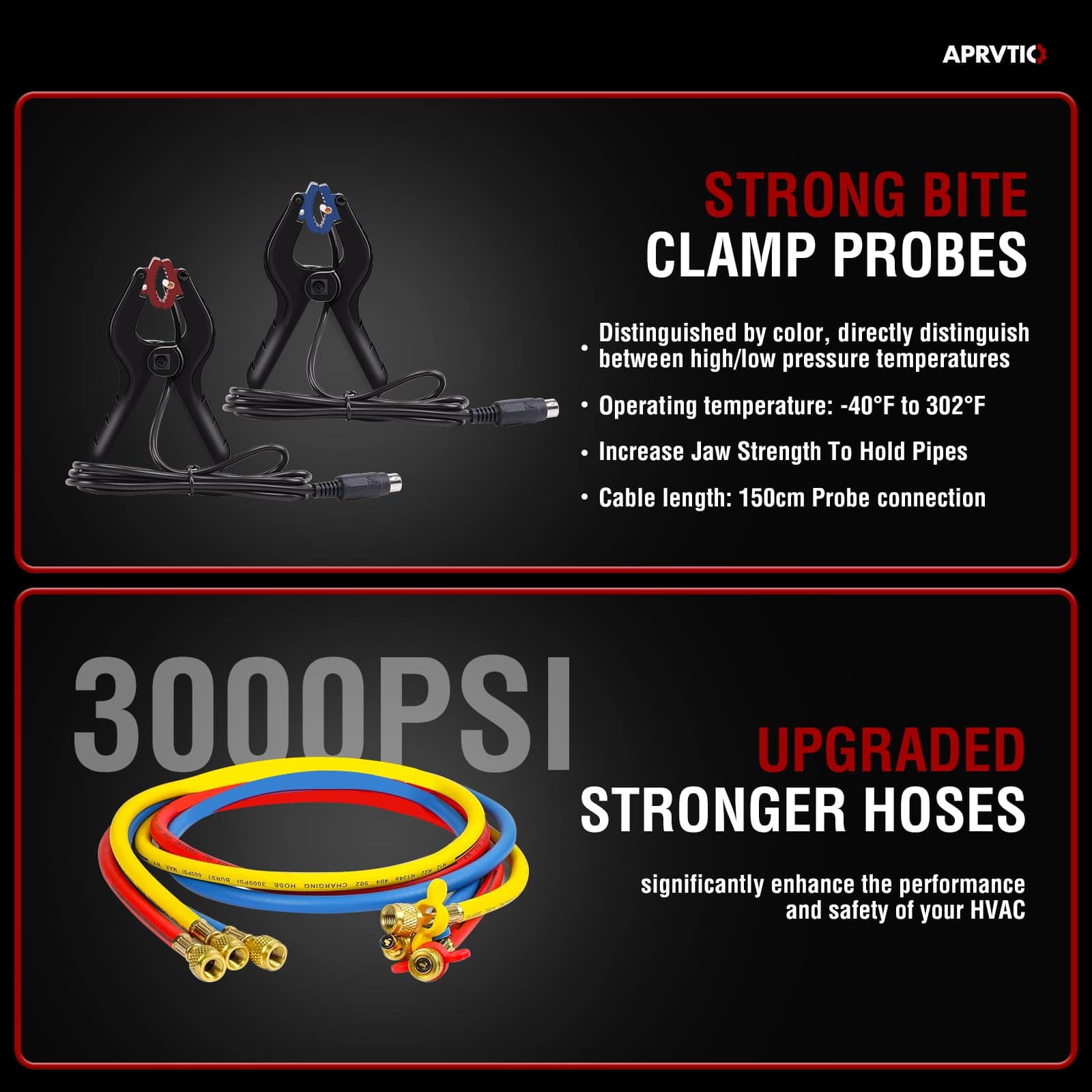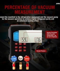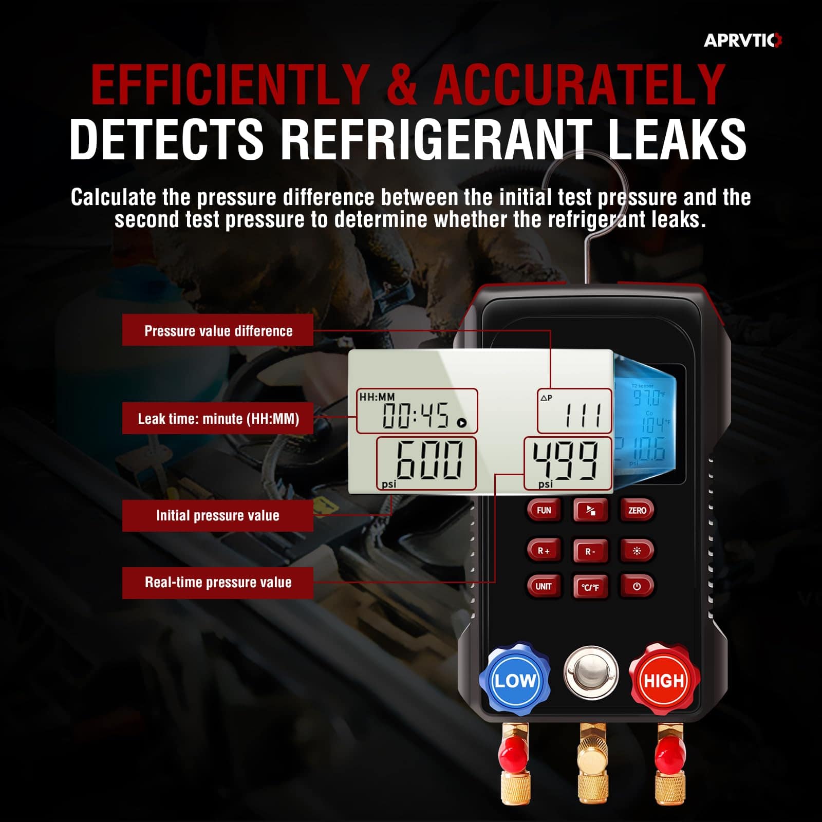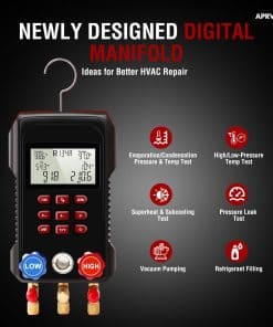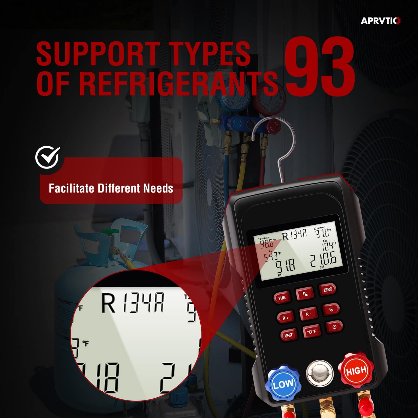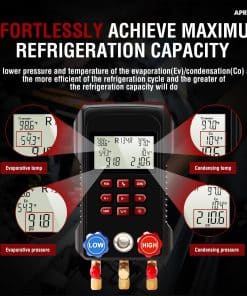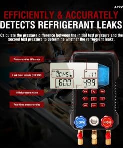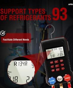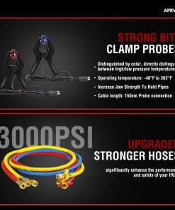 Los manómetros HVAC Aprvtio AMF-300 ofrecen una amplia gama de funciones avanzadas y de alta calidad para satisfacer las necesidades de profesionales en el campo de los sistemas de calefacción, ventilación y aire acondicionado. El manómetro digital de presión puede medir la presión doble al mismo tiempo, así como la medición de temperatura dual, cálculo de sobrecalentamiento y subenfriamiento. Además, el manómetro puede realizar pruebas de medición del porcentaje de vacío, medición de fuga de presión y grabar la velocidad de tiempo de fuga. Con una construcción robusta y duradera, estos manómetros HVAC utilizan una carcasa resistente de alta calidad y un diseño de silicona antideslizante para garantizar su longevidad en condiciones de trabajo exigentes. La pantalla digital inteligente con retroiluminación LCD facilita la lectura de los datos en cualquier entorno. La pinza de temperatura de dos colores facilita la identificación de la temperatura de alta y baja presión, mientras que la manguera de aire de 3000 Psi garantiza un sellado óptimo y una larga vida útil. Además, el juego de manómetros incluye una base de datos integrada con 93 tipos de refrigerantes para una fácil configuración y seguimiento del estado de carga. En resumen, los manómetros HVAC Aprvtio AMF-300 son una herramienta imprescindible para los profesionales de la industria automotriz y de calefacción y refrigeración.