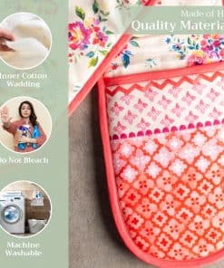 Manopla doble fabricada con 100% algodón acolchado para una resistencia al calor superior y durabilidad. Ofrece un agarre suave y flexible y protege tus manos durante el horneado, asado o parrillado. Diseño único con hermosos motivos europeos y colores vibrantes que realzan el estilo de tu cocina. Con bucle para colgar integrado, lo que facilita su almacenamiento y acceso. Lavable a máquina con colores similares, no usar lejía. Secar en secadora a baja temperatura y planchar tibio si es necesario. Este producto está diseñado para mantener su suavidad, color y cualidades protectoras incluso después de un uso repetido. Nota importante de seguridad: Mantener alejado del fuego. Utilizar este producto con extrema precaución al manipular utensilios calientes para proteger tus manos. Si sientes que el artículo está demasiado caliente, toca el artículo con cautela con este producto para evaluar la temperatura antes de manipularlo.