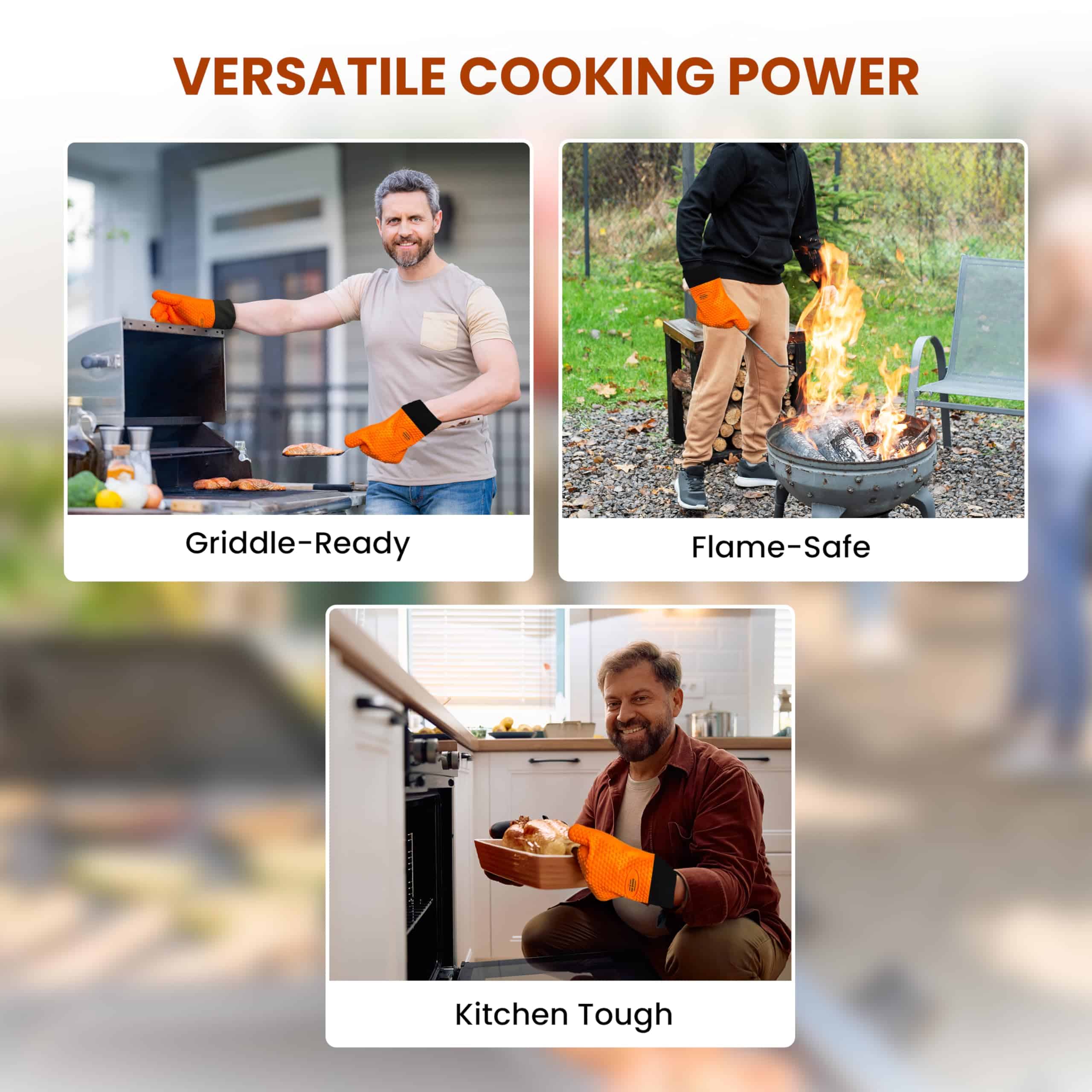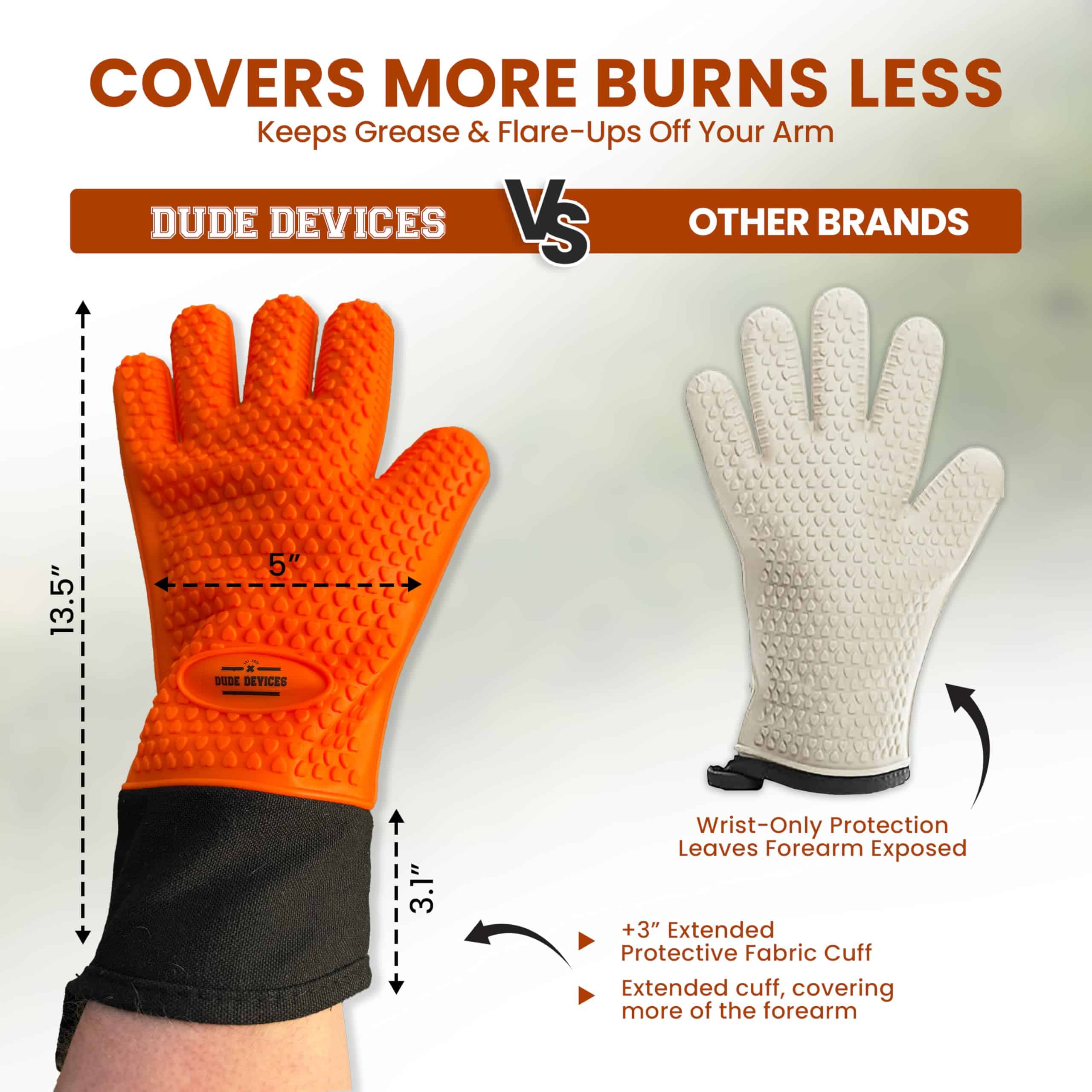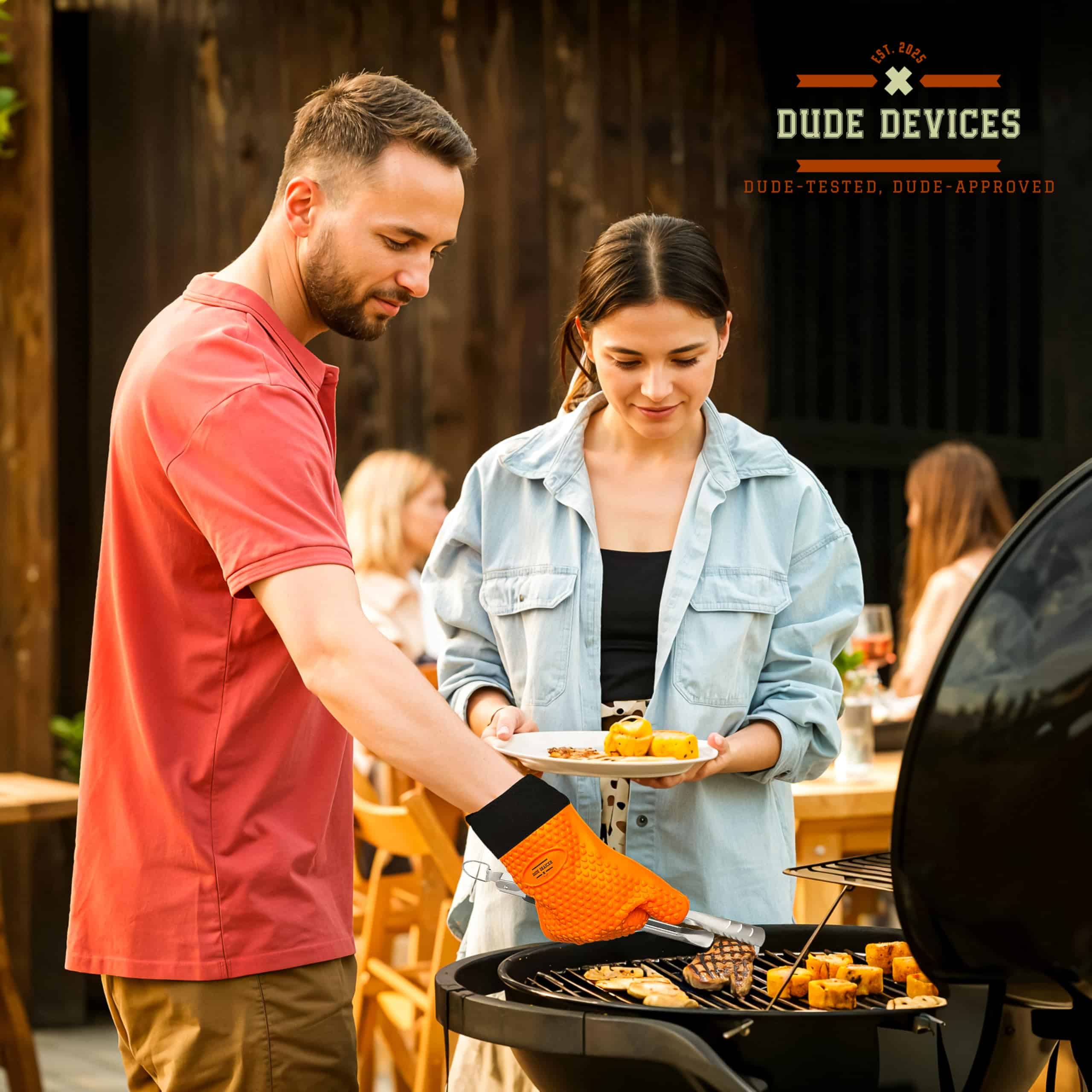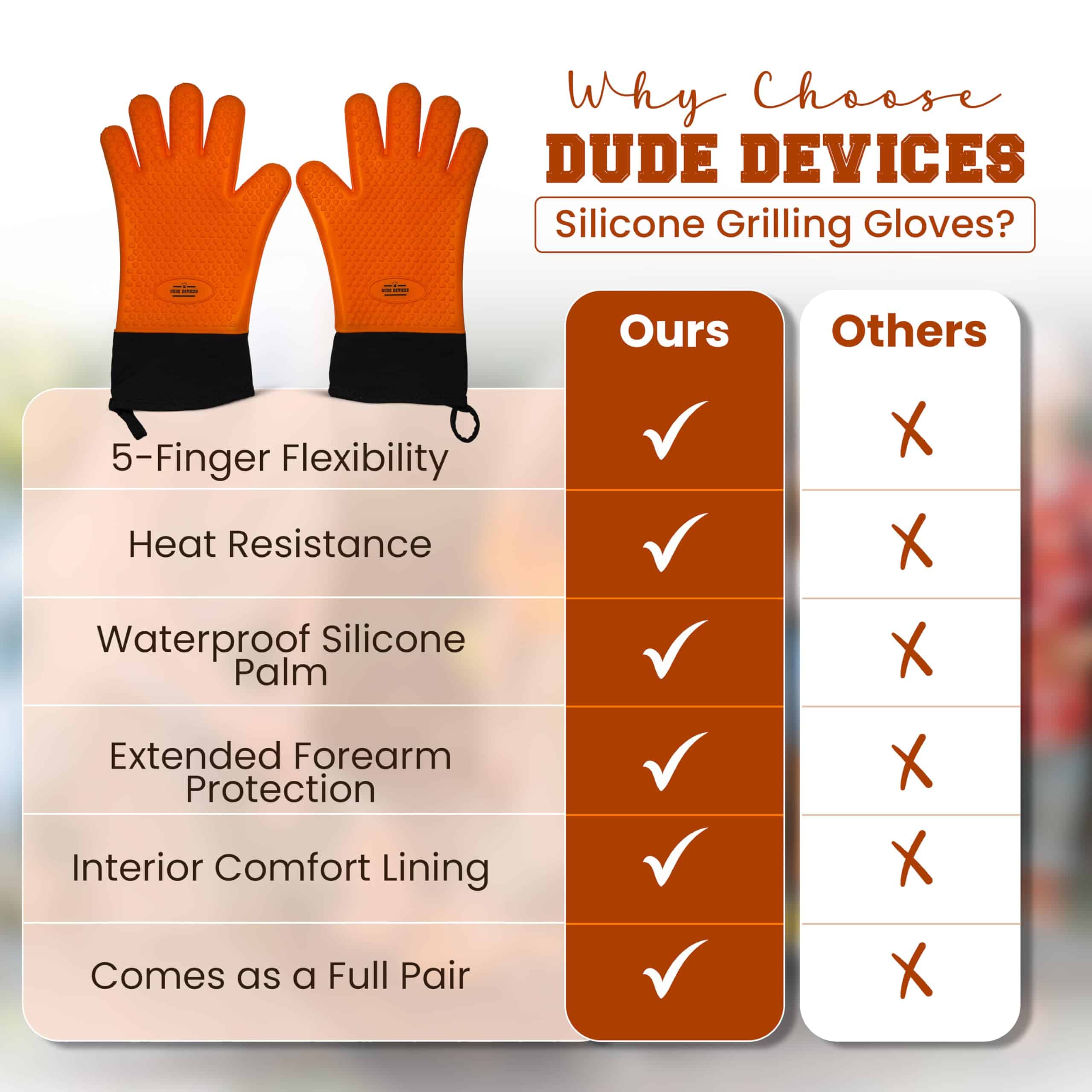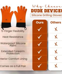 Manoplas de Horno/Barbacoa de Silicona de Dude Devices: ¡Probados por Dudes, Aprobados por Dudes! Mejora tu experiencia en la parrilla y cocina con las Manoplas de Horno/Barbacoa de Silicona de Dude Devices, diseñadas para aquellos que exigen resistencia al calor, flexibilidad y durabilidad. Hechas de silicona premium al 100%, estas manoplas son una adición esencial a tu equipo de parrilla Blackstone, Pit Boss o BBQ en el patio trasero. Diseñadas para resistir el calor de hasta 500 F, proporcionan una protección superior al manipular alimentos calientes, parrillas de la parrilla, sartenes de hierro fundido y llamas abiertas. A diferencia de las manoplas de silicona rígidas que limitan el movimiento, nuestro diseño ultraflexible de 5 dedos permite una mayor destreza y agarre, haciendo que se sientan como una extensión de tu mano. Ya sea que estés dando vuelta a los filetes, levantando un falda, o manipulando vegetales delicados, estas manoplas te brindan un control completo. La superficie texturizada antideslizante asegura un agarre seguro, evitando accidentes durante la parrilla o horneado. Diseñadas para uso tanto en interiores como en exteriores, estas manoplas no son solo para asados. Úsalas en la cocina para hornear, freír, freír al aire y manejar utensilios calientes. Su protección extendida para la muñeca añade una capa adicional de seguridad, protegiendo contra el calor, salpicaduras de grasa y llamaradas inesperadas. La limpieza es sencilla, solo lávalas como tus manos. La superficie impermeable y antiadherente asegura una limpieza rápida, haciéndolas más convenientes que los tradicionales guantes de cocina de tela. A diferencia de las alternativas voluminosas, estas manoplas proporcionan el equilibrio perfecto entre comodidad, protección y usabilidad. Seleccionadas a mano, probadas y aprobadas por Dude Devices, estas manoplas cumplen con nuestros altos estándares de rendimiento y fiabilidad. Ya sea que seas un maestro asador profesional o un parrillero de fin de semana, estas manoplas son una herramienta imprescindible. Lleva tu parrilla al siguiente nivel ¡ordena tus Manoplas de Horno/Barbacoa de Silicona de Dude Devices hoy mismo!