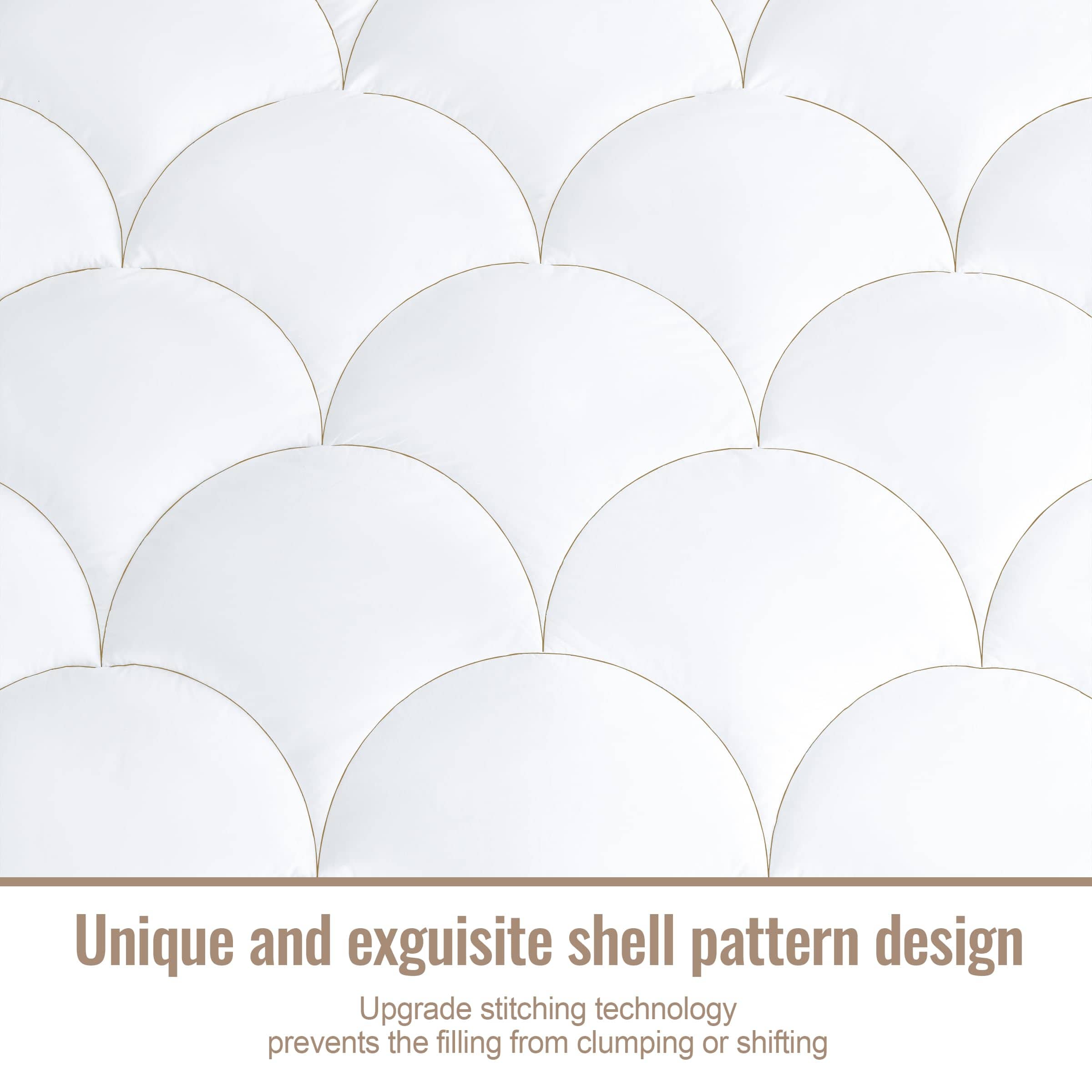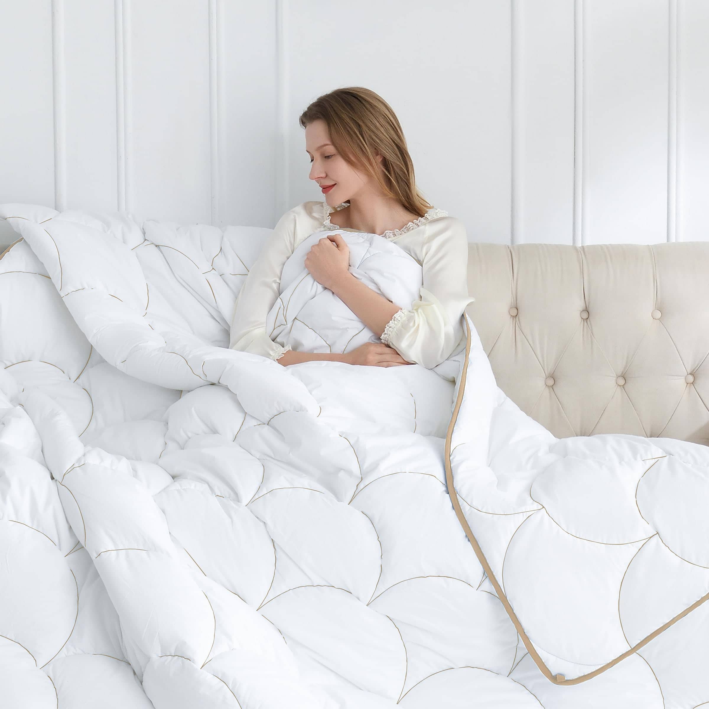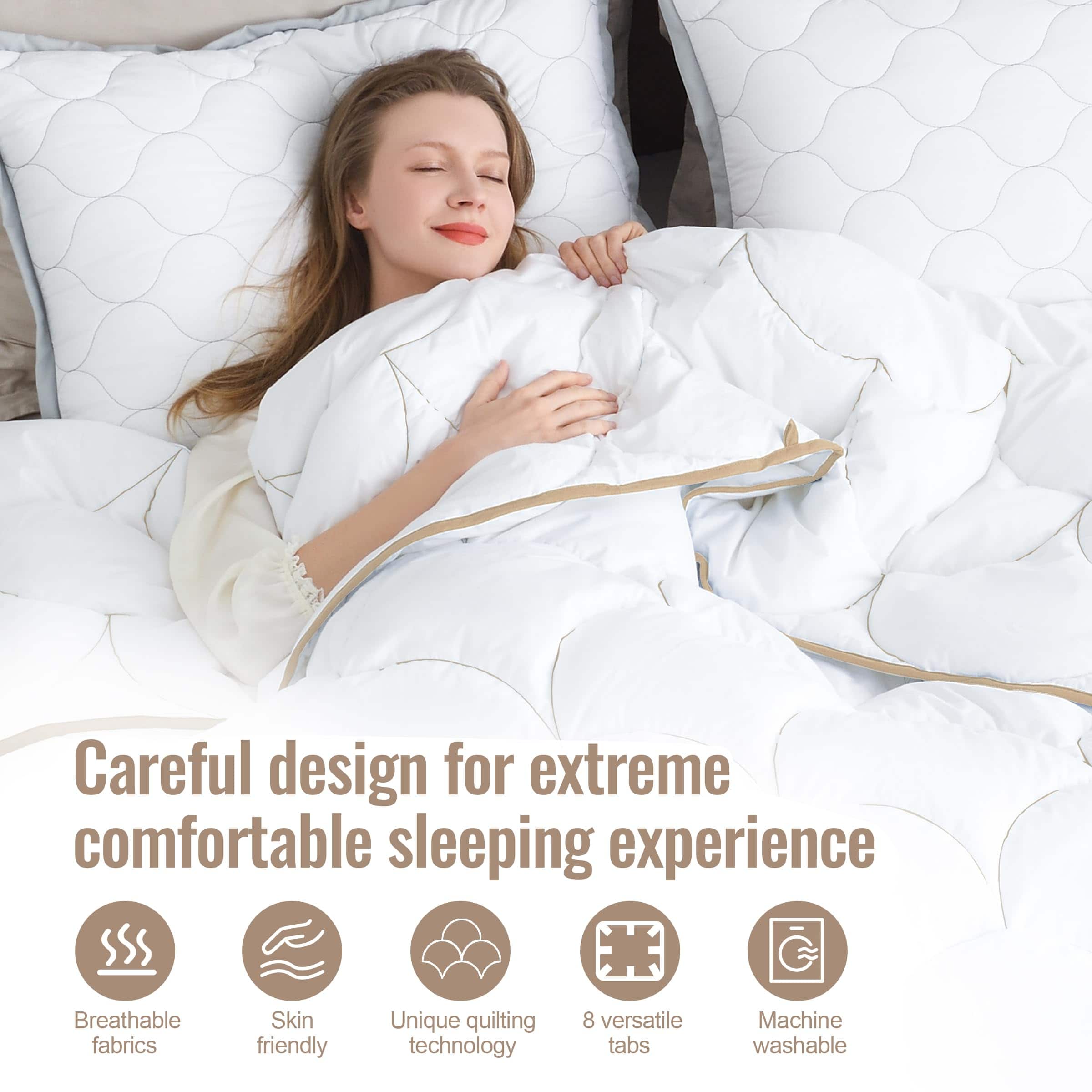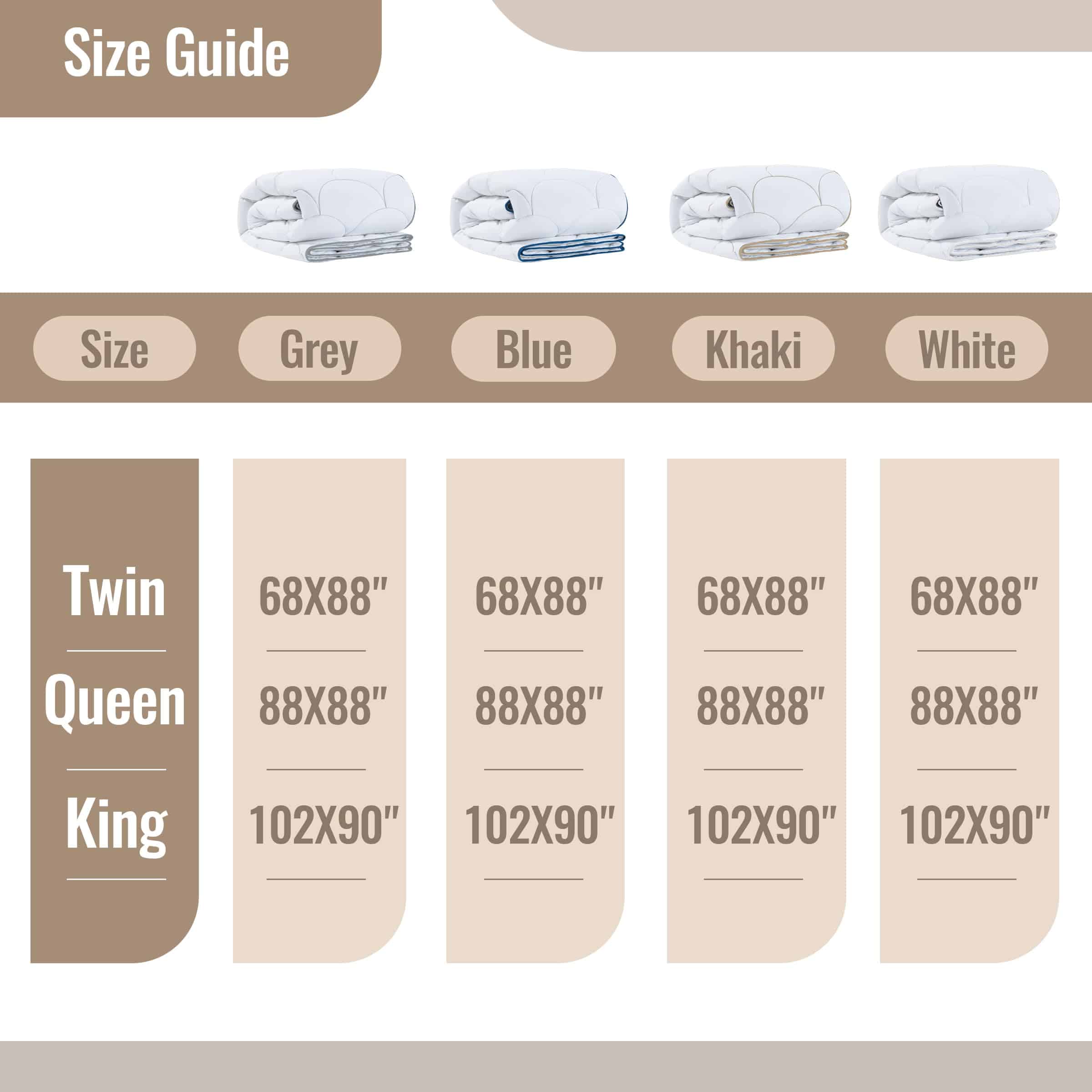 Manta de fibra alternativa de plumón Glaciman en tamaño King para cama, ideal para todas las estaciones. Esta manta blanca con ribete caqui está hecha con una tecnología de procesamiento única de piel de durazno que la hace extraordinariamente suave y cómoda. Con una exquisita artesanía y una tecnología de pespunte mejorada, la manta es transpirable y duradera, sin rasgaduras ni olores. El proceso de acolchado de concha único no solo embellece la manta, sino que también la hace funcional al prevenir que el relleno se agrupe o se desplace. Esto garantiza una distribución uniforme del relleno, manteniéndolo en su lugar y maximizando el calor y la comodidad. El diseño de ribete añade durabilidad y belleza a la manta. Tiene 8 pestañas en las esquinas para facilitar la conexión entre la manta y la cubierta, permitiendo su uso como manta, edredón o inserción de edredón. La manta es lavable a máquina y apta para secadora. Se recomienda lavar en ciclo suave con agua tibia y secar a baja temperatura. Certificada por OEKO-TEX, es completamente segura e inofensiva, para que puedas disfrutar de un tiempo tranquilo y cómodo.