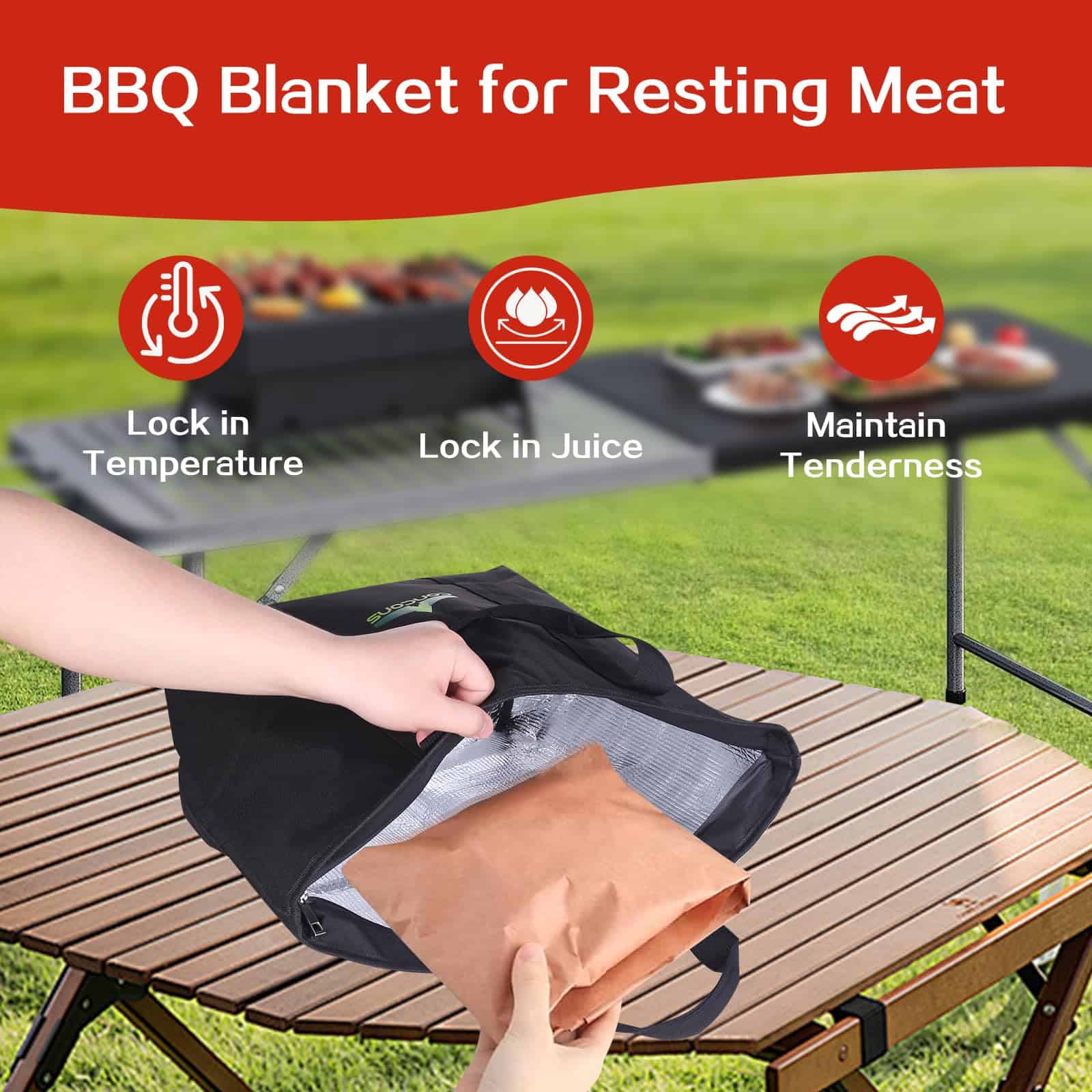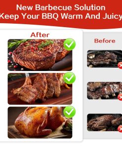 2. Manta de Reposo para Carne BBQ Esta manta de BBQ está diseñada para cocinar a baja temperatura y ahumado de carnes como brisket, paleta de cerdo, pavo, etc. Ayuda a mantener la temperatura de la carne durante el periodo de reposo posterior a la cocción, para que el jugo se distribuya de manera uniforme para una ternura y sabor óptimos.