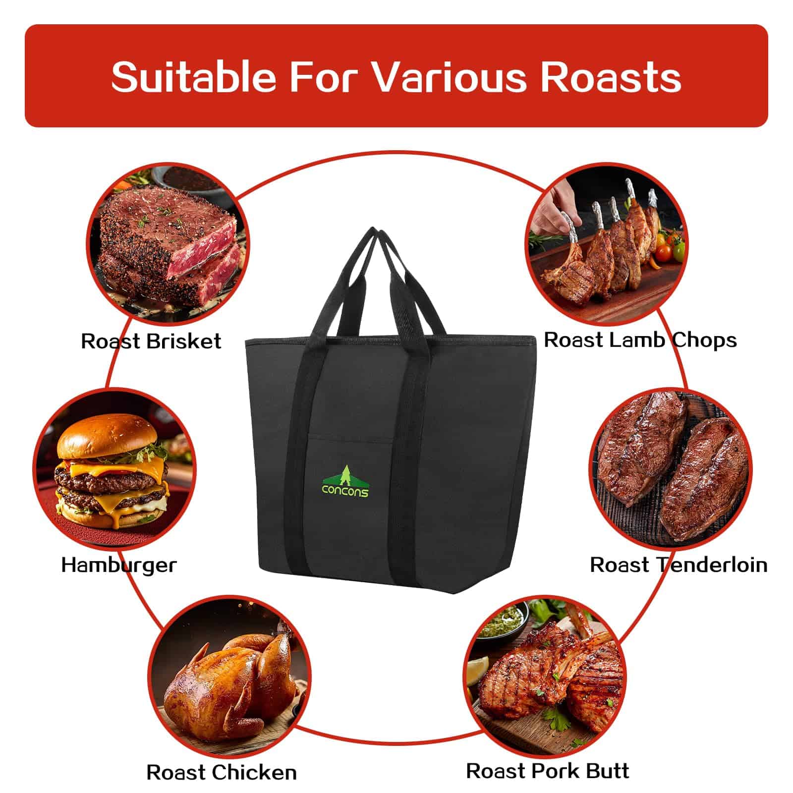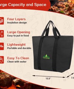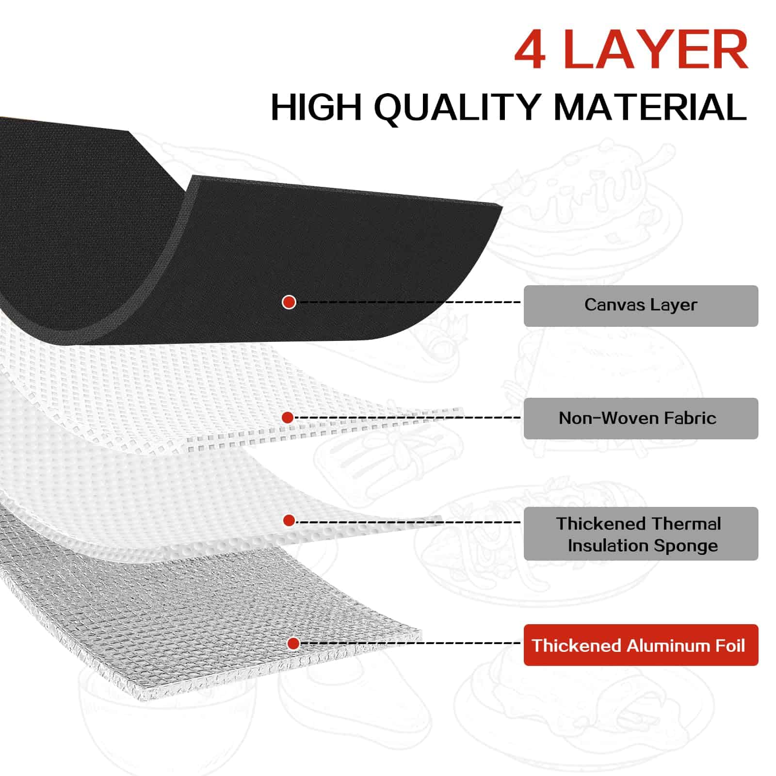 4. Aislamiento de Cuatro Capas Diga adiós a la carne seca y dura! Esta bolsa aislante utiliza un diseño de cuatro capas de aislamiento, que ayuda a mantener la temperatura ideal de los alimentos a la parrilla en comparación con el diseño ordinario de tres capas de aislamiento, y permite que la carne reabsorba la humedad durante el periodo de reposo para mantenerla tierna y jugosa. Es un accesorio de BBQ imprescindible para los entusiastas de la barbacoa.