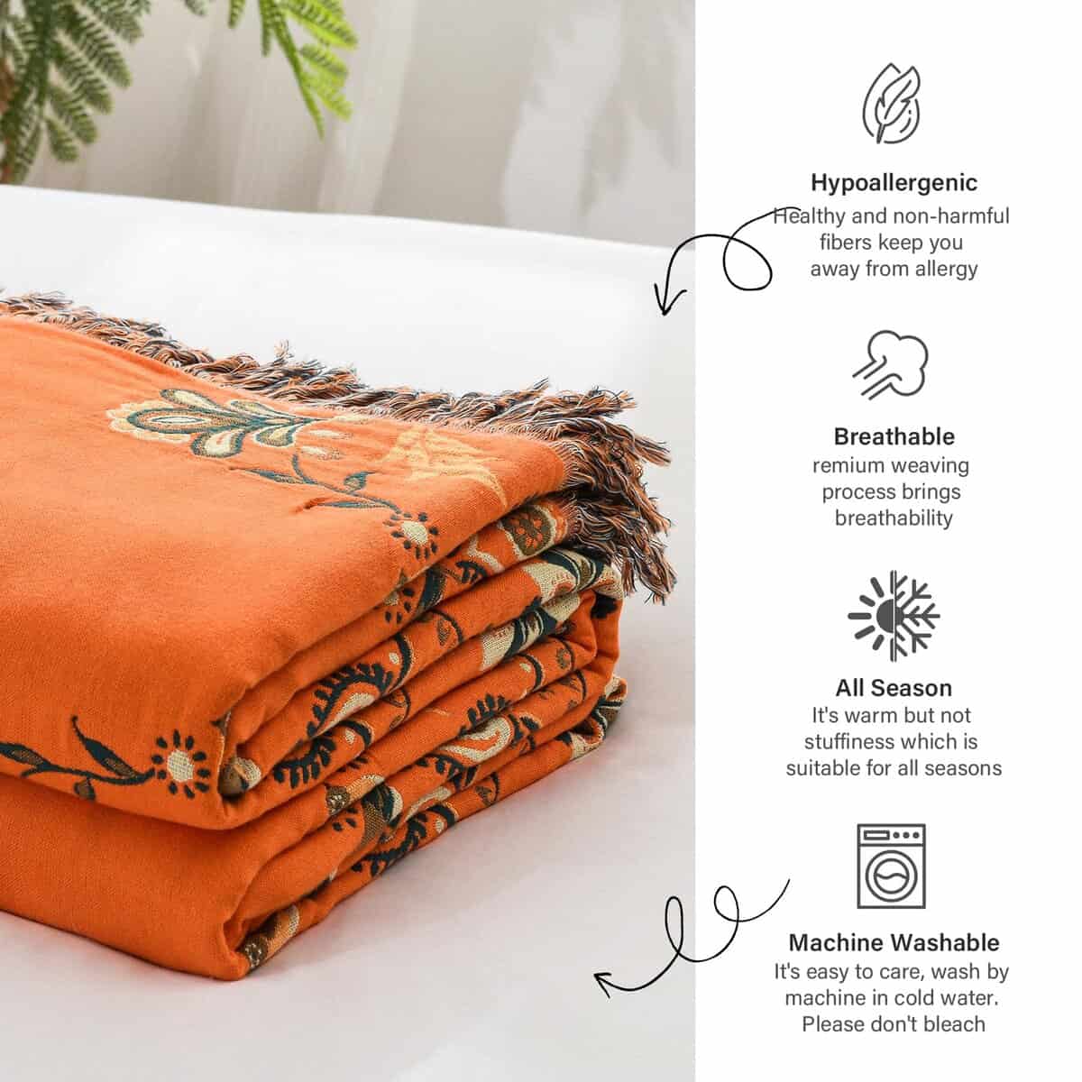 Esta manta boho de Y-PLWOMEN para sofá es la opción perfecta para aquellos que buscan una manta de alta calidad y con un diseño encantador. Fabricada con 100% algodón suave y transpirable, esta manta queen size es ideal para mantenerte fresco durante todas las estaciones del año. Su diseño de cuatro capas mejora la capacidad de aislamiento de la manta, convirtiéndola en la elección perfecta para personas que duermen calientes. La manta reversible presenta un diseño dual color con flores, creado con un proceso de jacquard de teñido de hilo que le confiere un aspecto llamativo y decorativo. El detallado diseño damasco muestra una combinación perfecta de estilo moderno y clásico, haciéndola una excelente opción para la decoración del hogar. Además, esta manta de algodón queen puede ser utilizada durante todo el año, proporcionando frescura en las estaciones más cálidas y calidez adicional en invierno. Su fácil cuidado hace que sea una manta conveniente y práctica, siendo lavable a máquina y manteniendo su calidad incluso después de múltiples lavados. Añade un toque de estilo bohemio a tu hogar con esta magnífica manta boho Y-PLWOMEN.