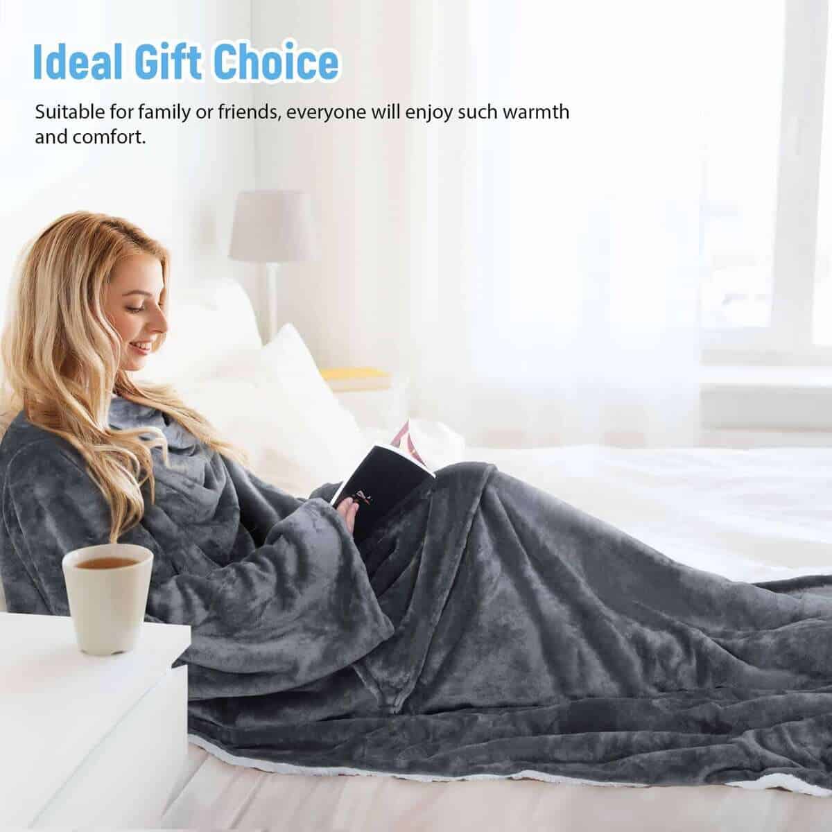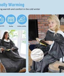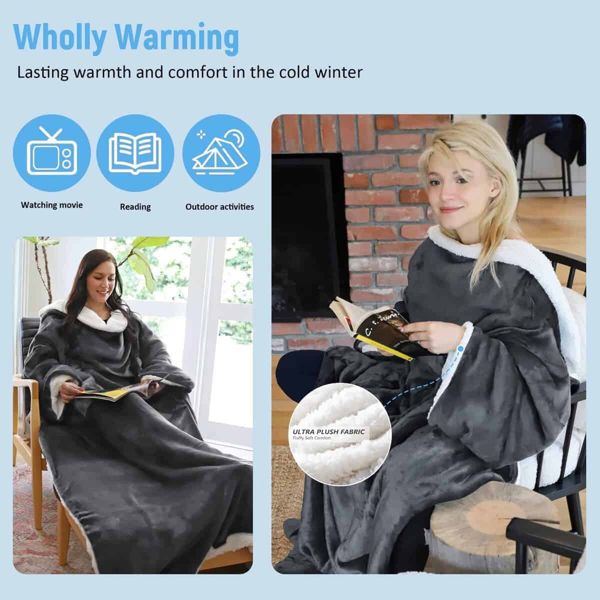 2. Esta Manta Sherpa con Mangas: Te ayuda a mantenerte cálido y cómodo de pies a cabeza al permitirte moverte libremente mientras lees, echas una siesta, ves la televisión o usas el teléfono.