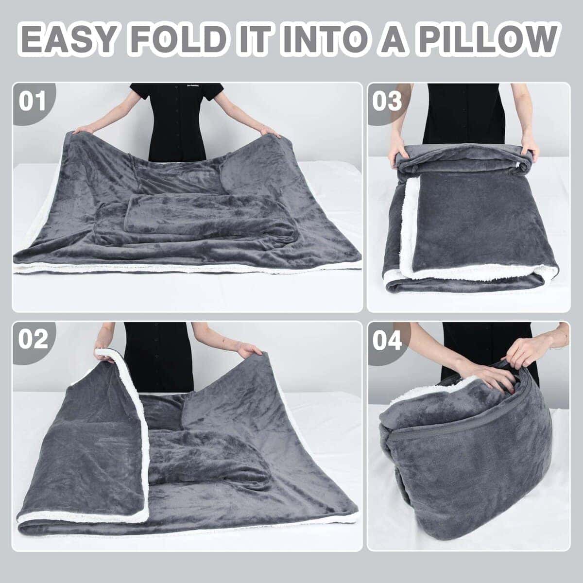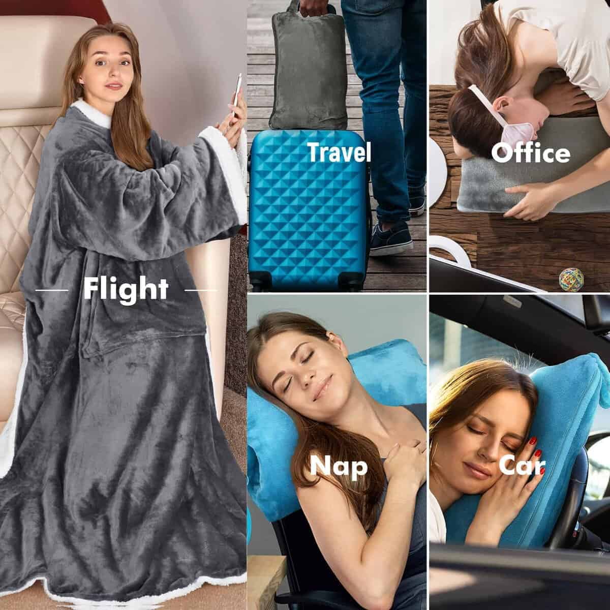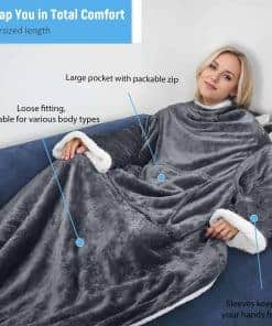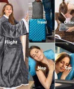 1. Manta con Mangas Abrazable: Diseño único con mangas y un bolsillo frontal. Las mangas cubren los hombros y los brazos, y la parte trasera está abierta. ¡Simplemente dobla la manta en el bolsillo con cremallera, ciérralo con la cremallera, y tendrás una almohada de viaje!.