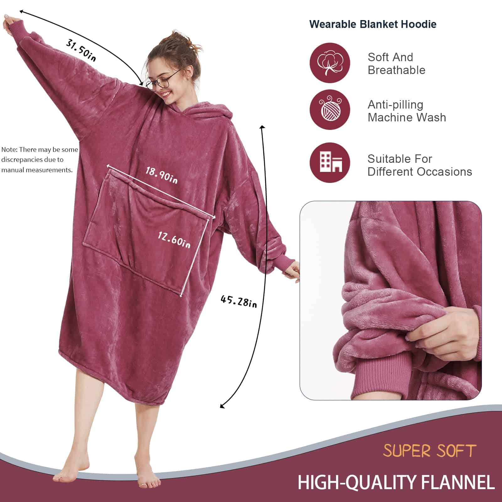 2. TALLA ÚNICA PARA TODOS Nuestro sudadera manta está diseñado tanto para mujeres como para hombres de casi todas las formas y tamaños. Tiene múltiples colores para que elija, como morado, morado claro, gris, gris claro, rosa, rosa claro, azul marino, turquesa y negro. La manta sudadera hecha de franela acogedora es tan amigable con la piel que la mayoría de las personas la aman. Puede comprarla para cada miembro de su familia y tomarse una foto de familia juntos.