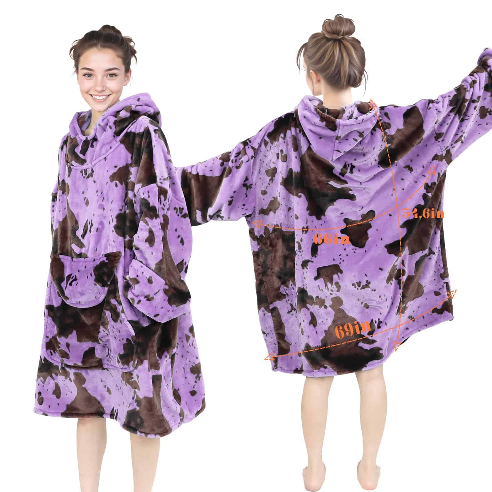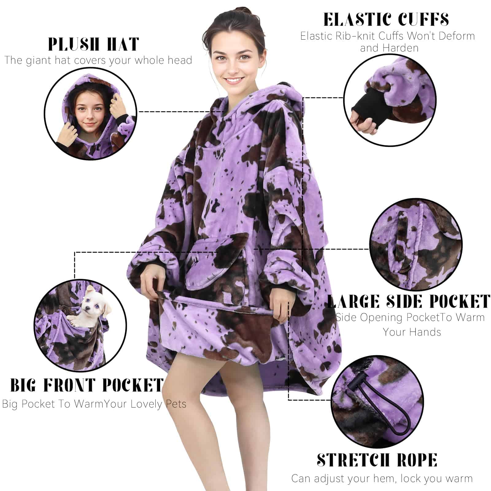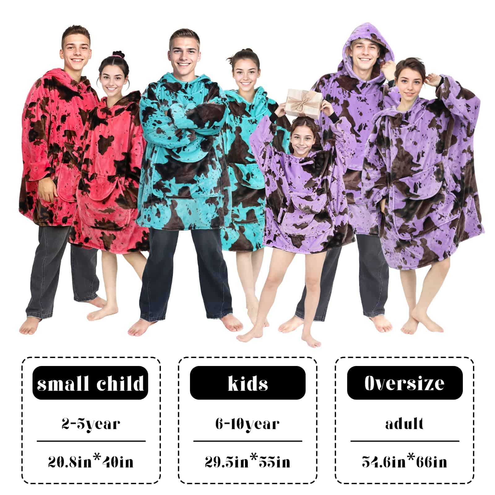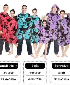 5. VARIEDAD DE COLORES: Nuestras mantas con capucha para adultos son adecuadas tanto para niños, mujeres y hombres. Hay varios colores con estampados de vaca para elegir. Incluyen negro y blanco, rosa, morado, azul verdoso, etc. La manta con capucha no solo es funcional, sino también un accesorio de moda para mantenerte caliente. Puedes elegir el estilo que coincida con tu personalidad y la decoración de tu hogar.