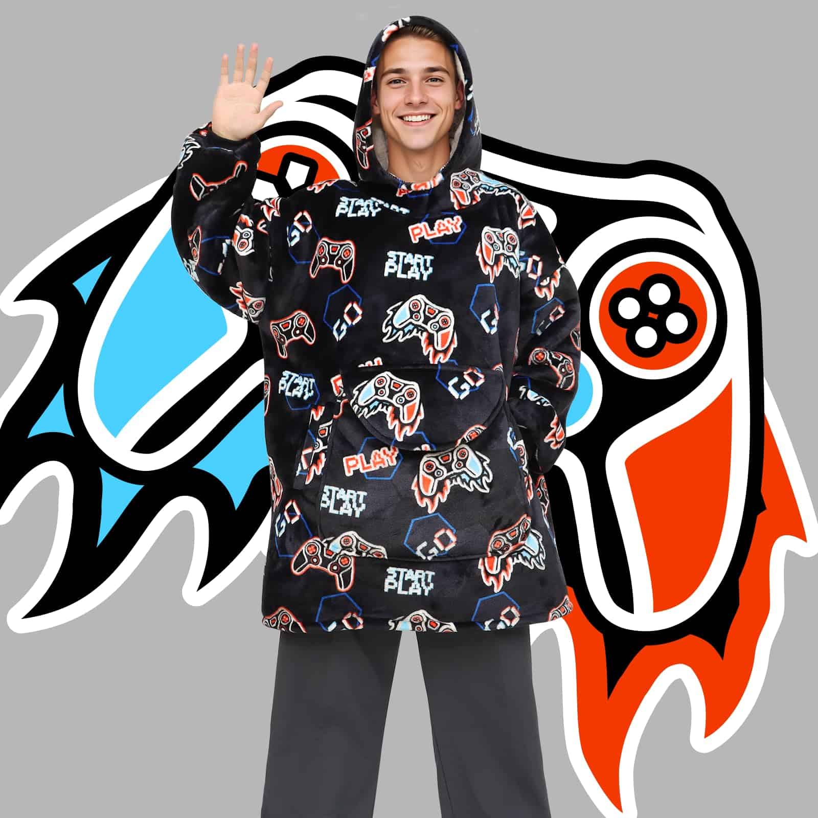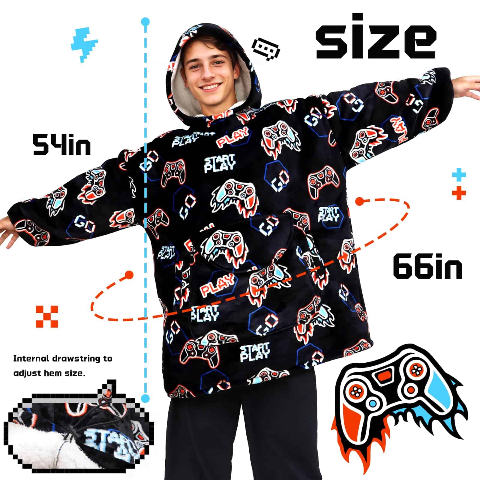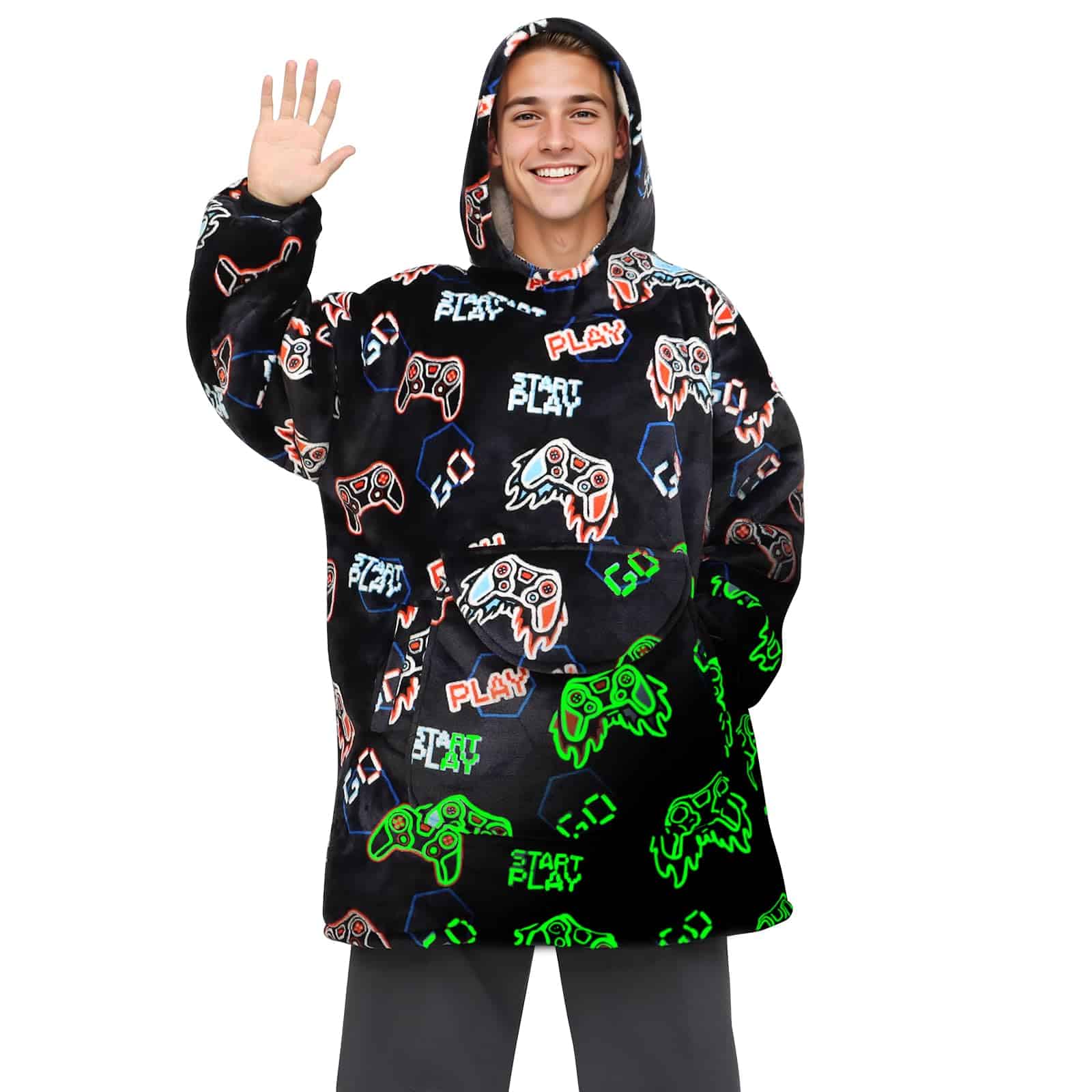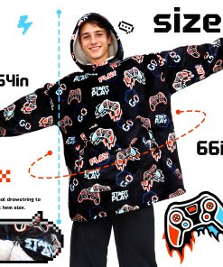 Manta con capucha que brilla en la oscuridad: simplemente exponga la manta con capucha de controlador de videojuegos a una fuente de luz brillante o luz solar durante unos 15 a 20 minutos. Cuanto más brillante sea la luz, más fuerte será la manta en la oscuridad. Lavar a máquina en ciclo suave con agua fría, secar en secadora a baja temperatura. Regale esta manta con capucha temática de juegos al jugador de su vida para un regalo acogedor y cálido que les encantará. Diseño de capucha: hay un gran bolsillo para esconder el control remoto de la televisión, bocadillos y más con fácil acceso, y los bolsillos laterales le permiten guardar objetos pequeños o mantener sus manos calientes, mientras que los puños acanalados aseguran un ajuste ceñido alrededor de las muñecas durante las tareas domésticas, evitando que el aire frío se cuele y mejorando la calidez general. TALLA ÚNICA PARA TODOS: no se preocupe por el tamaño de la manta con capucha. Esta manta con capucha es adecuada para adultos de todos los tipos de cuerpo. Puede acomodar cómodamente a una amplia gama de personas, asegurándose de que todos puedan disfrutar de la comodidad y calidez de nuestra manta con capucha. Manta con capucha extragrande que le permite vestirse rápidamente y calentar su cuerpo en varios segundos. VERSÁTIL: esta manta con capucha cálida es adecuada para muchas ocasiones. Adecuada para relajarse, trabajar o enfrentar las mañanas frías, los hombres pueden usar mantas con capucha mientras juegan para darle más ambiente a la sala de juegos. Es un excelente compañero para actividades al aire libre como senderismo, campamentos, picnics o eventos deportivos. Sin impacto en su experiencia al caminar, trabajar o entretenerse.