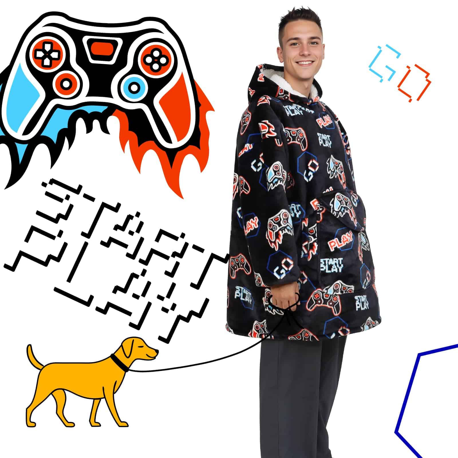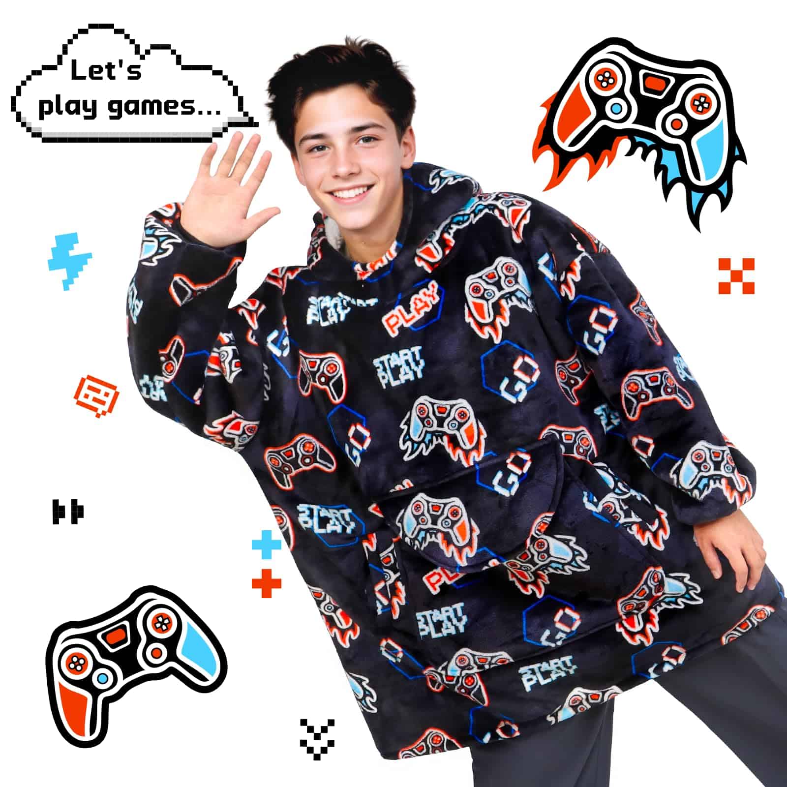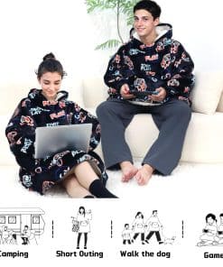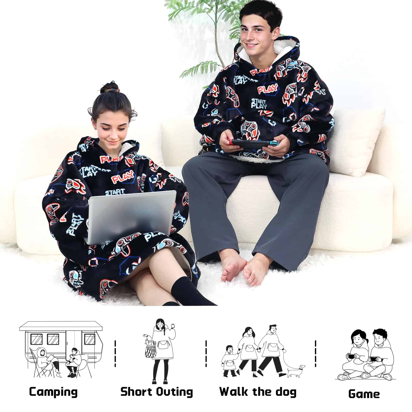 Manta con capucha que brilla en la oscuridad: simplemente exponga la manta con capucha de controlador de videojuegos a una fuente de luz brillante o luz solar durante unos 15 a 20 minutos. Cuanto más brillante sea la luz, más fuerte será la manta en la oscuridad. Lavar a máquina en ciclo suave con agua fría, secar en secadora a baja temperatura. Regale esta manta con capucha temática de juegos al jugador de su vida para un regalo acogedor y cálido que les encantará. Diseño de capucha: hay un gran bolsillo para esconder el control remoto de la televisión, bocadillos y más con fácil acceso, y los bolsillos laterales le permiten guardar objetos pequeños o mantener sus manos calientes, mientras que los puños acanalados aseguran un ajuste ceñido alrededor de las muñecas durante las tareas domésticas, evitando que el aire frío se cuele y mejorando la calidez general. TALLA ÚNICA PARA TODOS: no se preocupe por el tamaño de la manta con capucha. Esta manta con capucha es adecuada para adultos de todos los tipos de cuerpo. Puede acomodar cómodamente a una amplia gama de personas, asegurándose de que todos puedan disfrutar de la comodidad y calidez de nuestra manta con capucha. Manta con capucha extragrande que le permite vestirse rápidamente y calentar su cuerpo en varios segundos. VERSÁTIL: esta manta con capucha cálida es adecuada para muchas ocasiones. Adecuada para relajarse, trabajar o enfrentar las mañanas frías, los hombres pueden usar mantas con capucha mientras juegan para darle más ambiente a la sala de juegos. Es un excelente compañero para actividades al aire libre como senderismo, campamentos, picnics o eventos deportivos. Sin impacto en su experiencia al caminar, trabajar o entretenerse.