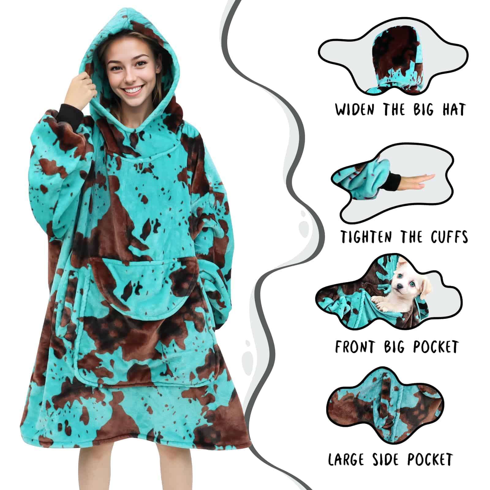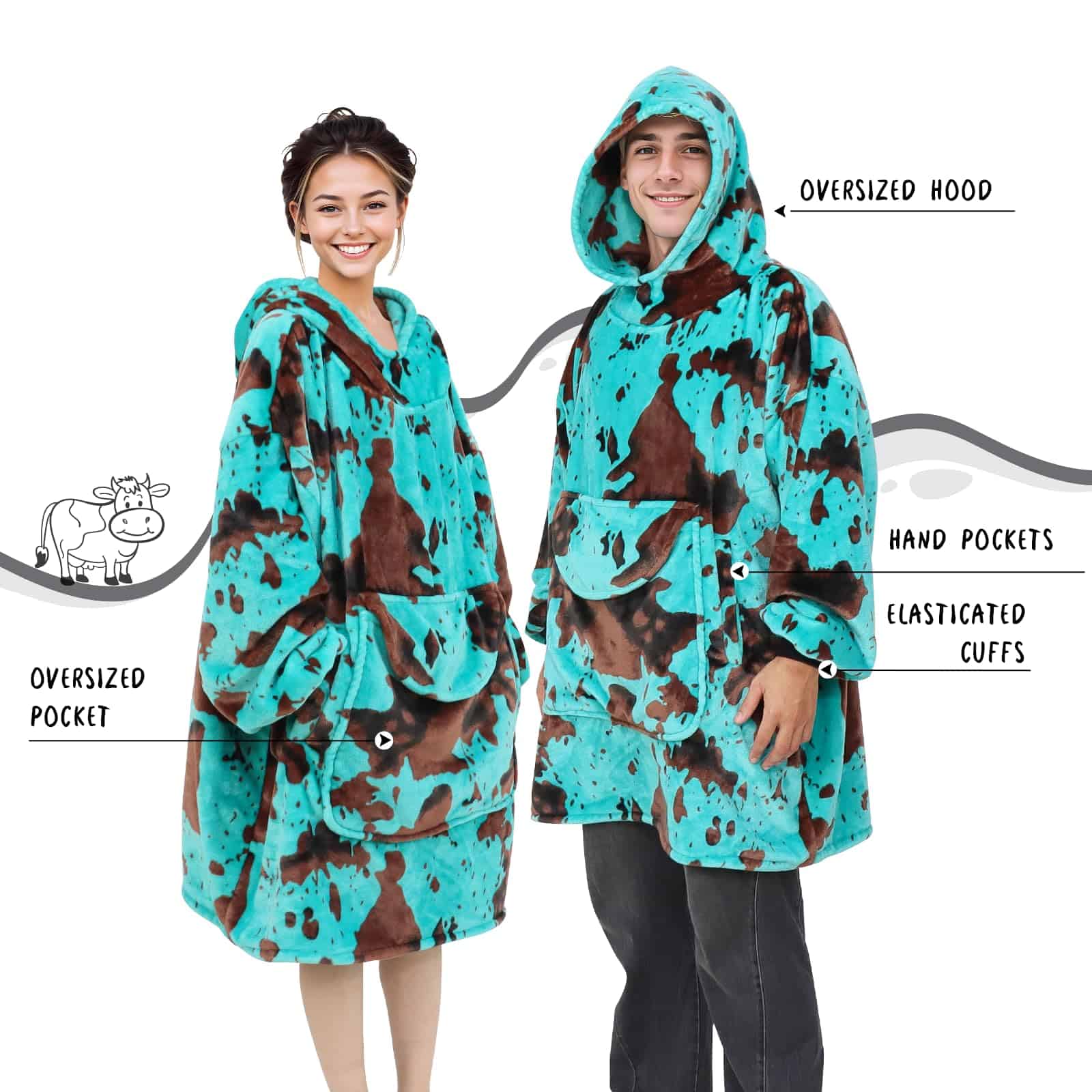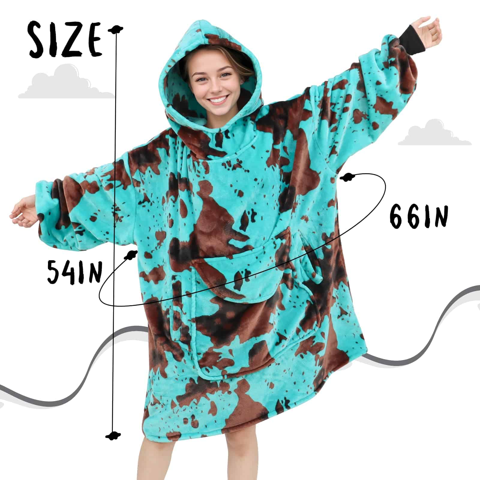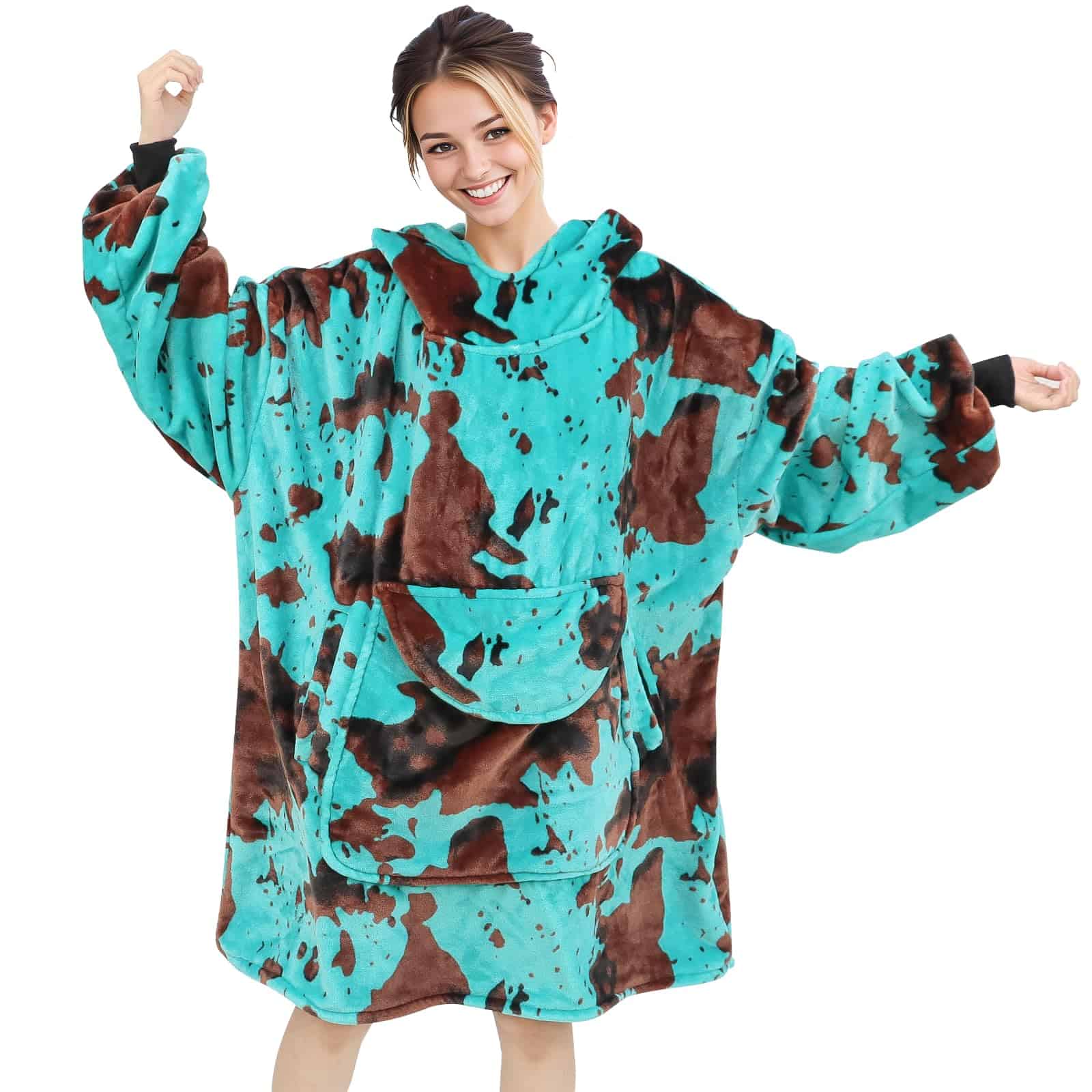 La manta con capucha cow print azul es perfecta para mantenerte cálido y acogedor durante las épocas más frías. Está hecha de material de forro polar de alta calidad que proporciona una sensación increíblemente suave al tacto, brindando una experiencia de confort excepcional. El diseño de capucha te permite sentirte abrigado y cómodo, mientras que el bolsillo gigante te permite almacenar tus pertenencias de forma conveniente. Además, la manta con capucha cow print es versátil y se puede utilizar en una amplia variedad de ocasiones, tanto en interiores como en exteriores. Su talla única para todos la hace adecuada para la mayoría de formas y tamaños. Sorprende a tus seres queridos con esta manta con capucha cow print como regalo, les brindará calidez y amor infinitos. ¡No esperes más y disfruta de la comodidad y estilo con esta manta con capucha cow print azul!