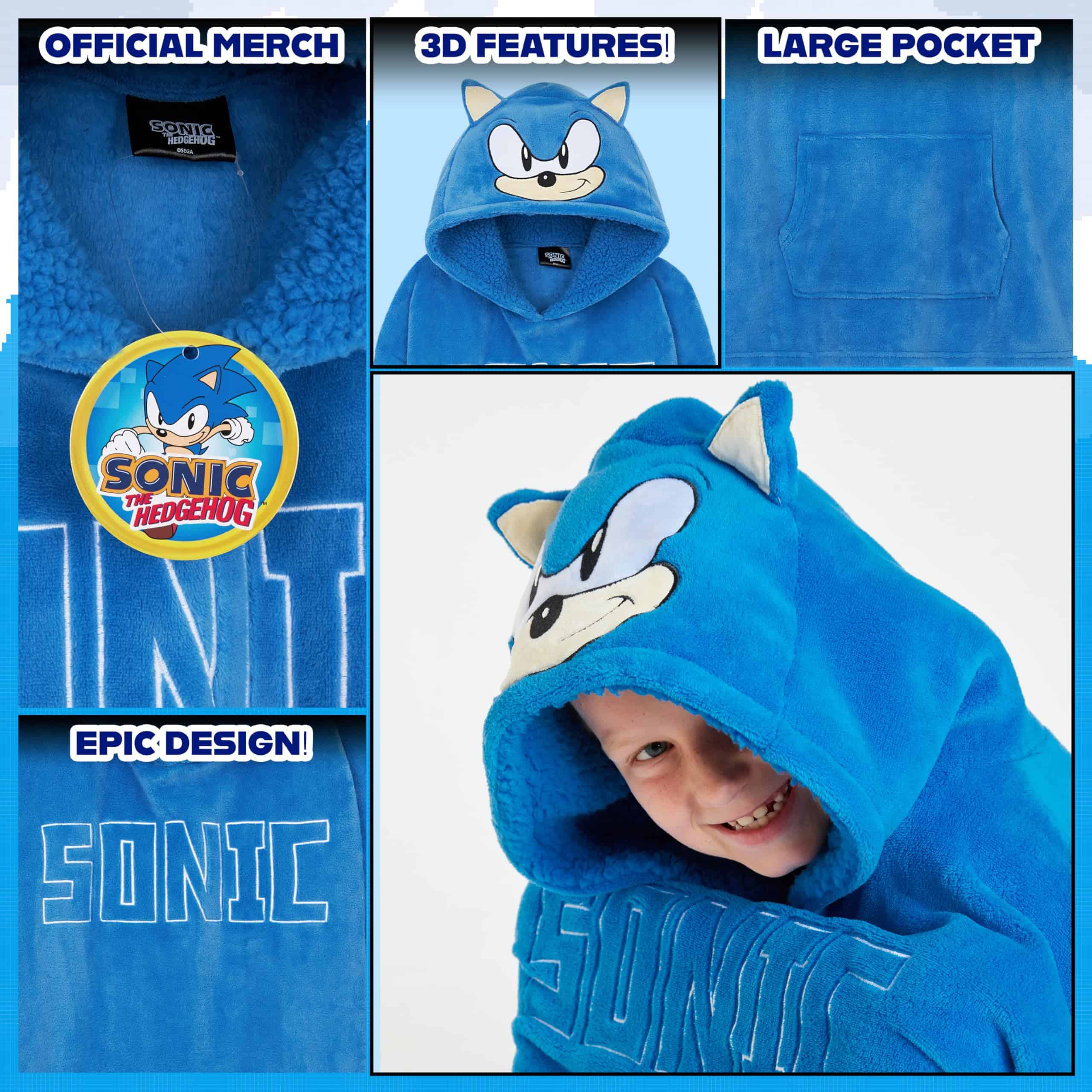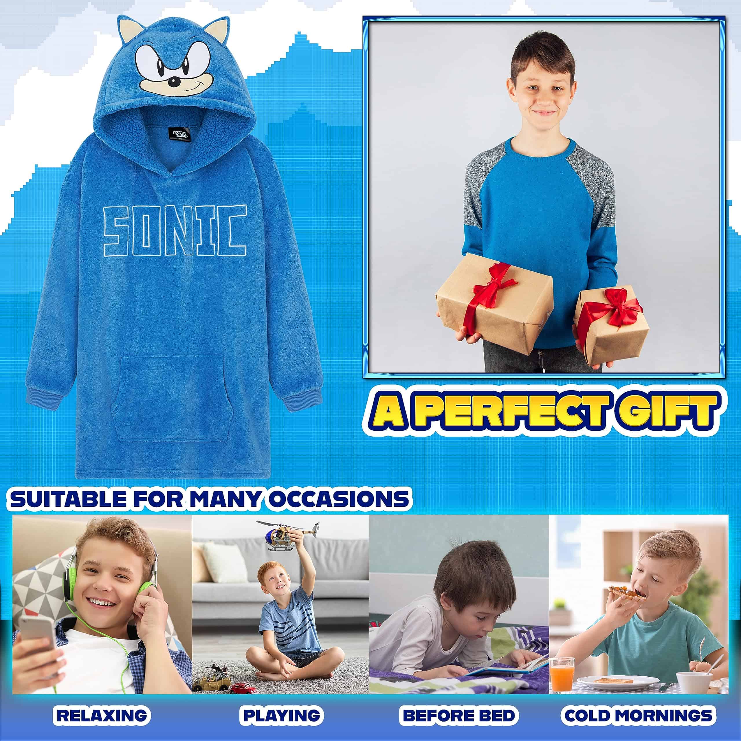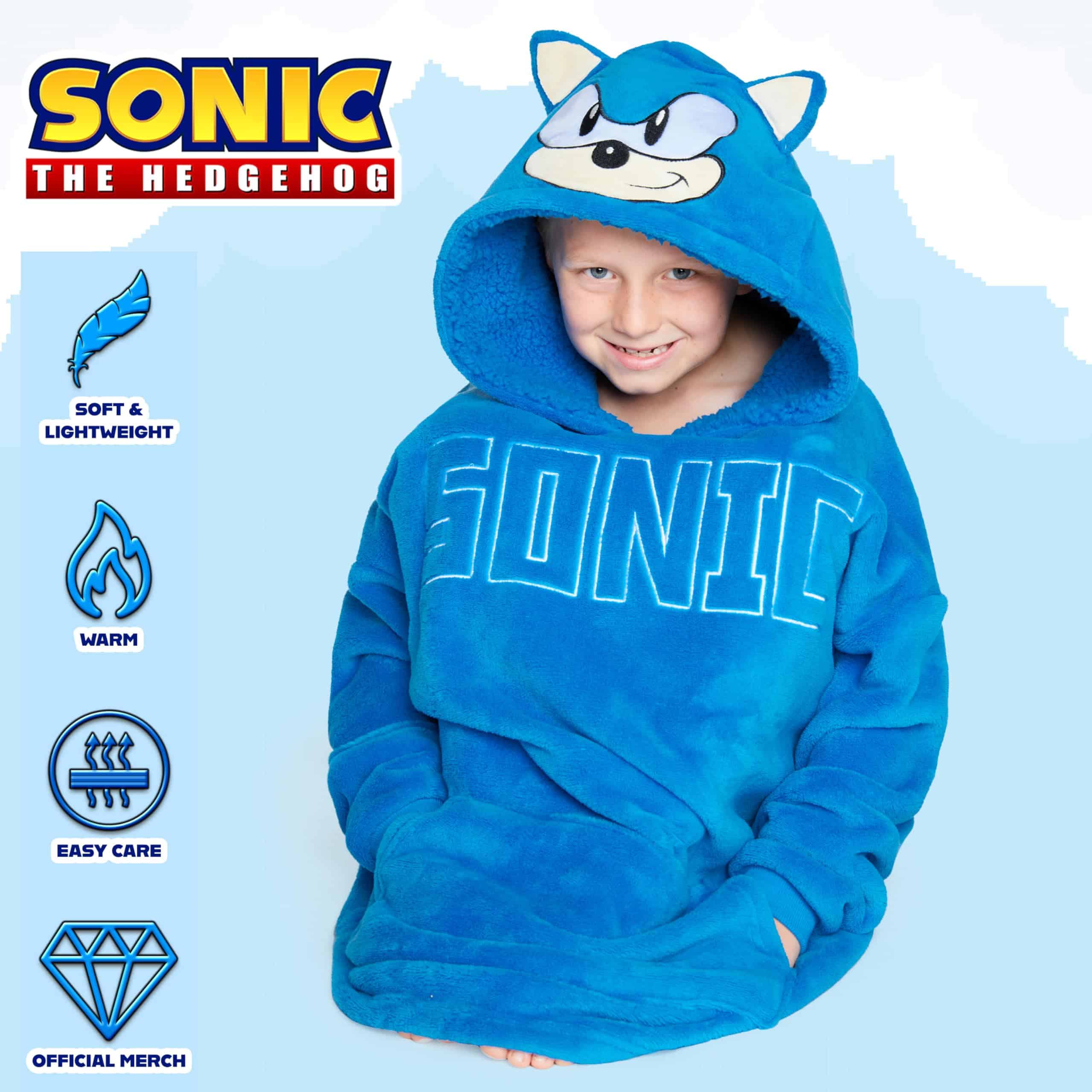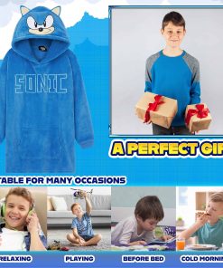 Manta con capucha de Sonic the Hedgehog para niños Mercancía oficial de juegos de Sonic Capucha forrada de sherpa, mangas largas y un espacioso bolsillo canguro Hecho de forro polar súper suave (100% poliéster) Fácil de lavar y rápido de secar Viene en talla única para todos, consulta las imágenes para la tabla de medidas Imprescindible para mantenerse caliente este invierno Ideal para mantenerse calentito durante los meses de invierno, viendo películas o jugando Buscando regalos para niños Esta cómoda manta con capucha para niños es el regalo perfecto para los jugadores