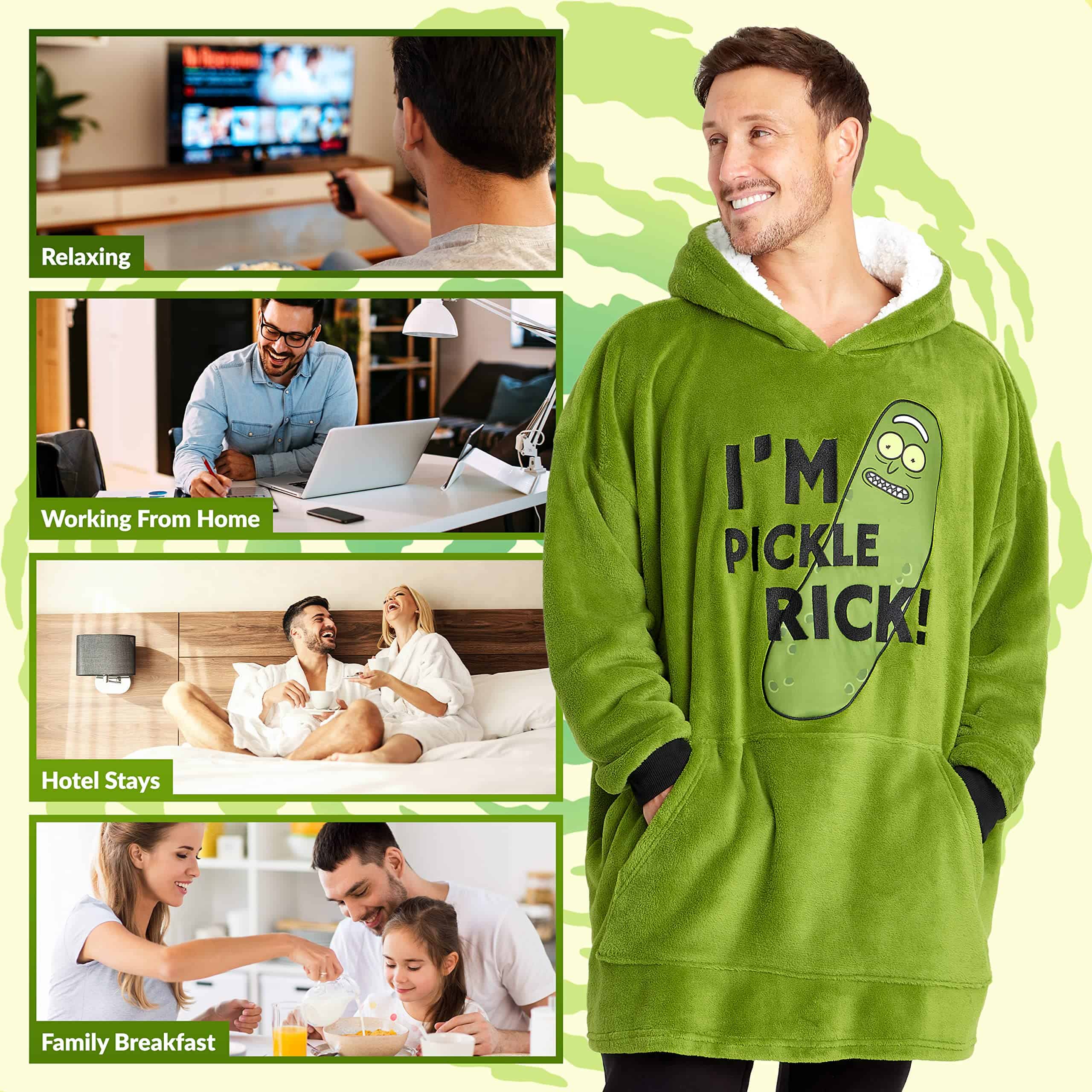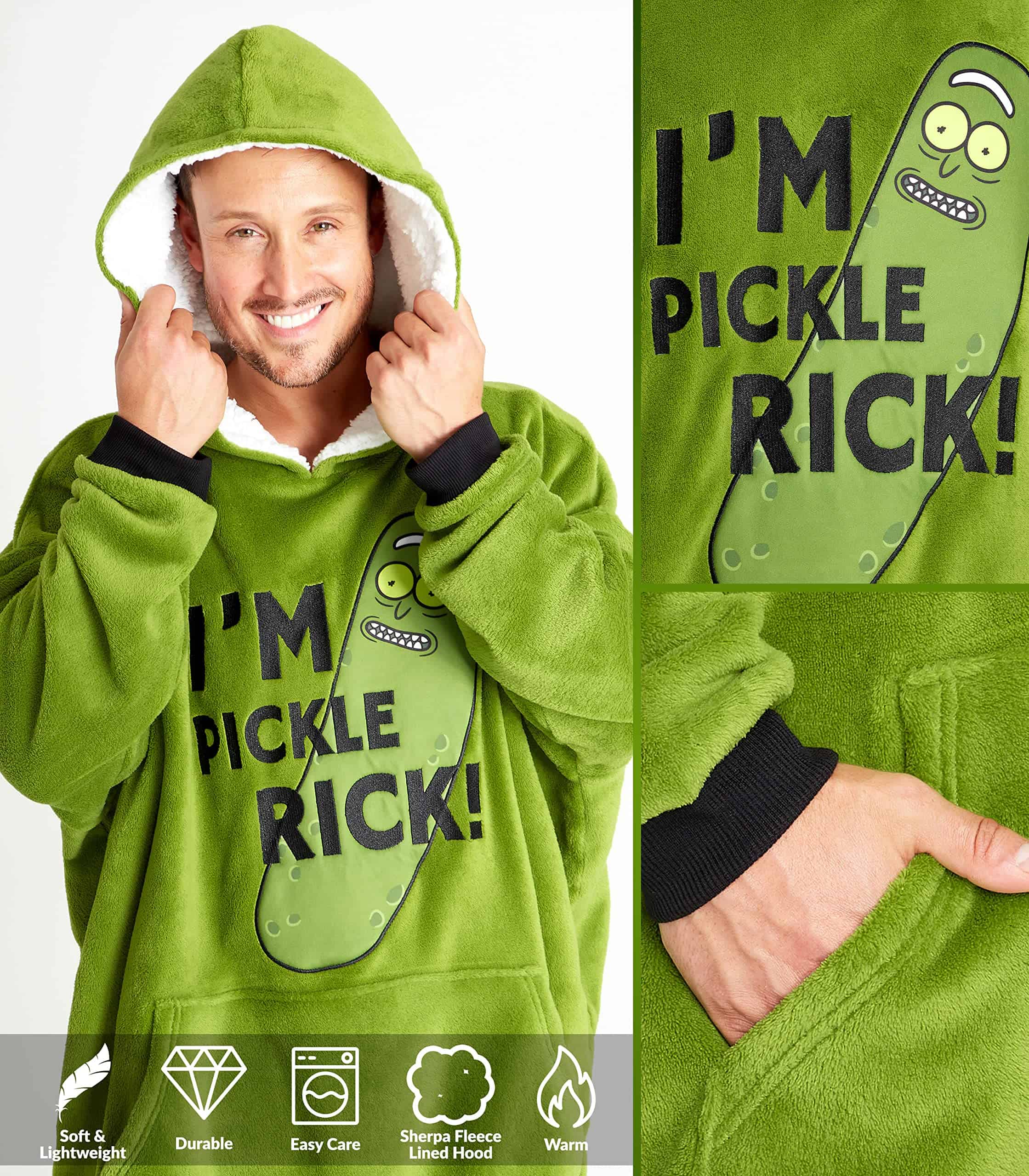 Say hello to ultimate comfort with this fleece hoodie blanket for men and teens with a quirky Rick and Morty design. Made with super-soft fleece and featuring a sherpa-lined hood and kangaroo pocket this hoodie was made for cosy evenings relaxing on the sofa. Available in one size fits all, see images for more features and details on these fluffy hoodies for men.