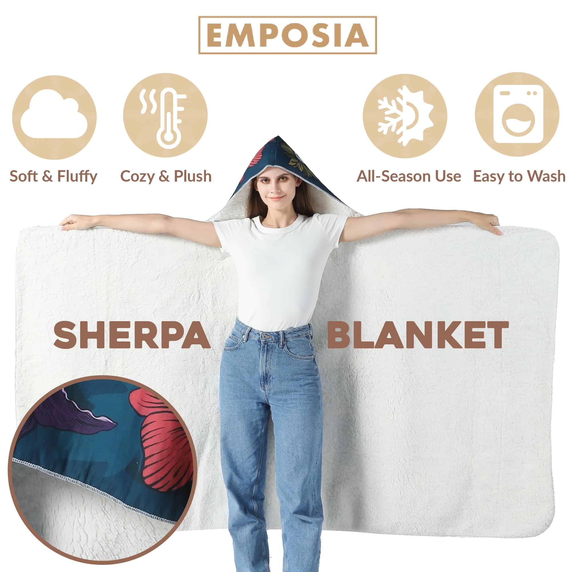 La Manta con Capucha Oversized EMPOSIA es la cumbre de la sostenibilidad, la comodidad y la elegancia. Ya sea que disfrutes leyendo, te intereses por la moda o simplemente quieras estar abrigado y acogedor, nuestra manta con capucha de sherpa lo tiene todo. ¡Consigue la tuya de inmediato y disfruta del confort de una nube grande y esponjosa.