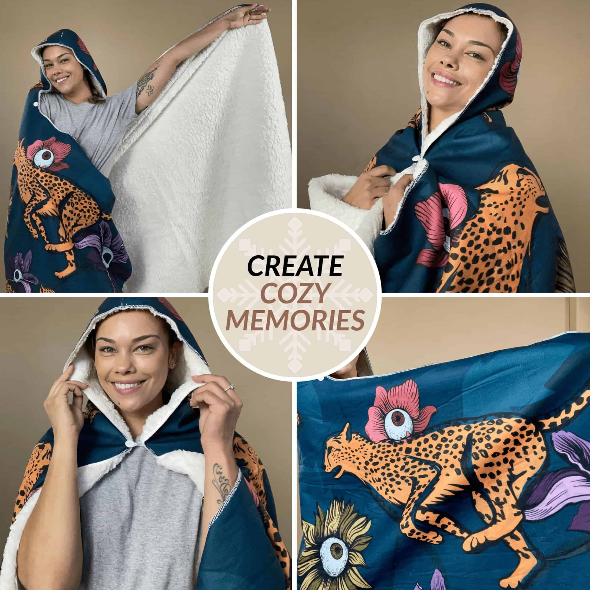Con diseños únicos para complementar tu estilo individual, nuestra manta con capucha gigante te ayudará a destacar. Nos asociamos con artistas imaginativos y clientes tempranos para crear diseños para nuestras mantas con capucha.