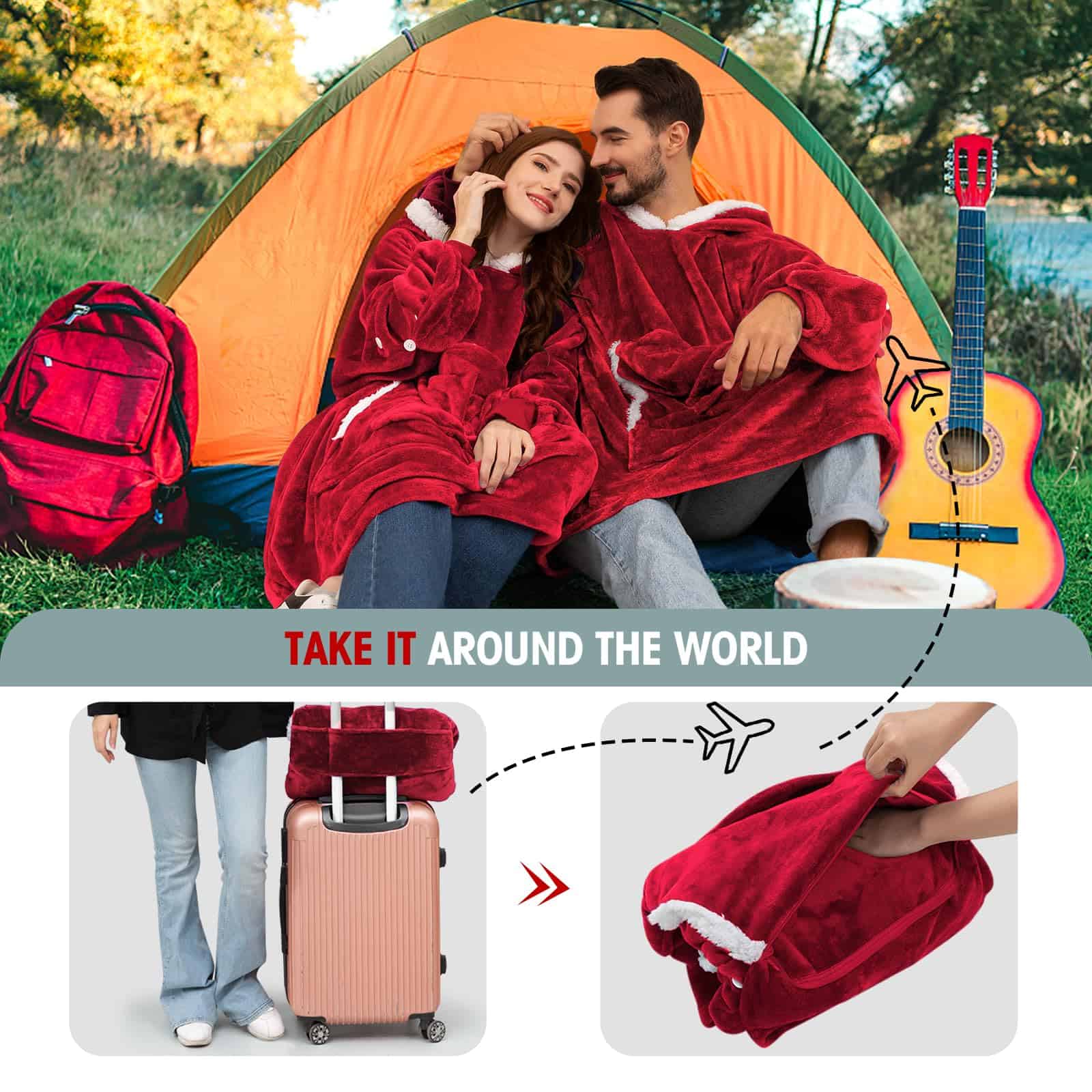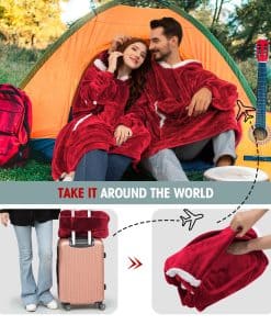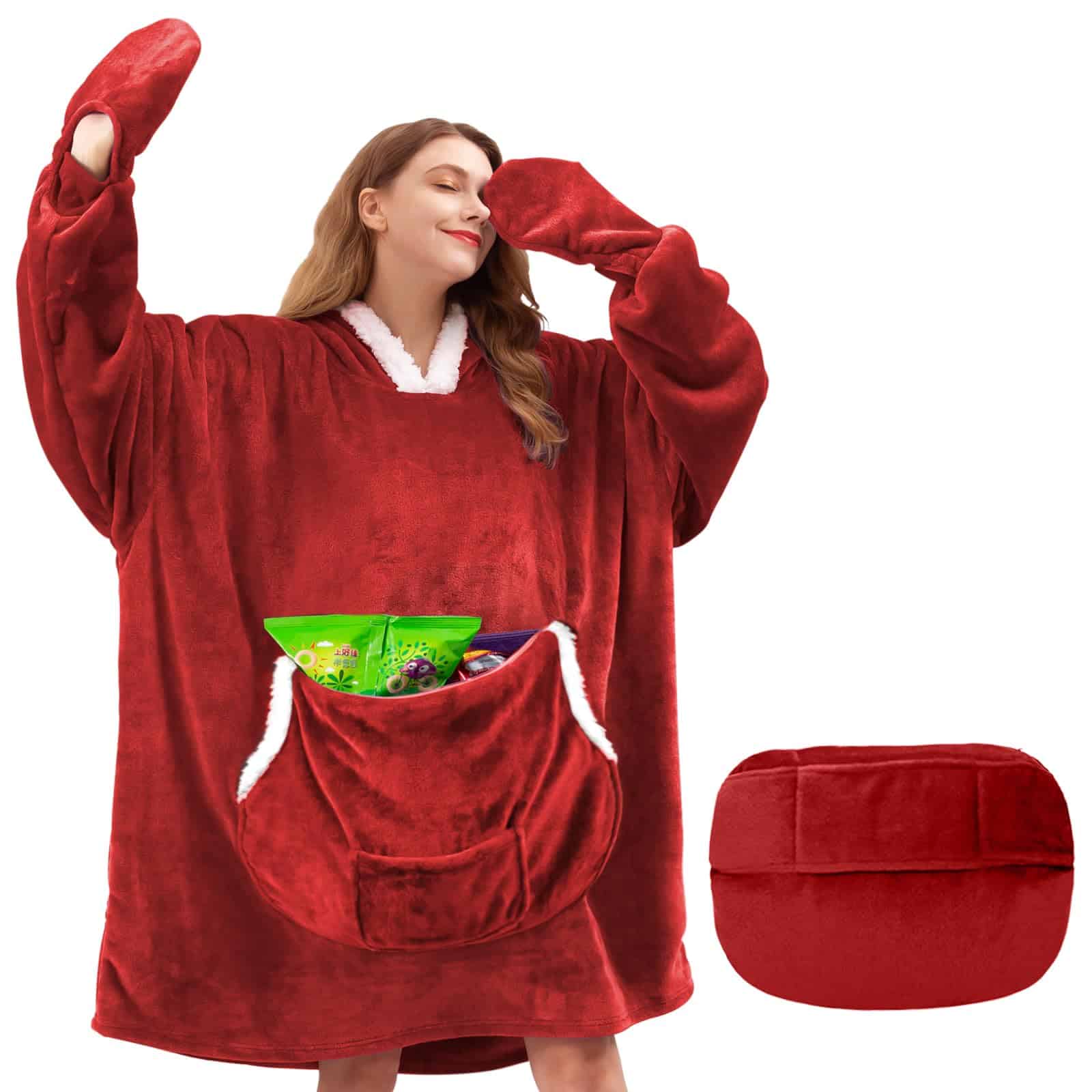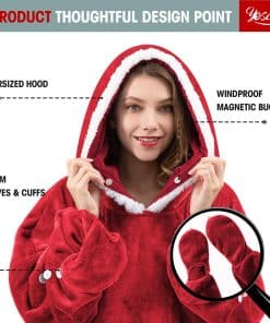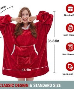 Esta manta con capucha está hecha de tela de franela y sherpa, perfecta para mantenerte cálido en cualquier clima. Cuenta con un bolsillo grande para guardar tus pertenencias, guantes desmontables en los puños y un diseño oversized que se adapta a adultos, mujeres, hombres, adolescentes y niños. Además, es ideal para llevar de viaje, ya que se pliega en una almohada con bolsillo que se puede colgar en tu maleta. ¡El regalo perfecto para tus seres queridos en cualquier ocasión especial!