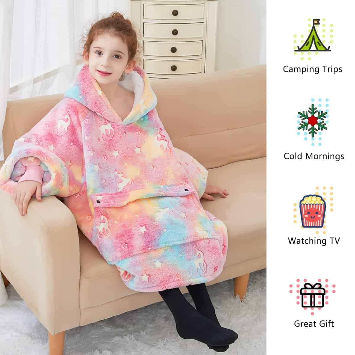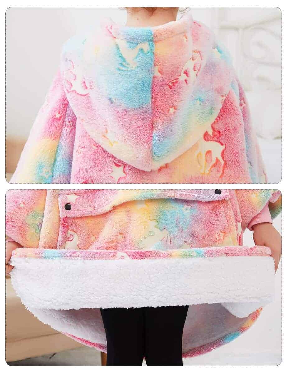 1. La manta con capucha para niños es un gran regalo para niños de 6 a 10 años menores de 5 pies. Se puede usar en casa, cómodo y cálido, o en campamentos, ¡incluso para ir a la escuela! La manta con capucha de longitud razonable te mantendrá caliente sin arrastrar al suelo y ensuciarse. 2. Diseño patentado de KFUBUO (US D967,606 S) La manta con capucha para niños combina la eficiencia del diseño de la sudadera con capucha, lo que resulta en mantas con capuchas súper cómodas y muy cálidas. Un poco más espacioso en comparación con una sudadera ordinaria, para que puedas recoger tu cuerpo y levantar las piernas para meter la manta de sudadera bajo los talones. 3. Facilidad de cuidado Esta manta wearable es completamente lavable a máquina y se puede secar a baja temperatura, lo que se suma a su diseño de fácil mantenimiento. ¡Eso significa que tu manta olerá divina y se verá como nueva siempre que quieras! 4. Capucha grande y bolsillos profundos: La capucha grande de la manta wearable mantiene caliente tu cabeza y cuello y también sirve como almohada para recostarse. Los bolsillos profundos están equipados para guardar bocadillos, teléfono móvil o control remoto. Las sudaderas con mantas no serán tan restrictivas como la ropa de casa. 5. Tamaño: Talla única para todos, La sudadera con capucha está disponible en una talla única, que es adecuada para niños de 6 a 10 años, tanto niños como niñas, y viene en 9 diseños de patrones, por lo que también se adaptará a las preferencias de estilo de cualquier persona.