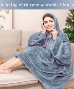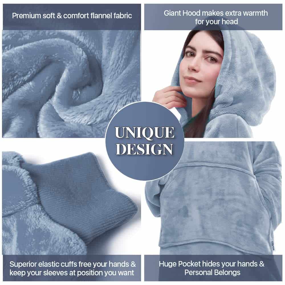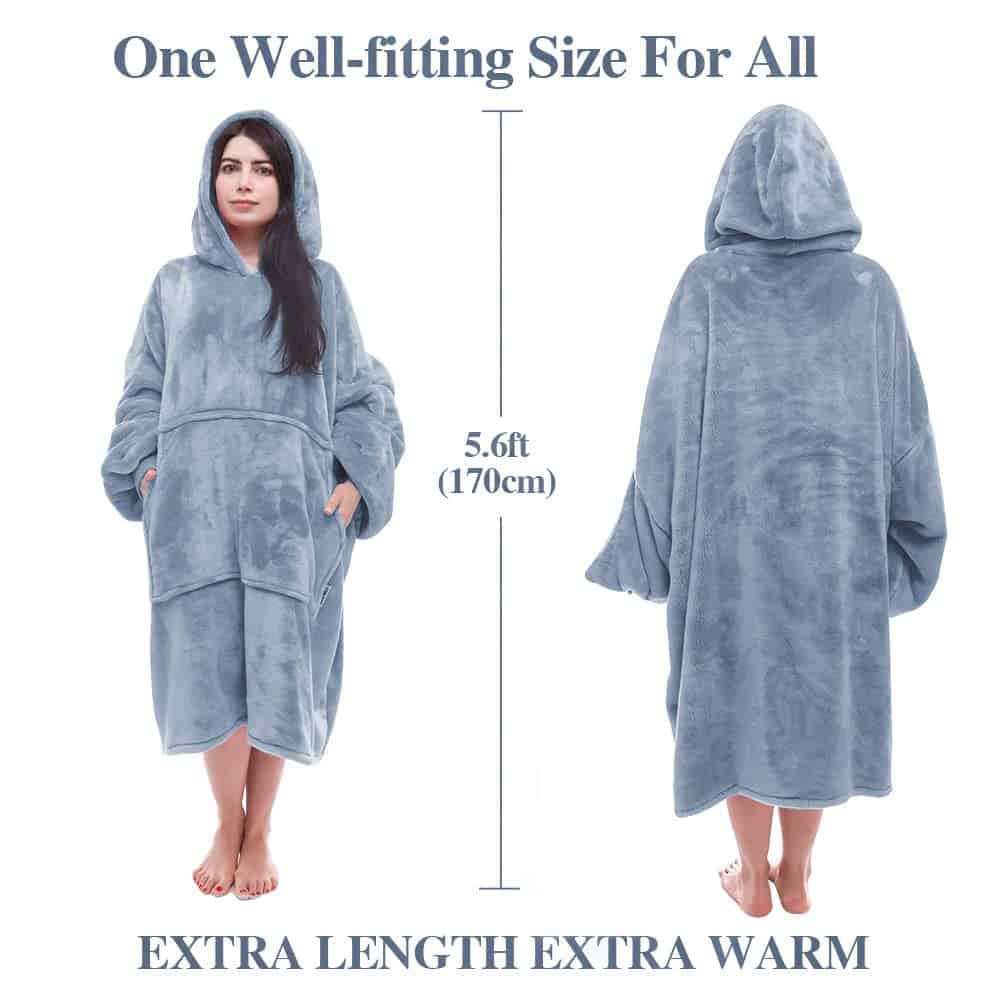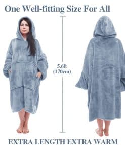 2. DISEÑO ÚNICO: Diseñado un súper cómodo suggie para mujeres y hombres. Las mantas con capucha extra largas con capucha gigante y mangas sueltas cubren todo el cuerpo desde la cabeza hasta los pies para mantenerte caliente. El puño elástico superior mantiene tus mangas en la posición correcta que deseas y libera tus manos; El bolsillo delantero es lo suficientemente grande para esconder tus manos para calidez o guardar tu teléfono, control remoto de TV o bocadillos adentro.