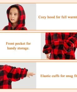Manta con capucha para adolescentes en cuadros rojos y negros, mantente abrigado y acogedor mientras descansas en casa, miras la televisión, juegas, lees, duermes la siesta, acampas o participas en actividades al aire libre. El diseño extragrande garantiza una cobertura y calidez completas. Hecha de 100% poliéster, la manta ofrece una sensación suave y amigable con la piel. Con un diseño festivo de cuadros rojos y negros, el gran bolsillo delantero puede contener bocadillos o juguetes, permitiendo que los adolescentes se muevan libremente, jueguen, salten o bailen mientras se mantienen calientes. Totalmente lavable a máquina y secado en secadora a baja temperatura para un mantenimiento fácil. Esto significa que tu manta siempre olerá fresca y se verá como nueva. Paquete que incluye una manta.