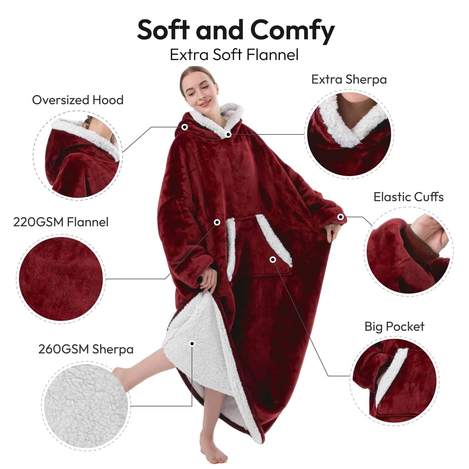 1. Material de microfibra: La superficie de 220 GSM de franela, forro de 260 GSM de sherpa fleece, es suave y más esponjoso al tacto, con más calidez.
