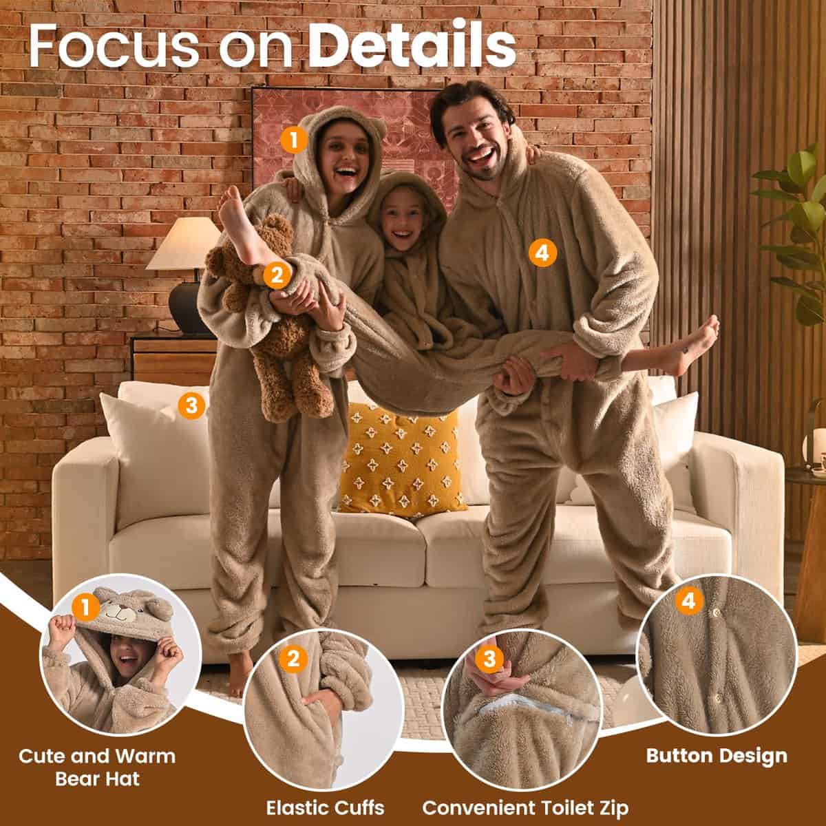 1. Cremallera de baño conveniente e inspirado diseño No hay necesidad de preocuparse por emergencias en el baño! Nuestro pijama para adultos cuenta con una cremallera conveniente debajo de la cadera para un fácil acceso. Adornado con adorables ojos y narices de oso, una cola peluda que no se interpondrá al sentarse o acostarse, y puños elásticos y bolsillos profundos para funcionalidad adicional.