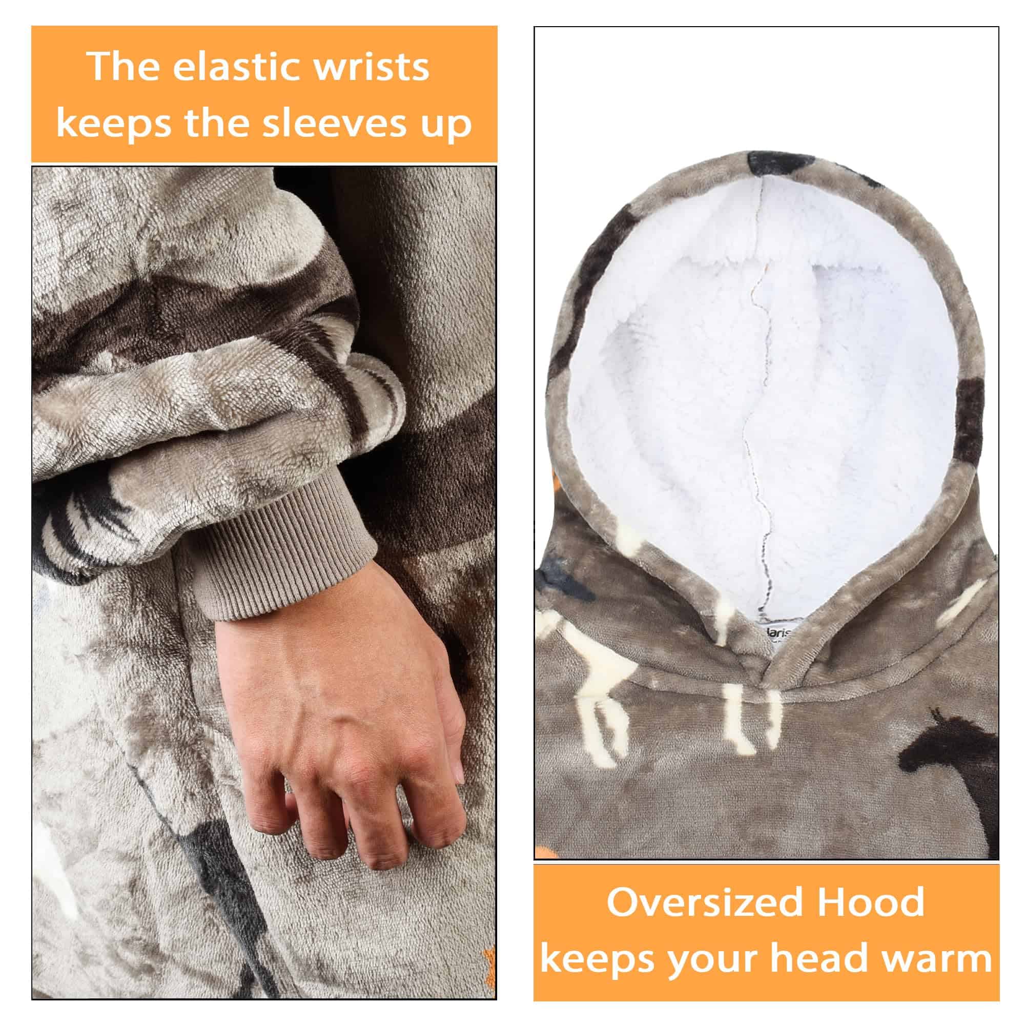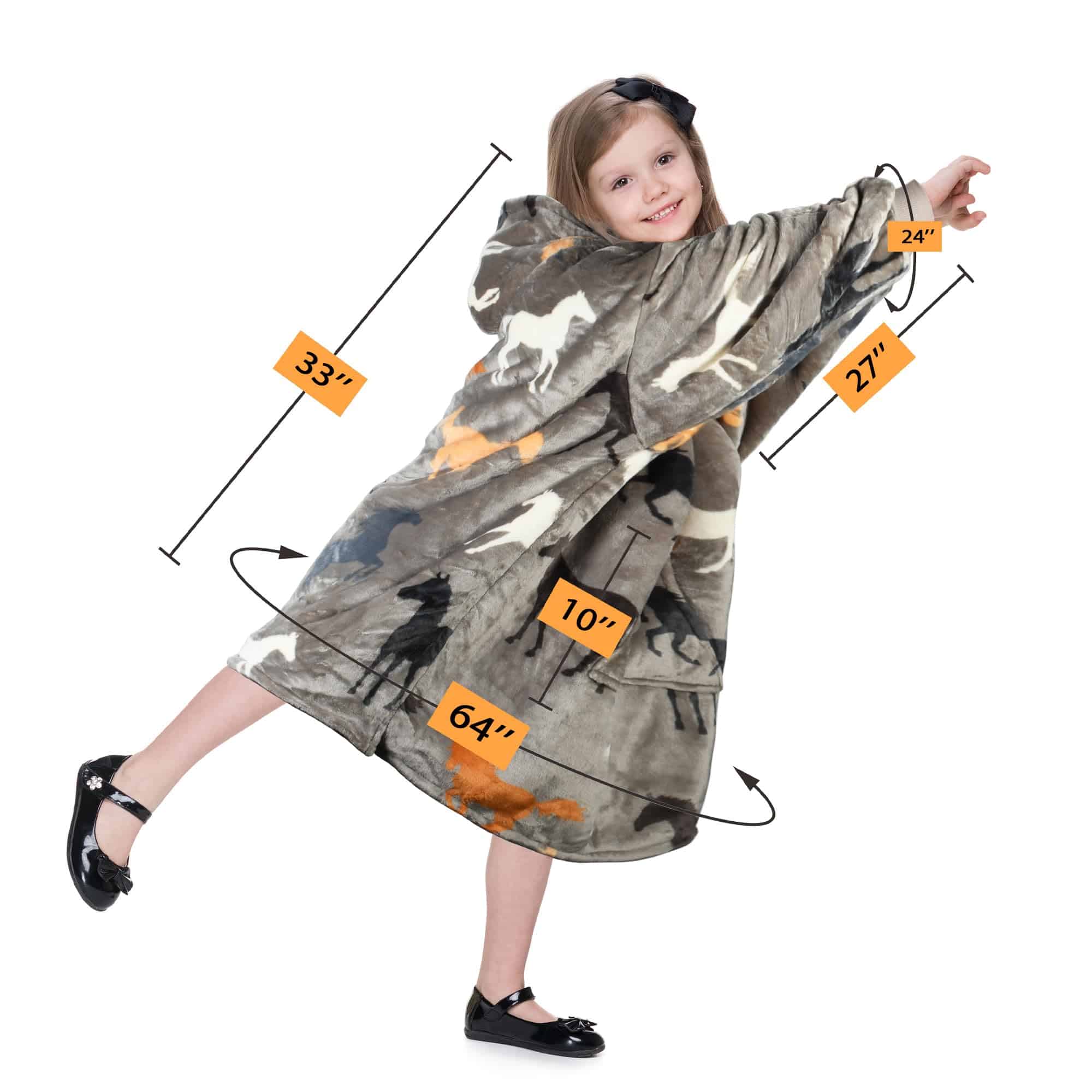 4. Talla única para todos los niños: Esta sudadera con capucha de Sherpa es perfecta para todos los niños. ¡Nuestra manta con capucha de patrón de caballos no arrastra en el suelo como la mayoría de las mantas! ¡Es perfecta para usar en el sofá o en movimiento! Es el mejor accesorio para una noche fría.