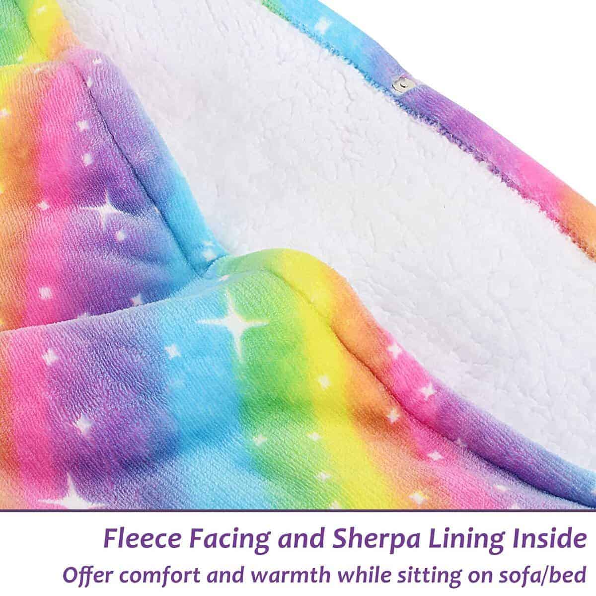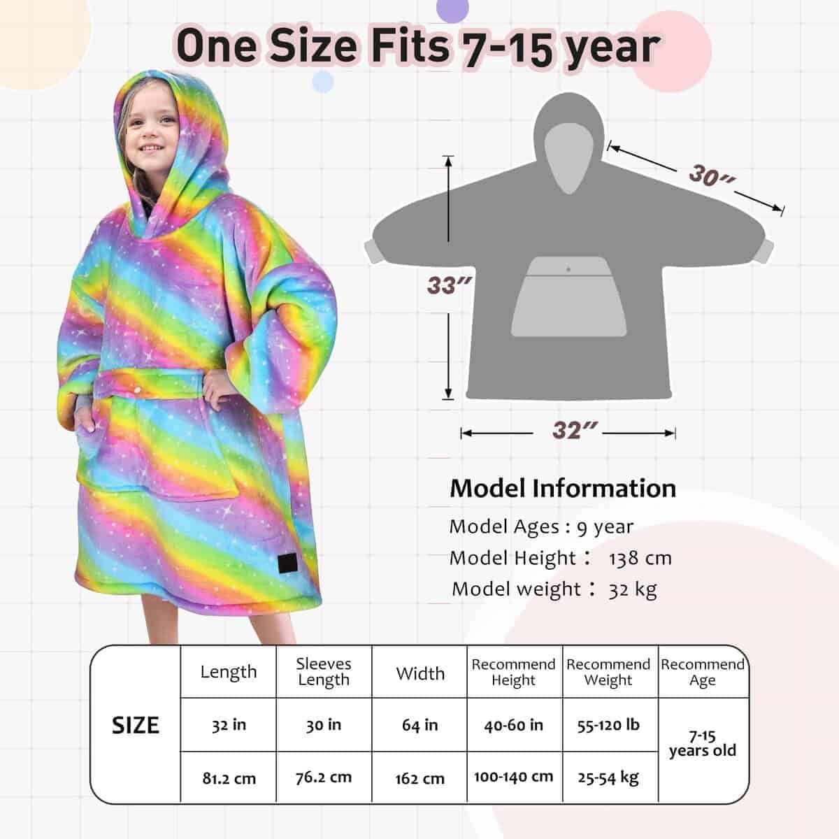 5. Talla única para todos: Esta sudadera manta de sherpa viene en una sola talla, pero es apta para la mayoría de los niños. Nuestra manta grande es espaciosa y larga, pero no arrastra por el suelo como la mayoría de las mantas. Es perfecta para usar en el sofá o en movimiento, convirtiéndola en el mejor accesorio para una noche fría.