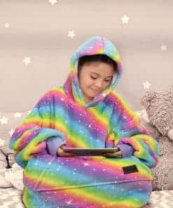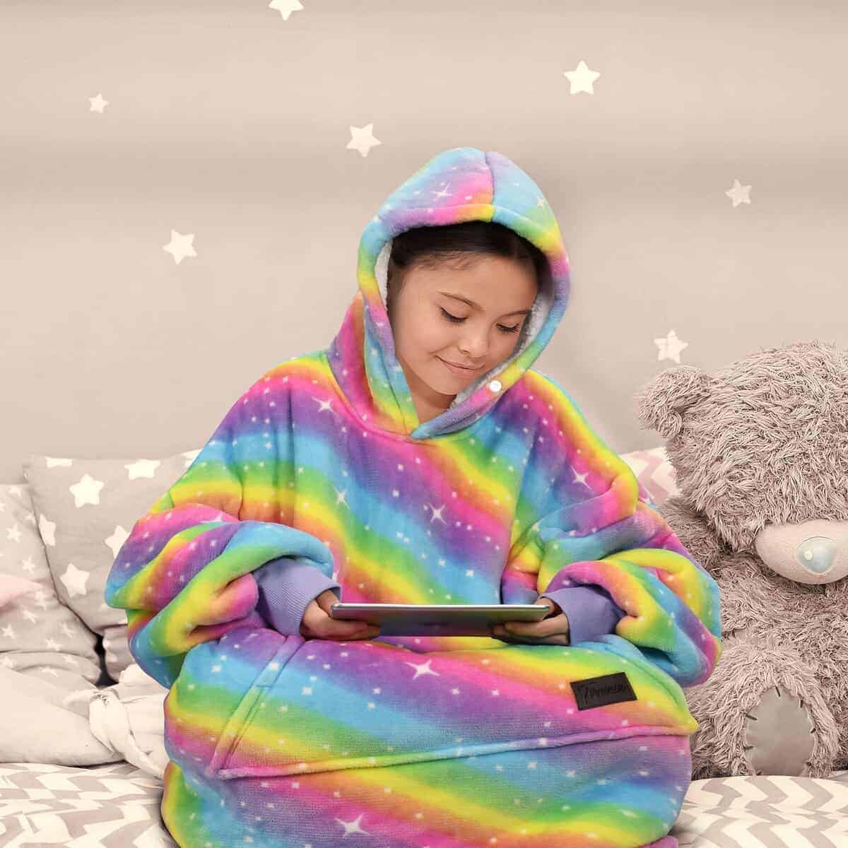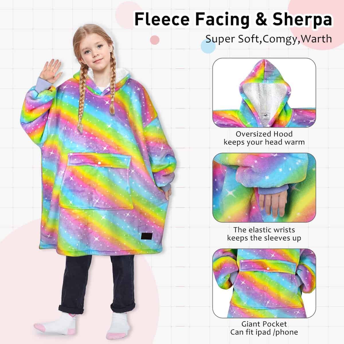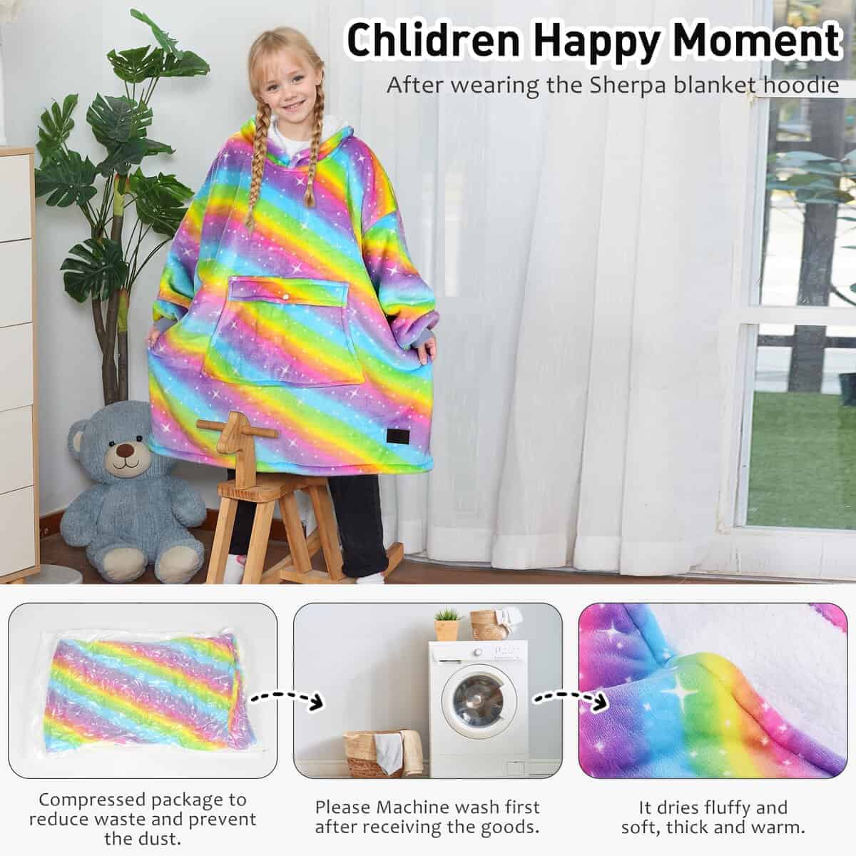 1. A todos los niños les encanta – Esta sudadera manta wearable es muy espaciosa, los niños pueden meter sus brazos y piernas en la capucha de sherpa suave y esponjosa mientras ven la televisión, juegan videojuegos, en eventos deportivos, acampando, leyendo, o en otras actividades al aire libre. Incluso en el frío invierno, usar nuestra manta wearable de sherpa permite a los niños disfrutar plenamente de su naturaleza al aire libre, convirtiéndola en el mejor regalo para Navidad.