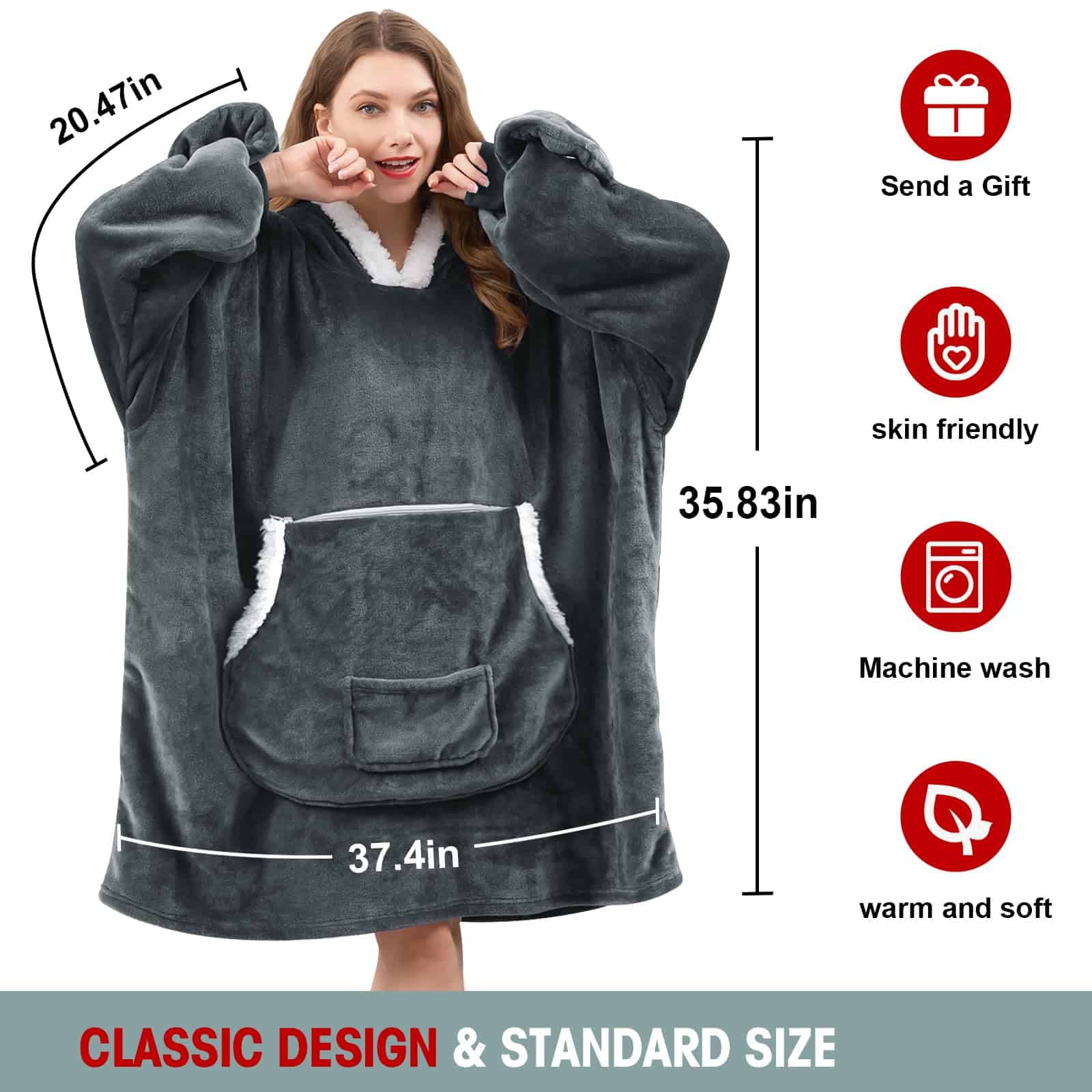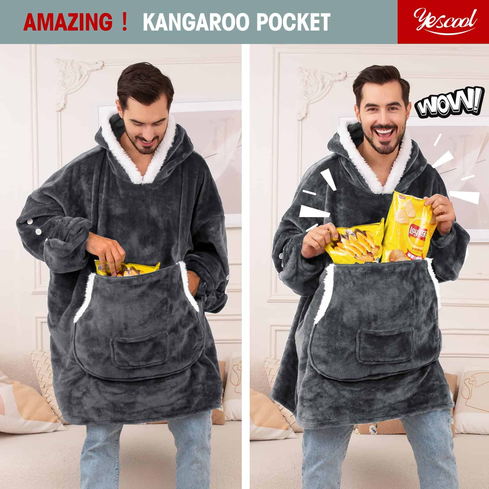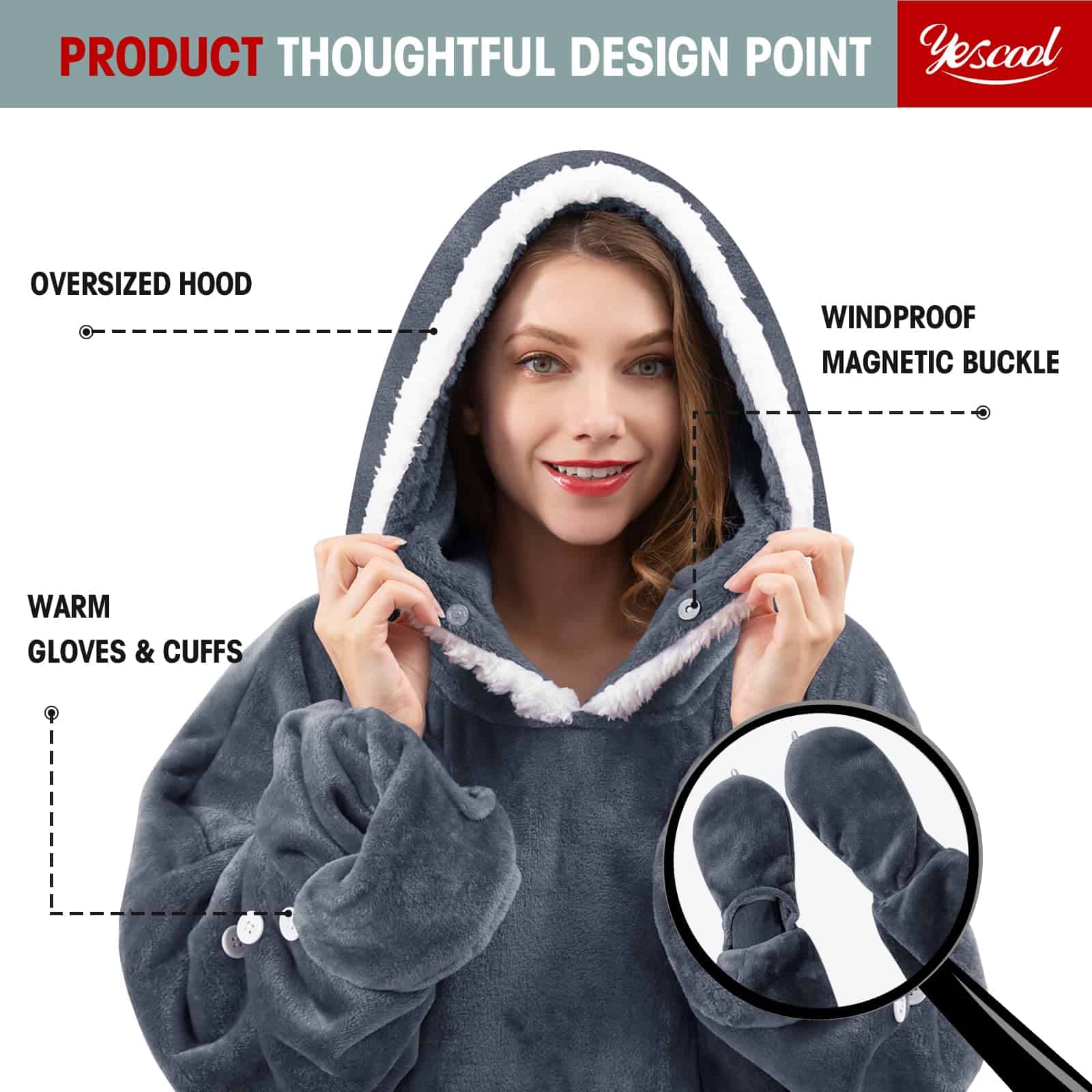 1. MANTA CON CAPUCHA CÁLIDA: Esta manta con capucha adecuada para adultos y niños está hecha con tela de forro polar y sherpa, las mantas con capucha tienen botones ocultos en la capucha y el cuello que te mantienen cálido sin importar cuánto baje la temperatura. También es una manta con capucha conveniente para el hogar y exteriores, como ver la TV, trabajar en una computadora portátil o escalar montañas. 2. DISEÑO PRÁCTICO DE SUDADERA CON CAPUCHA: Nuestra acogedora manta con capucha, cuenta con un bolsillo grande que puede contener todos tus elementos esenciales y más, como el teléfono, aperitivos, etc. ¿Qué pasa si tu cuerpo está caliente y tus manos están frías No te preocupes! Tenemos guantes adheribles en los puños, ¡así que todo lo que tienes que hacer es desabrocharlos y ponerlos! 3. SUDADERA CON CAPUCHA OVERSIZED Y PERSONALIZADA: La sudadera con capucha de manta extragrande es perfecta para Adultos, Mujeres, Hombres, Niños, Niñas, Adolescentes, Sentarse en el sofá, cama, cine, parque, playa o cualquier otra ocasión. ¡No afecta tu experiencia de caminar, trabajar o entretenerse. ¡Ahora puedes llevar tu manta a cualquier lugar! 4. BUEN COMPAÑERO EN EL VIAJE: Si no quieres empacar una maleta adicional para tus mantas cuando viajas, ¡por favor elige nosotros! Nuestra manta con capucha se pliega en una almohada de manta con bolsillos que se puede colgar en tu maleta. ¡Es un excelente compañero para actividades al aire libre como senderismo, acampar, picnics. 5. UN GRAN REGALO: La sudadera con capucha de manta Yescool es un regalo muy dulce para tu familia, mamá, novia, hijos, amigos y colegas, chicas adolescentes, abuela, esposa, hermana y mucho más! ¡Perfecto para regalo de cumpleaños, regalos universitarios, regalo de San Valentín, regalo del Día de la Madre, regalo de Acción de Gracias, regalo de Navidad, regalos para novia, regalos de Año Nuevo y todos los regalos de vacaciones.