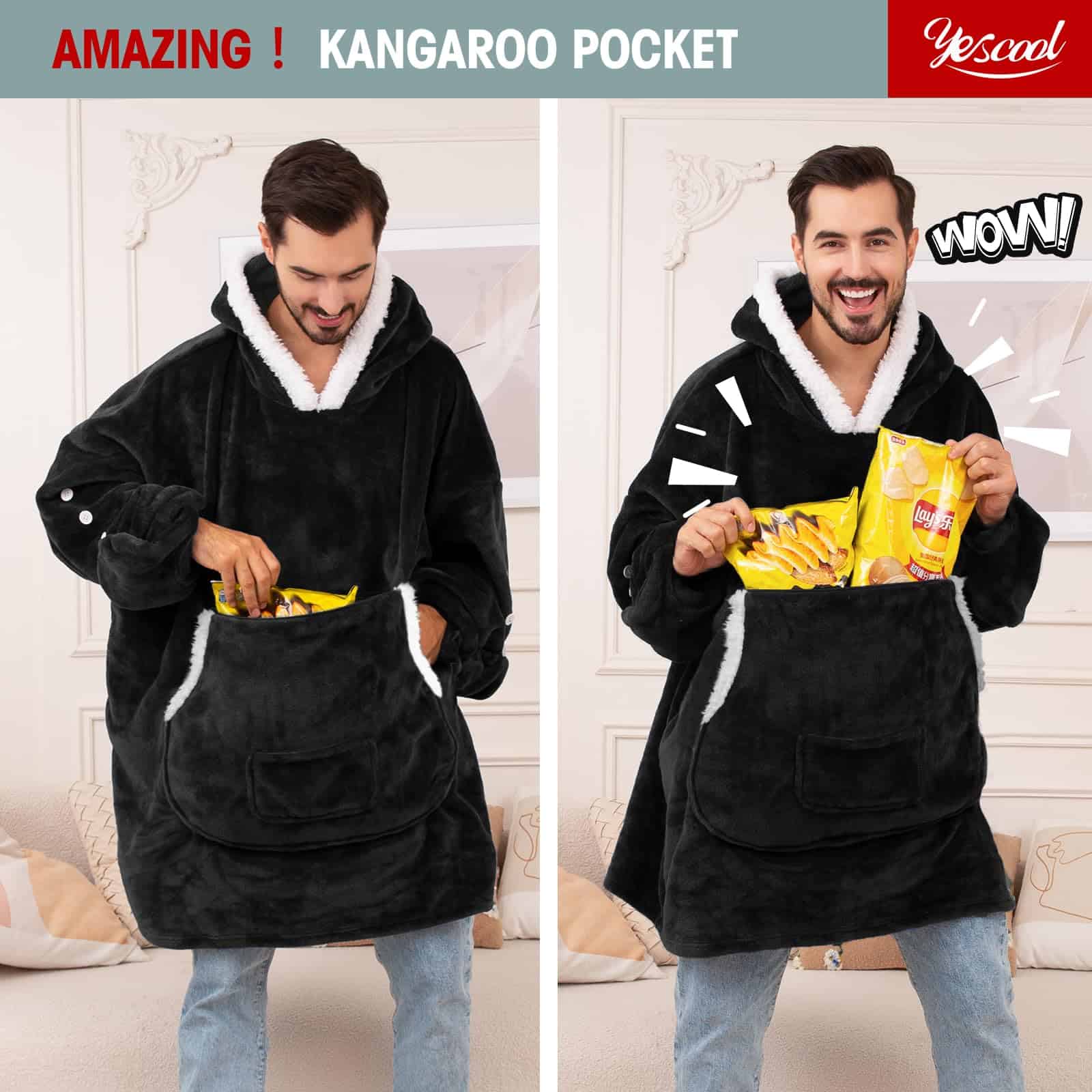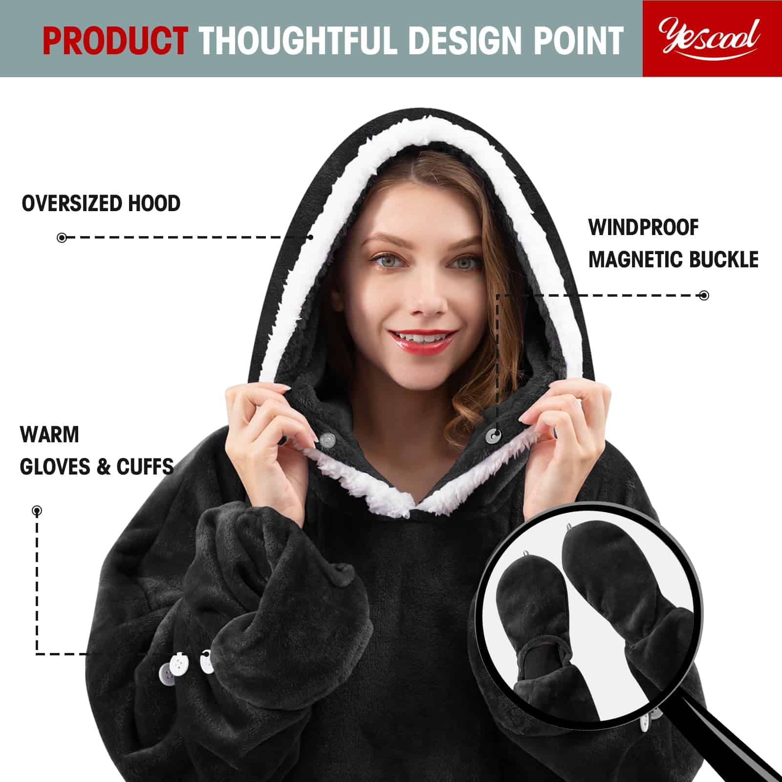 1. MANTA CON CAPUCHA CÁLIDA: Esta manta con capucha para adultos y niños está hecha con forro polar y tela sherpa, las mantas con capucha tienen botones ocultos en la capucha y el escote que te mantienen caliente sin importar cuán baja sea la temperatura, también es una manta con capucha conveniente para el hogar y al aire libre, como ver televisión, trabajar en una laptop o escalar montañas. 2. DISEÑO PRÁCTICO CON CAPUCHA: Nuestra acogedora manta con capucha, cuenta con un bolsillo enorme que puede contener todos sus elementos esenciales y más, como teléfono, aperitivos, etc. ¿Qué pasa si su cuerpo está caliente y sus manos están frías No se preocupe! Tenemos guantes ajustables en los puños, así que todo lo que tiene que hacer es desabrocharlos y ponerlos!. 3. MANTA CON CAPUCHA EXTRA GRANDE Y PERSONALIZADA: La sudadera con capucha extragrande es perfecta para adultos, mujeres, hombres, niños, niñas, adolescentes, sentados en el sofá, la cama, el cine, el parque, la playa o cualquier otra ocasión. Sin impacto en su experiencia de caminar, trabajar o entretenimiento. ¡Ahora puedes llevar tu manta en cualquier lugar! 4. BUEN SOCIO EN EL VIAJE: Si no quieres empacar una maleta adicional para tus mantas cuando viajas, elige esta manta con capucha. Nuestra manta se pliega en una almohada de viaje con bolsillo que se puede colgar en tu maleta. Es un excelente compañero para actividades al aire libre como senderismo, camping, picnics. 5. UN GRAN REGALO: La sudadera con capucha de Wearable Blanket de Yescool es un regalo muy dulce para tu familia, mamá, novia, niños, amigos y colegas, adolescentes, abuela, esposa, hermana y mucho más! ¡Perfecta para regalos de cumpleaños, regalos universitarios, regalos de San Valentín, regalos del Día de la Madre, regalos de Acción de Gracias, regalos de Navidad, regalos para novias, Año Nuevo y todos los regalos de vacaciones.
