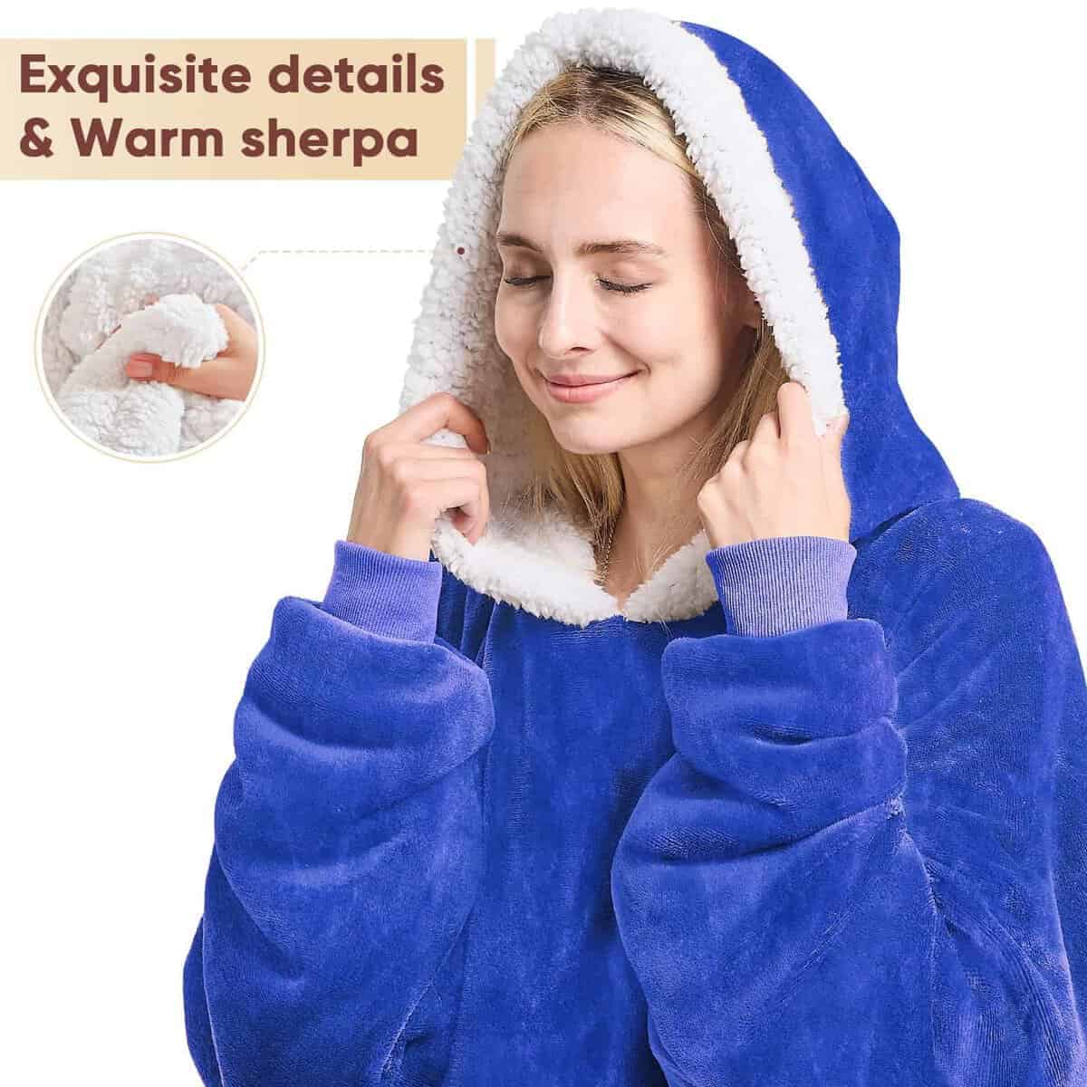 1. EASILY DRESSED & WARM HOODIE : ¿Estás cansado de ponerte capas de ropa en una mañana de invierno ? ¿Te quejas a tus amigos de que el frío te impide levantarte temprano? La manta con capucha extragrande que te permite vestirte rápidamente y calienta tu cuerpo en varios segundos te dará la respuesta. La sudadera con manta de forro polar te brinda un toque suave, la manta con forro sherpa de 200 GSM es suficientemente cálida como un edredón caliente para ayudarte a atravesar el clima frío.