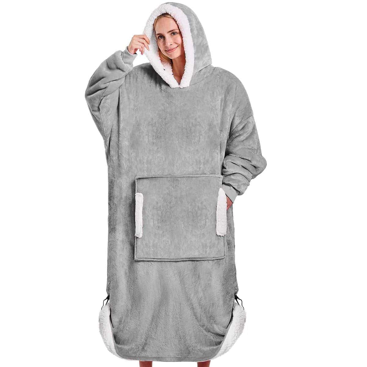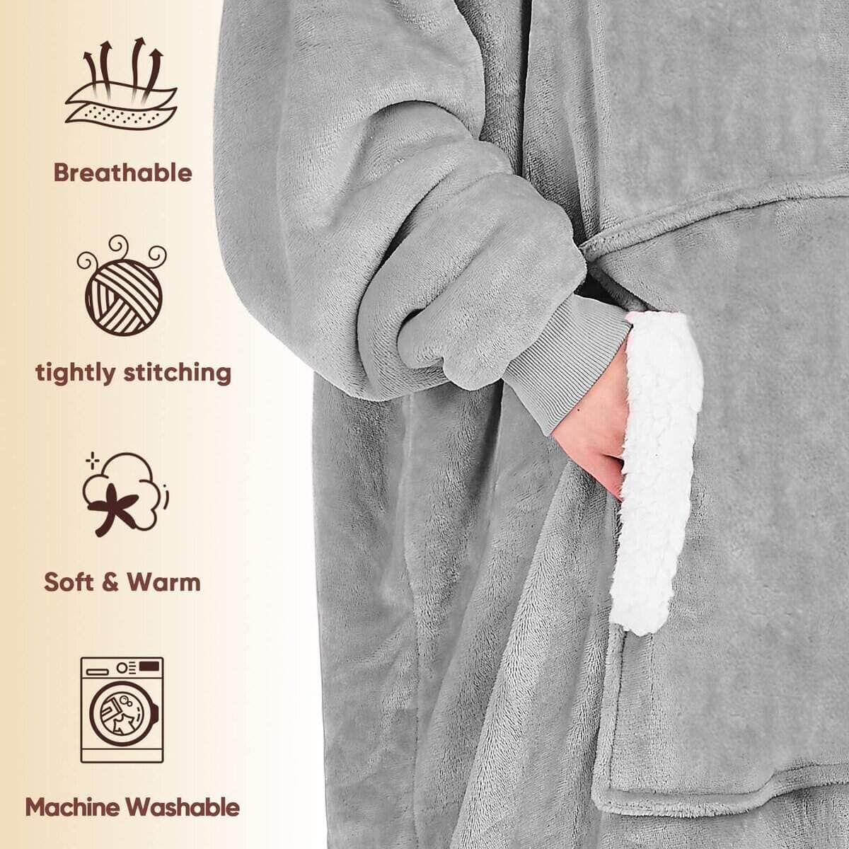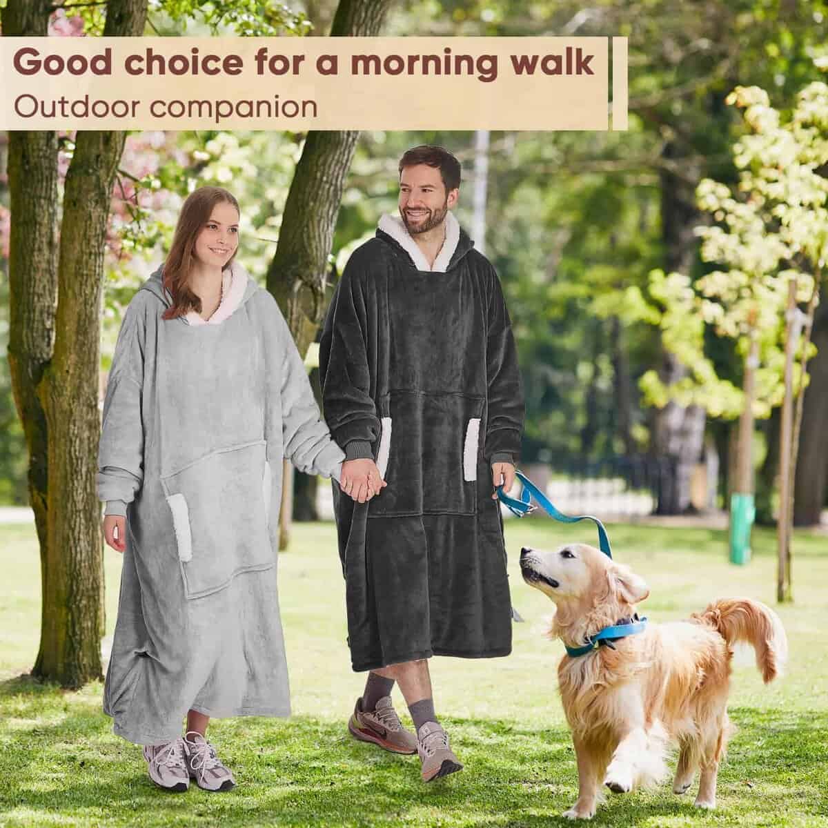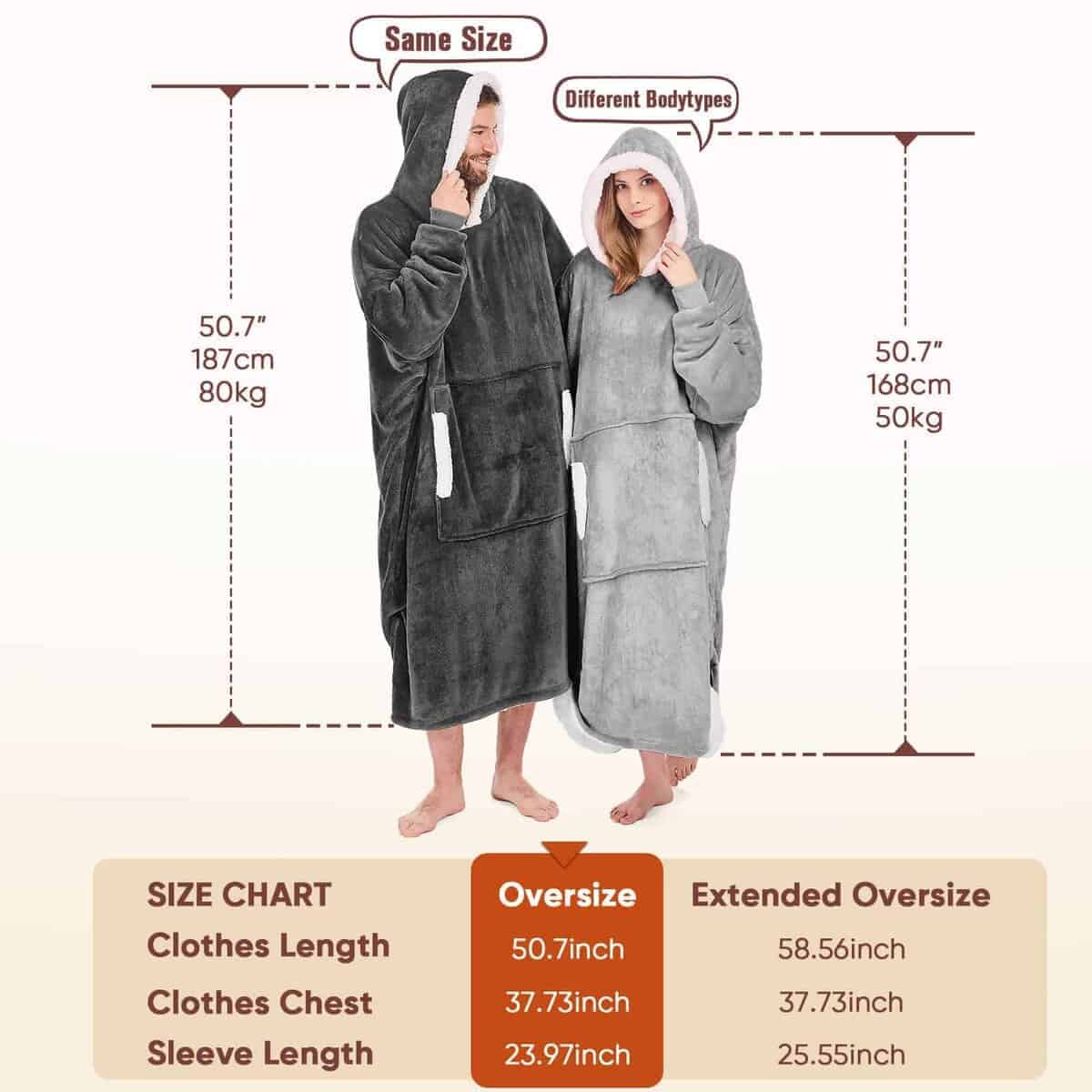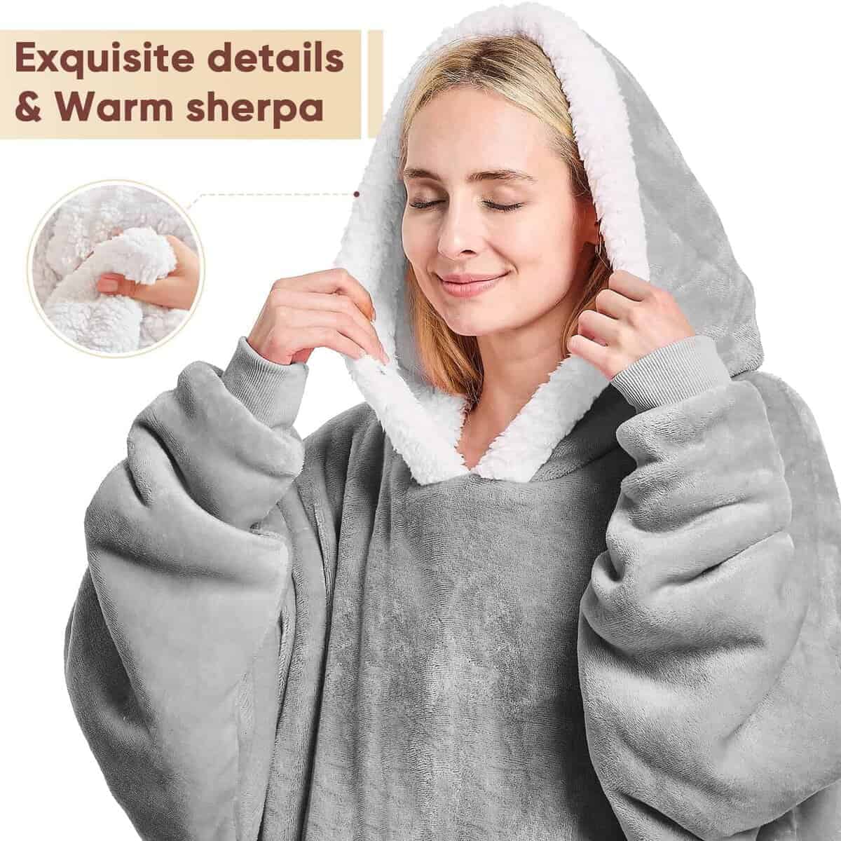 1. FÁCIL DE VESTIR Y CÁLIDA SUDADERA: ¿Estás cansado de ponerte varias capas de ropa en una mañana de invierno? ¿Te quejas a tus amigos de que el frío te impide levantarte temprano? La manta con capucha extragrande que te permite vestirte rápidamente y calienta tu cuerpo en segundos te dará la respuesta. La sudadera con capucha y manta con forro de franela te brinda un tacto suave, la manta con forro sherpa de 200 GSM es lo suficientemente cálida como para ayudarte a pasar el clima frío.