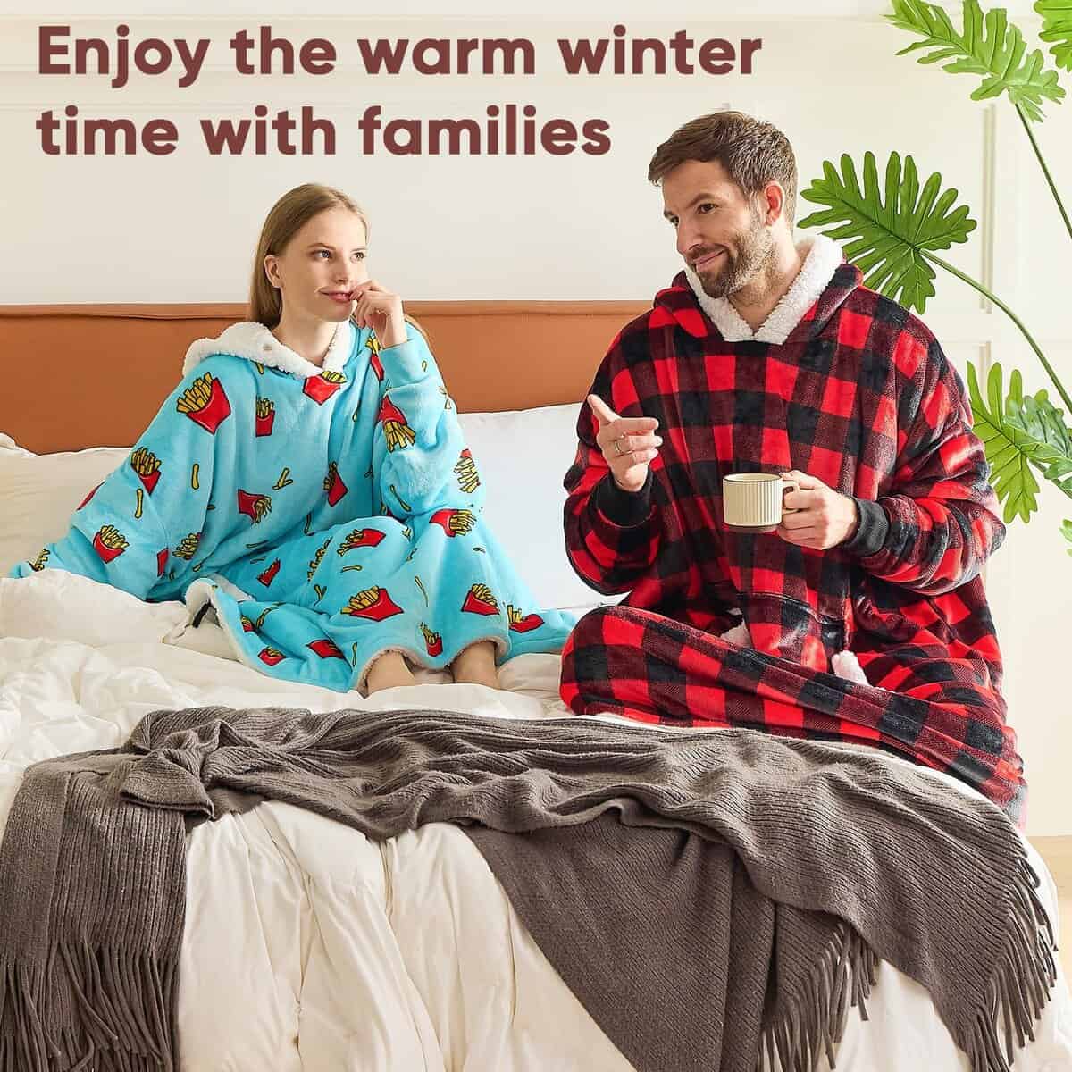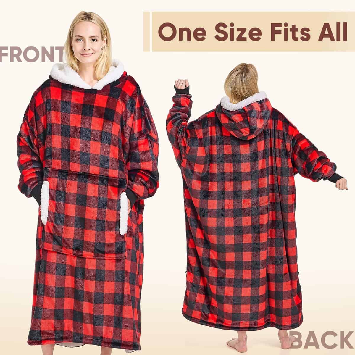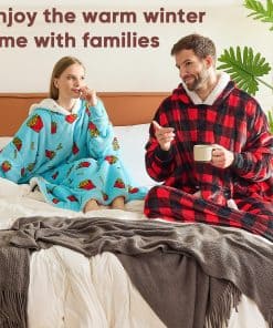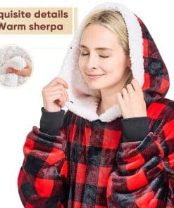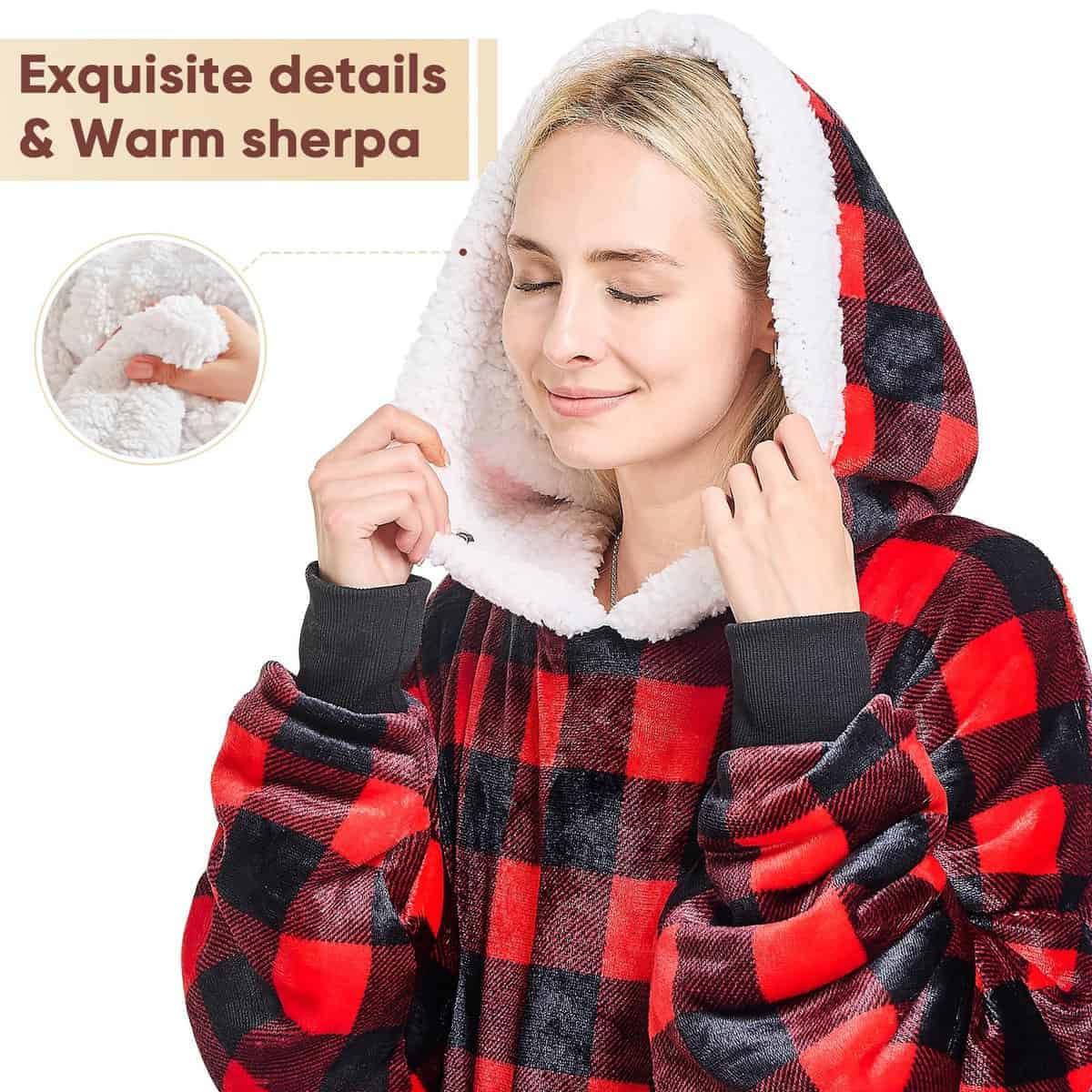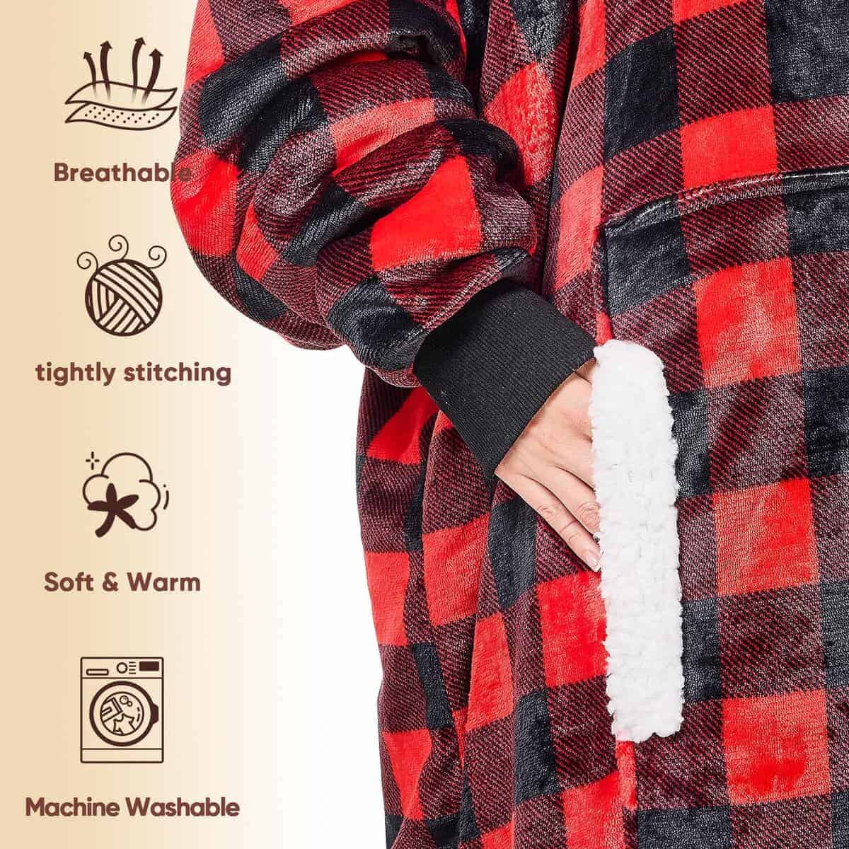 1. SUDADERA CÁLIDA FÁCIL DE VESTIR: ¿Estás cansado de ponerte múltiples capas de ropa en una mañana de invierno? ¿Te quejas a tus amigos de que el frío no te deja levantarte temprano? La sudadera con manta de gran tamaño que te permite vestirte rápidamente y calienta tu cuerpo en varios segundos te dará la respuesta. La sudadera con manta de franela te brinda un tacto suave, el forro de sherpa de 200 GSM calienta lo suficiente como para ser un edredón calefactor en movimiento para ayudarte a sobrellevar el clima frío.