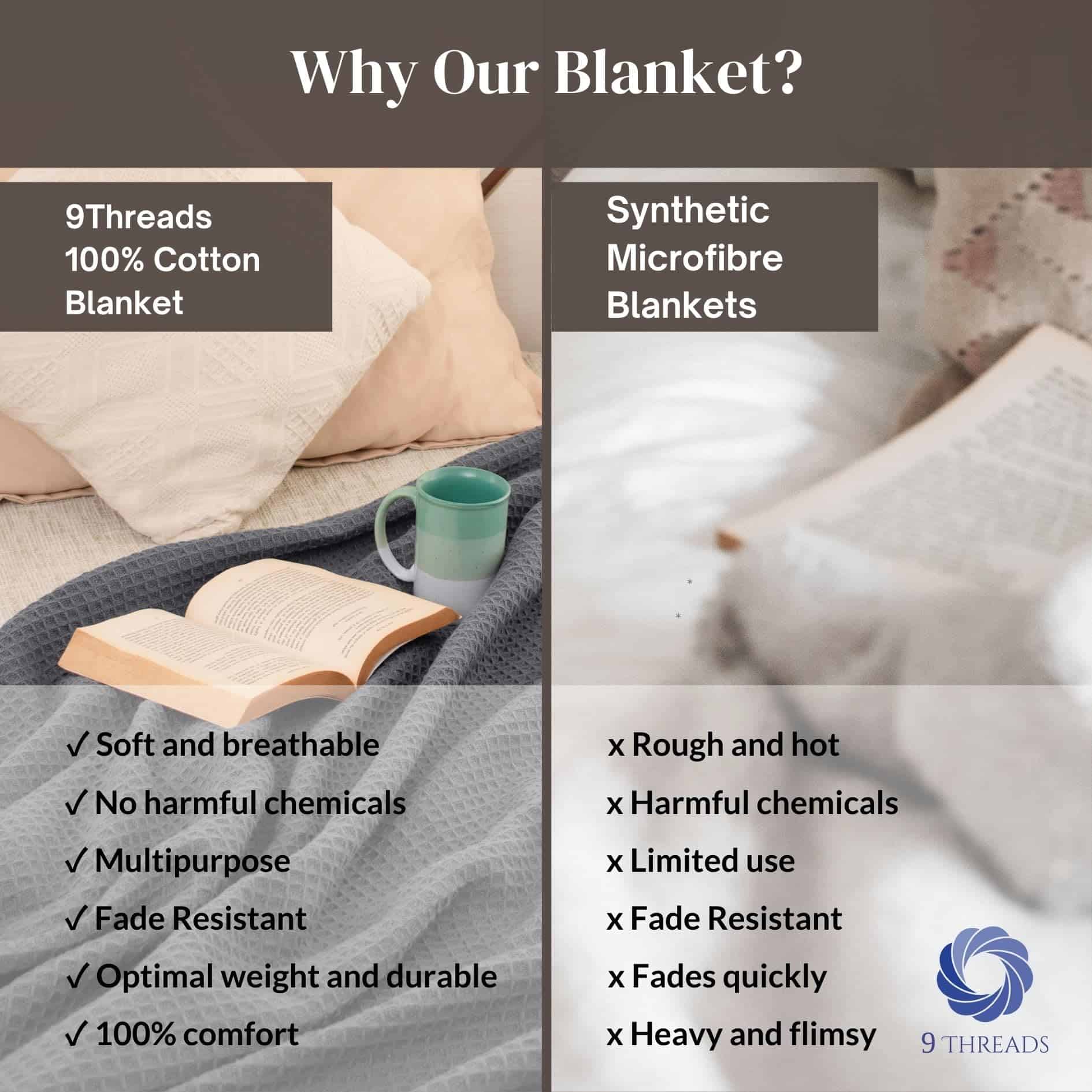 1. Manta ligera de algodón 100%: Hecha de algodón premium y transpirable para mayor comodidad durante todo el año. Perfecta como manta de verano o para colocar encima en invierno sin pasar calor.