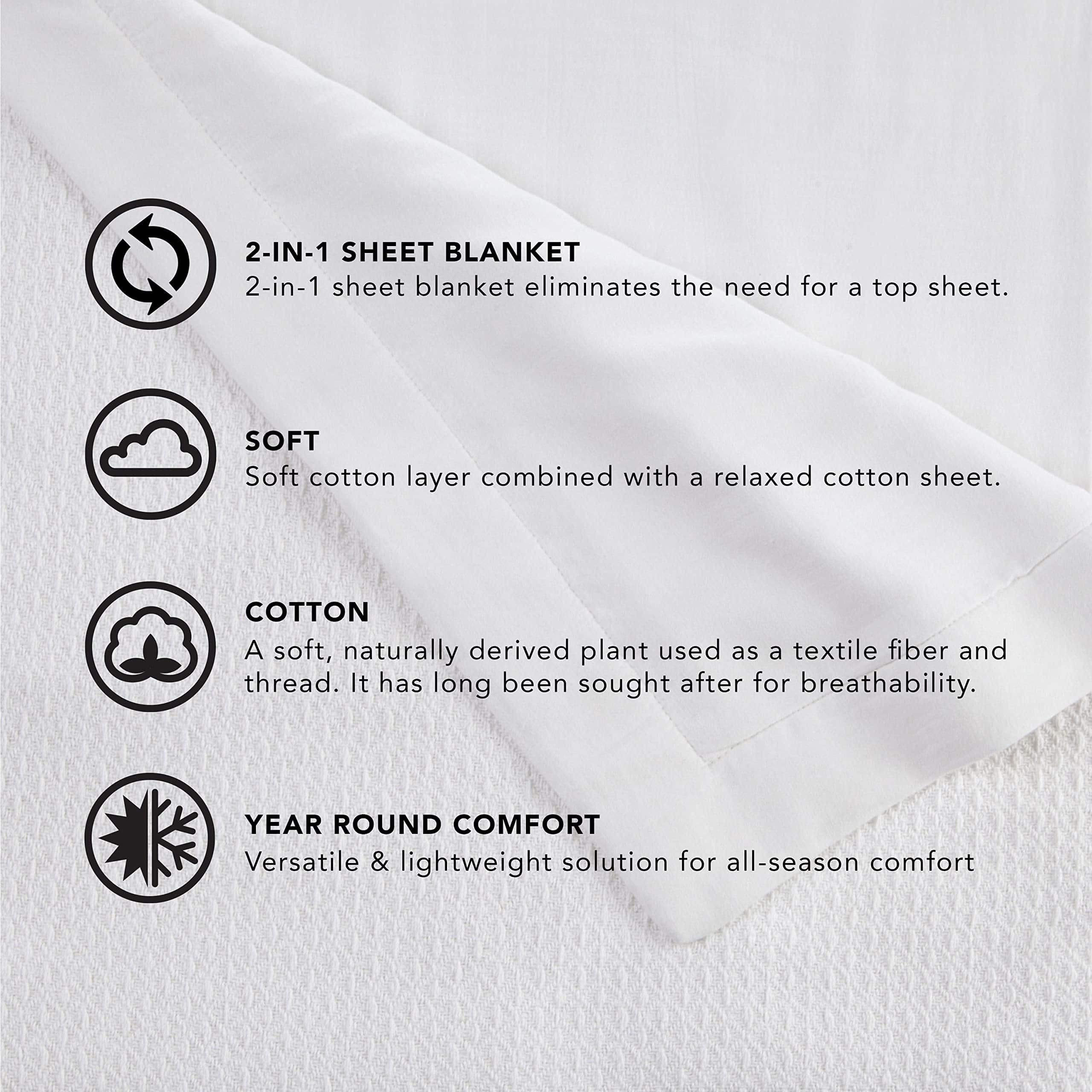 Disfruta de la conveniencia de una sábana súper suave combinada con una manta. La Manta de Sábana Vellux es versátil y ofrece una cobertura liviana para aquellos que prefieren dormir sin sábana superior. Úsala como capa adicional en tu cama, o úsala en lugar de un edredón durante los meses más cálidos. Hecha con tela de algodón 100% y bordeada con 2 de ribete tejido satinado, esta manta de sábana es convenientemente lavable a máquina y está disponible en una gama versátil de colores: Blanco, Gris Claro, Azul Claro, Gris Carbón y Beige. Algodón 100% Individual Mide 60 W x 90 L Completo/Queen Mide 90 W x 90 L Rey Mide 90 W x 108 L