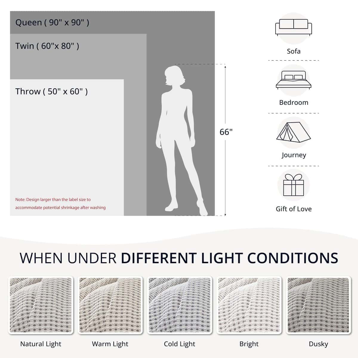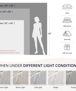 2. Garantía de calidad: La manta de gofre está elaborada con tela teñida que no se desvanece. Su tejido de tela de gofre Jacquard cuenta con dobladillos reforzados en todos los bordes, mejorando la durabilidad y previniendo enganches. Nota: Debido a que el algodón tiende a encogerse naturalmente, la manta está diseñada ligeramente más grande que el tamaño etiquetado para acomodar posibles encogimientos tras el lavado.