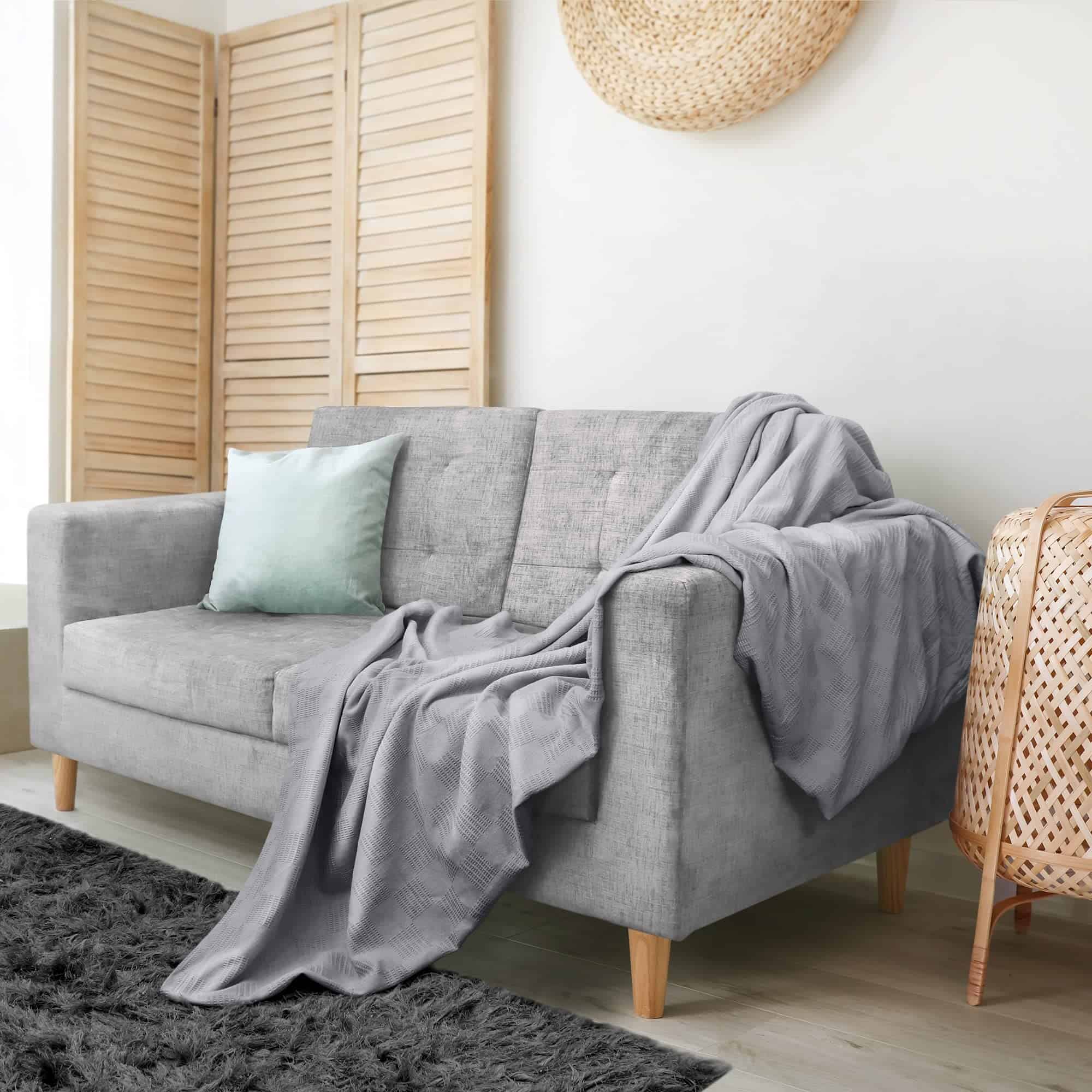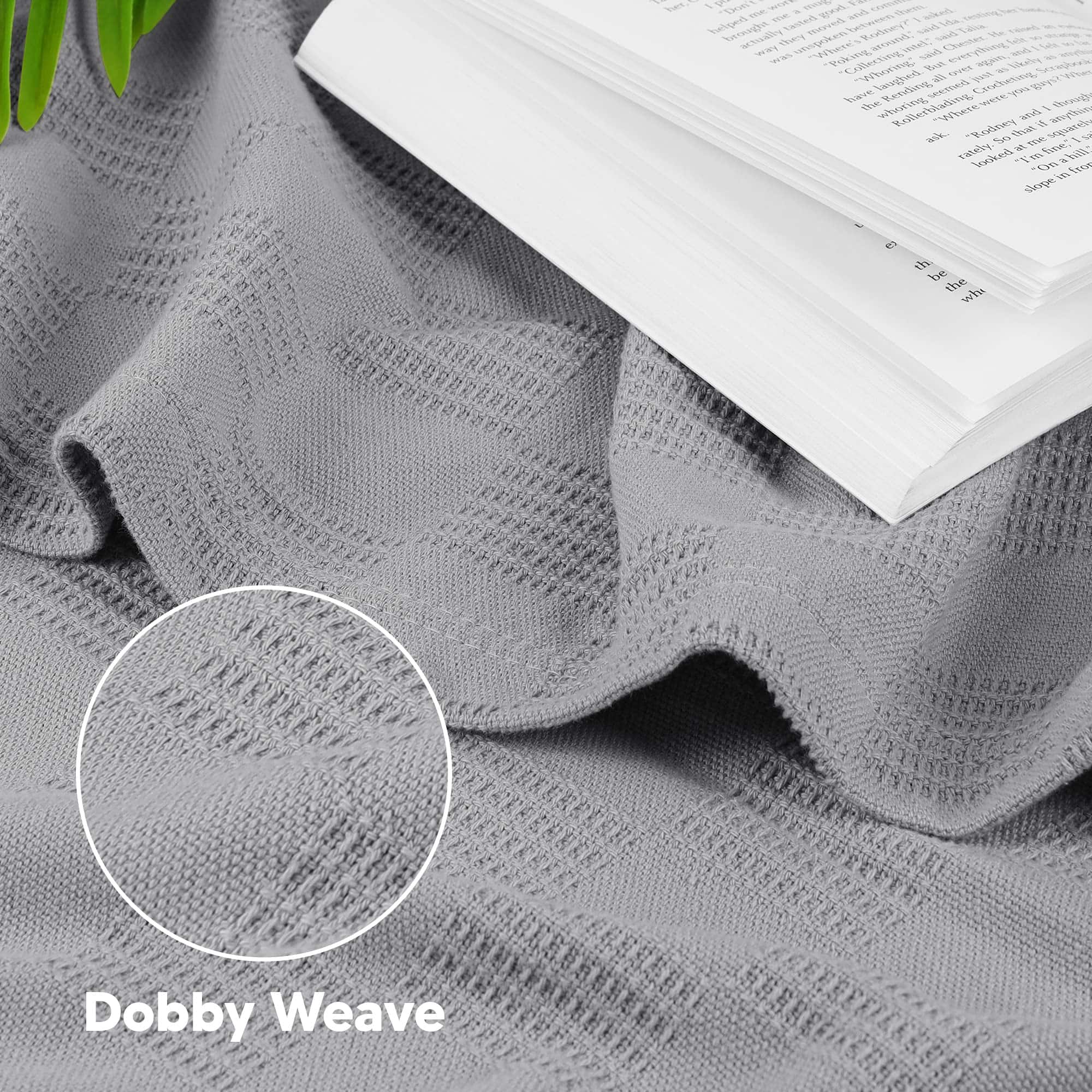 1. Tejido Dobby Una manta elegantemente diseñada que está tejida de forma ajustada para mantener todas las fibras unidas. Está flexiblemente construida con una técnica de tejido dobby y patrones de cuadrados en relieve, garantizando una textura suave y elegante. La manta es de tamaño extra grande en comparación con las normales ya que se adapta a la contracción natural del algodón con el tiempo.