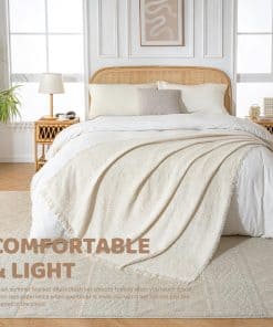 4. USO TODO EL AÑO – Nuestra manta ligera para cama como elemento esencial en ropa de cama está diseñada para ser utilizada durante todo el año. 1.9 libras, 58″x 85″(incluyendo borlas), grande para adultos y con un volumen pequeño plegado. Puedes enrollarla fácilmente y llevarla a cualquier parte.
