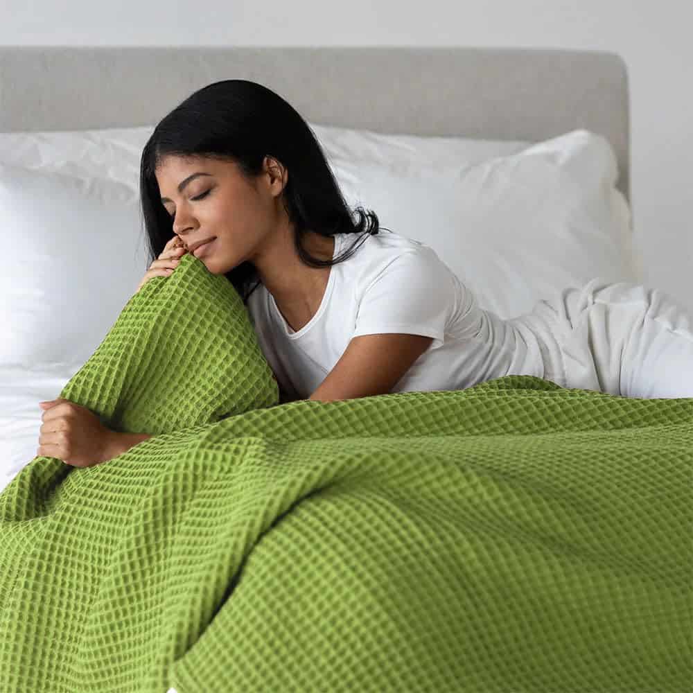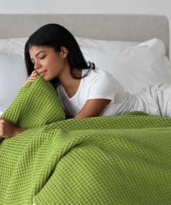 4. Manta de gofre versátil: Ya sea colocada sobre su cama o acurrucada en el sofá, nuestra suave manta tejida de gofre ofrece confort durante todo el año, convirtiéndola en una adición imprescindible a su colección de ropa de cama.