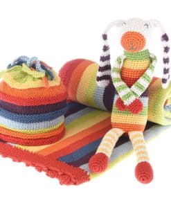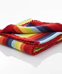 MANTA DE RAYAS ARCO IRIS de PEBBLE Las rayas tejidas que componen esta manta tienen colores brillantes del arco iris delineados por un encantador borde de crochet rojo. Hecha a mano con 100% Algodón, esta manta de calidad es suave al tacto y perfecta para la piel sensible del bebé. Puede ser utilizada como manta de envolver para recién nacidos o como manta para dormir para un bebé más grande. Seguro que su bebé será notado, envuelto en esta hermosa obra de arte. ¡Un regalo perfecto para un bebé arco iris! Pebble «Poniendo sonrisas en rostros de todo el mundo!»