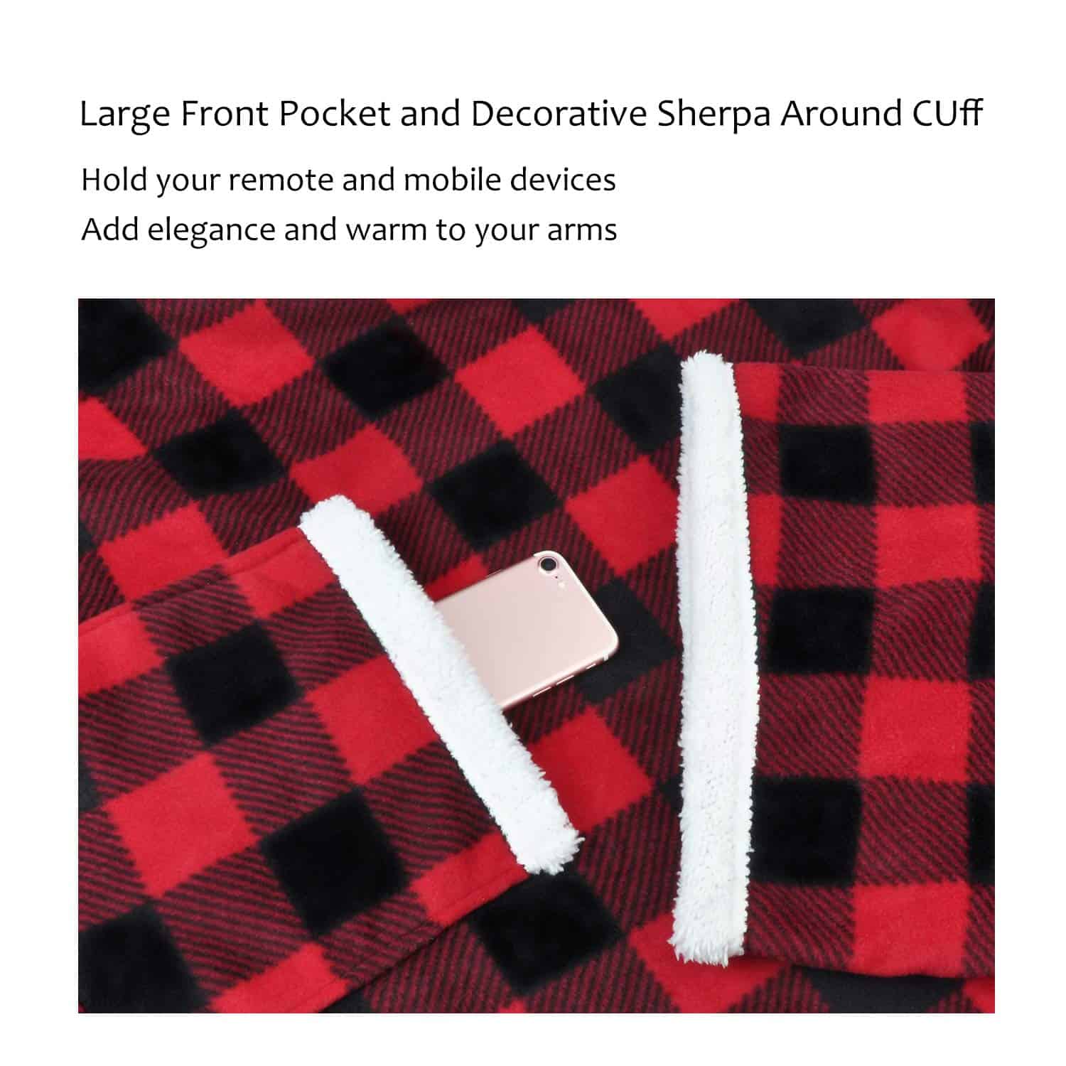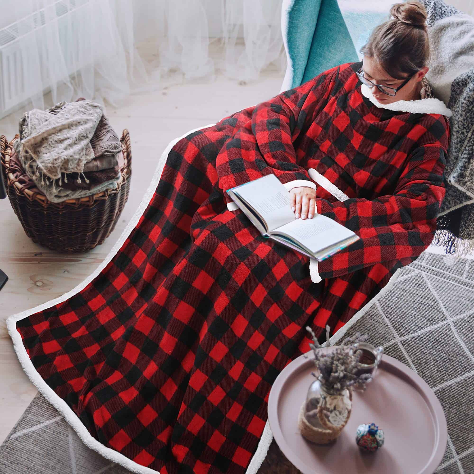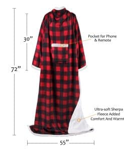 1. Manta de felpa sherpa con mangas: Manta sherpa con mangas súper suave ideal para mantenerte cálido y acogedor. Suficientemente grande para mantener las manos libres para trabajar en casa, ver TV, leer un libro, hablar por teléfono, comer un aperitivo en el sofá o la cama.