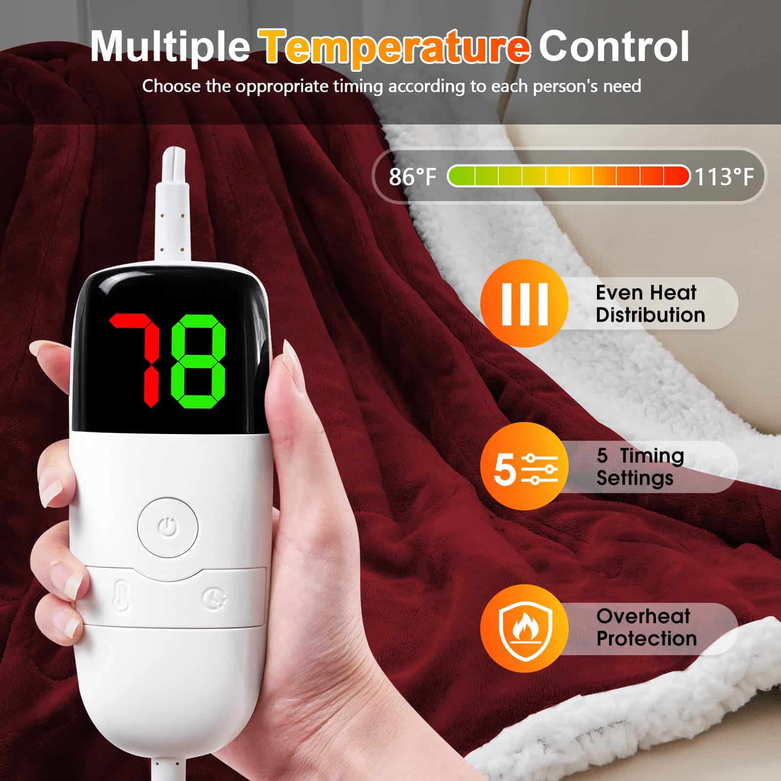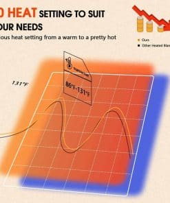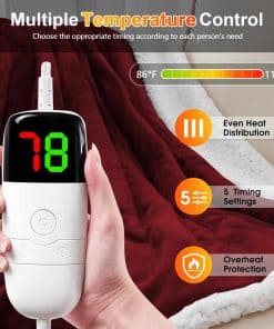 2. Seguro y Confiable – 10 niveles de calefacción para diferentes necesidades de las personas. La manta calefactora tiene la certificación de autoridad ETL y la certificación FCC, y cuenta con la función de protección contra sobrecalentamiento. Cuando estés ocupado con otras cosas y olvides apagar la manta eléctrica, la protección contra sobrecalentamiento activará automáticamente el apagado automático de la calefacción, evitando el peligro de incendio, para proteger la seguridad tuya y de tu familia.