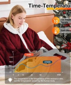4. Abraza el Calor y la Comodidad – Esta manta calefactable con capucha te ofrece el doble de calor con su diseño de doble cara suave. Un lado es franela amigable con la piel, el otro lado es tela Sherpa cálida, asegurando que te mantengas caliente incluso en la silla de oficina fría. Las costuras cuidadosas hacen que cada costura sea fuerte y duradera, y resistirá la prueba del tiempo. Además, es lavable a máquina y utiliza tecnología de teñido avanzada, por lo que no tienes que preocuparte por la decoloración del color. Cuidado fácil, duradero como nuevo.